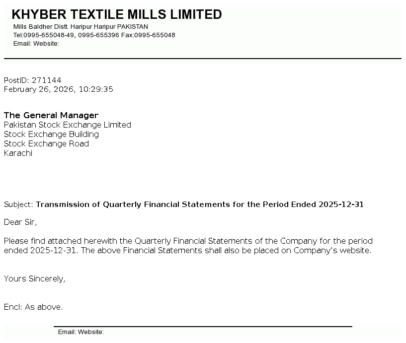 Khyber Textile Mills Limited is a Public Limited Company, incorporated on 26th August, 1961 under the Companies Act, 1913 (Now the Companies Act, 2017). The activities of the Company were the manufacture and sale of cotton/polyester yarn and cloth, however due to external factors production was halted. Consequently, the Company has been operating an agricultural livestock business on its vacant land since 2017, as a revised principal line of business of the Company, that is agricultural, which was approved by the Registrar of Companies in September 2019. It has also been carrying out alternative business activities of renting excess buildings for warehousing and rental purposes since 2016.