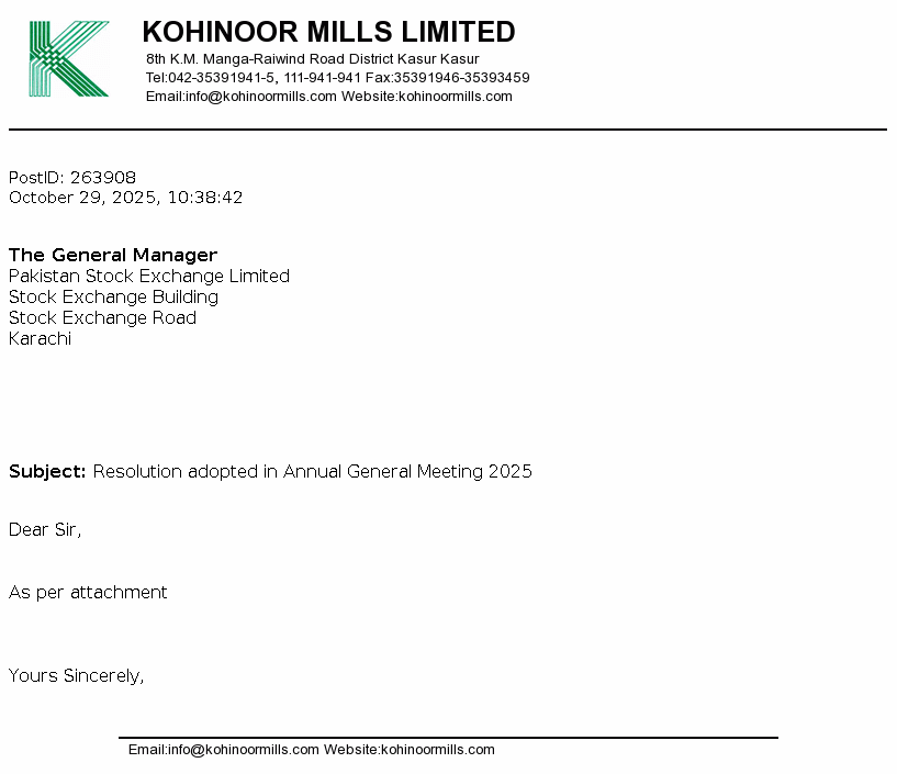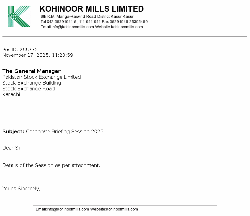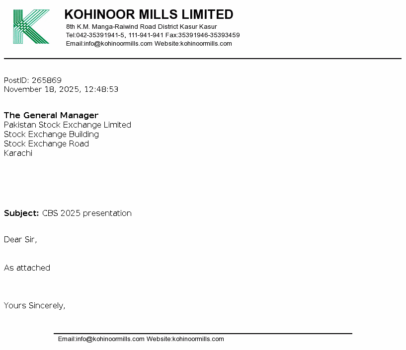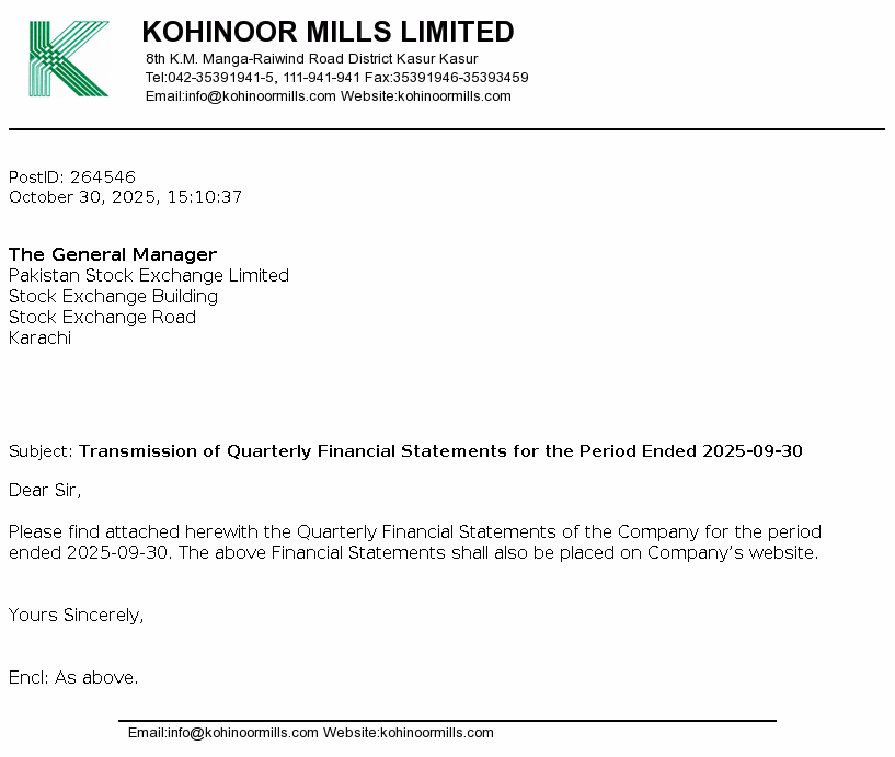 Kohinoor Mills Limited is a public limited company incorporated on 21 December 1987 in Pakistan under the Companies Ordinance, 1984 (Now Companies Act, 2017). The Company is principally engaged in the business of textile manufacturing covering weaving, bleaching, dyeing, buying, selling and otherwise dealing in yarn, cloth and other goods and fabrics made from raw cotton and synthetic fiber and to generate, and supply electricity