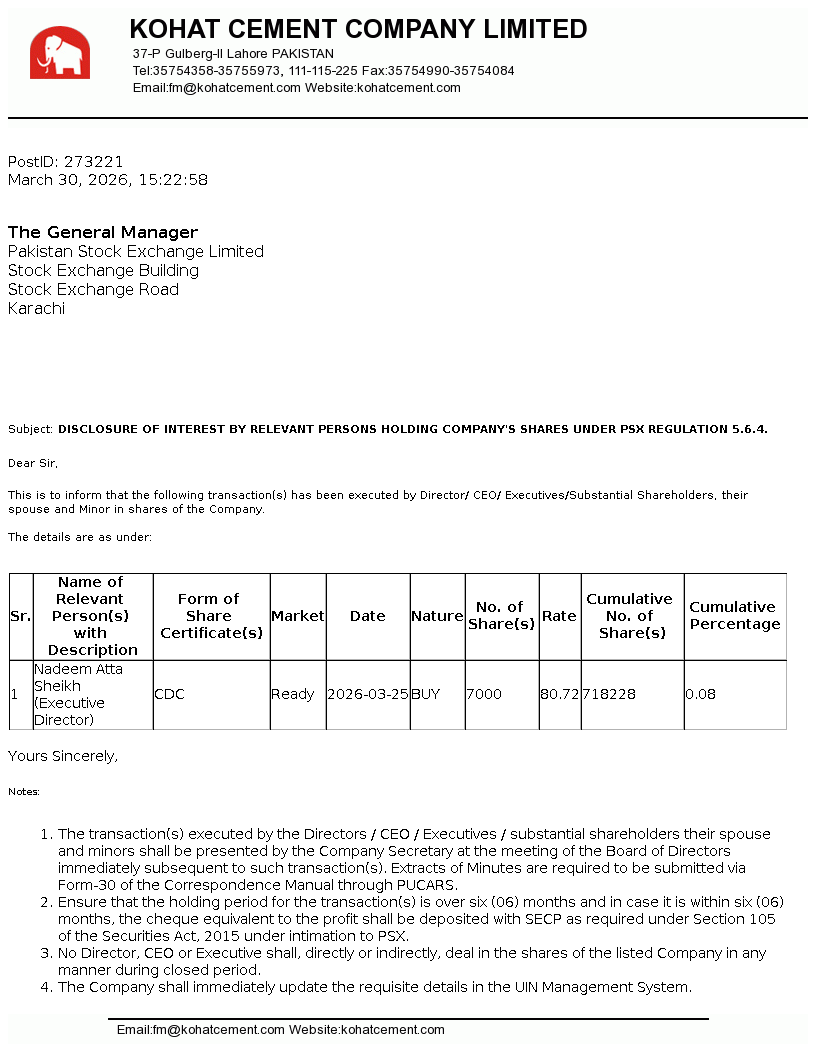 Kohat Cement Company Limited is a public limited company incorporated in Pakistan under the Companies Act, 1913. The Company is engaged in the production and sale of cement. ANS Capital (Private) Limited is the holding company of the Company.