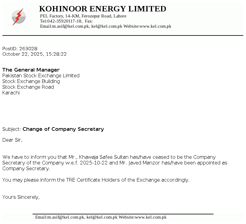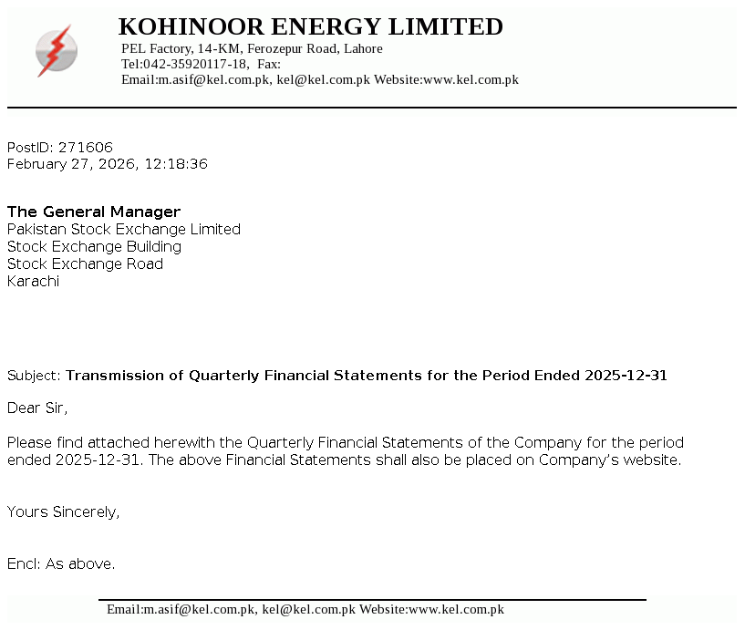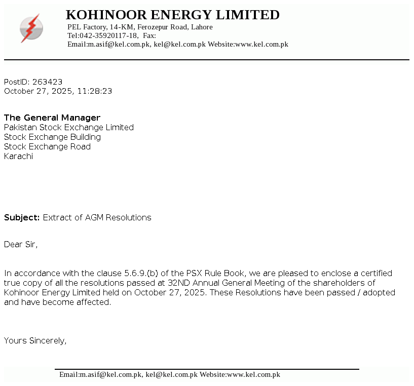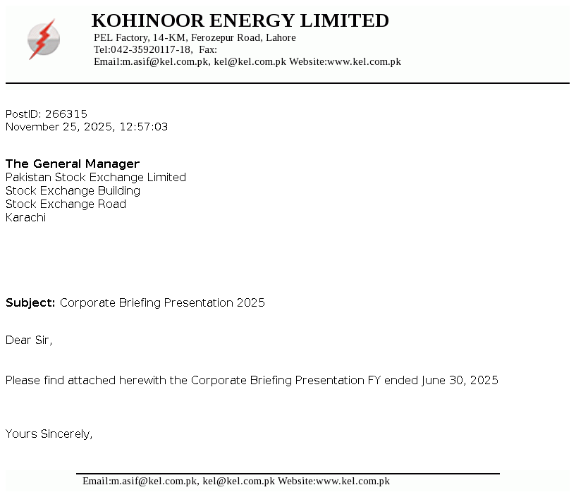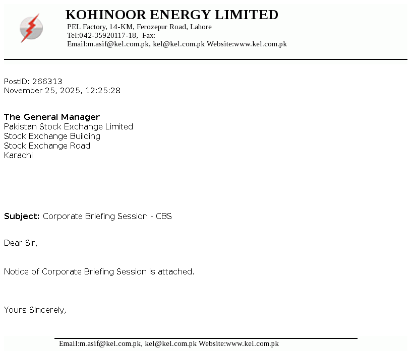 Kohinoor Energy Limited was incorporated in Pakistan on April 26, 1994 as a public limited company under the repealed Companies Ordinance, 1984. The principal activities of the Company are to own, operate and maintain a power plant in Lahore and to sell the electricity produced therefrom to a sole customer, the Pakistan Water and Power Development Authority (WAPDA) under a Power Purchase Agreement (PPA).