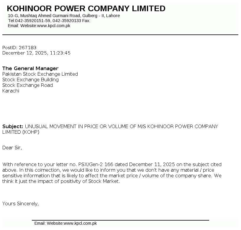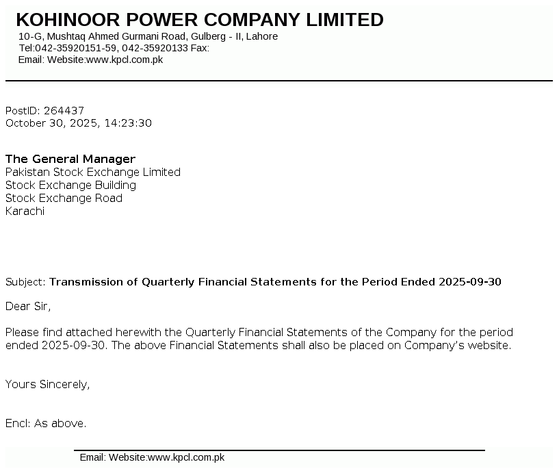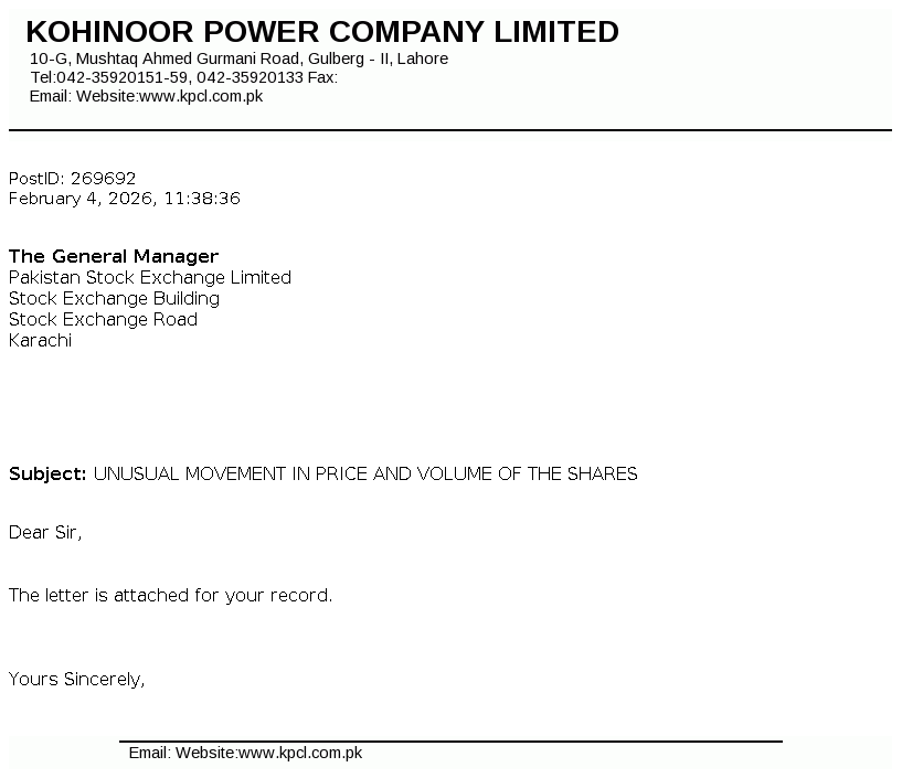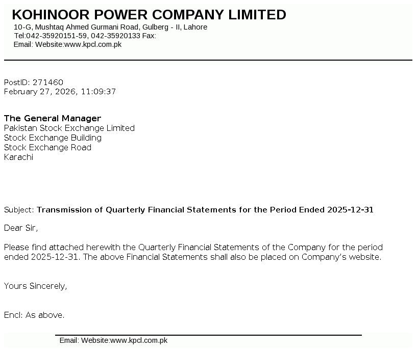 Kohinoor Power Company Limited was incorporated in Pakistan on December 08, 1991 as a private limited company and subsequently converted into public limited company on May 10, 1992. The principal activity of the company is to generate and sell electric power.