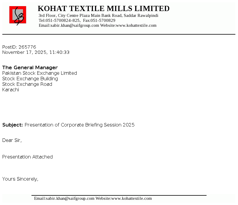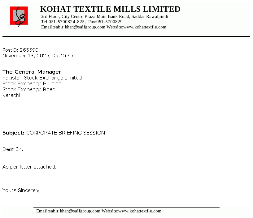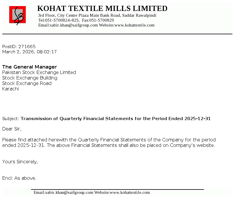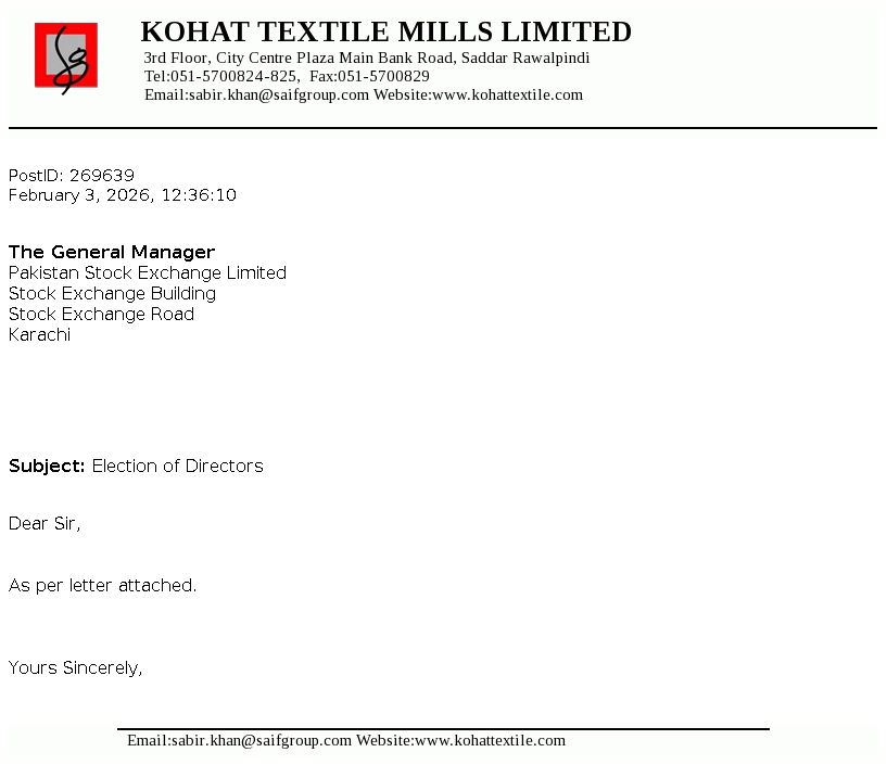 Kohat Textile Mills Limited is a public limited Company incorporated in Pakistan during the year 1967. The Company is principally engaged in manufacture and sale of yarn.