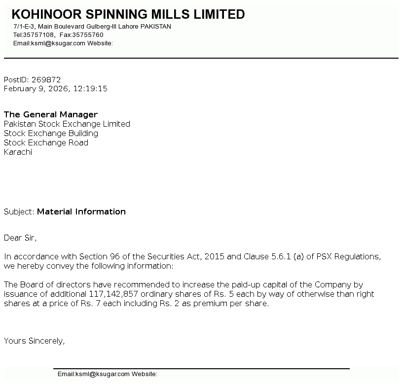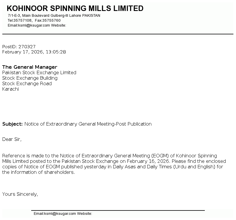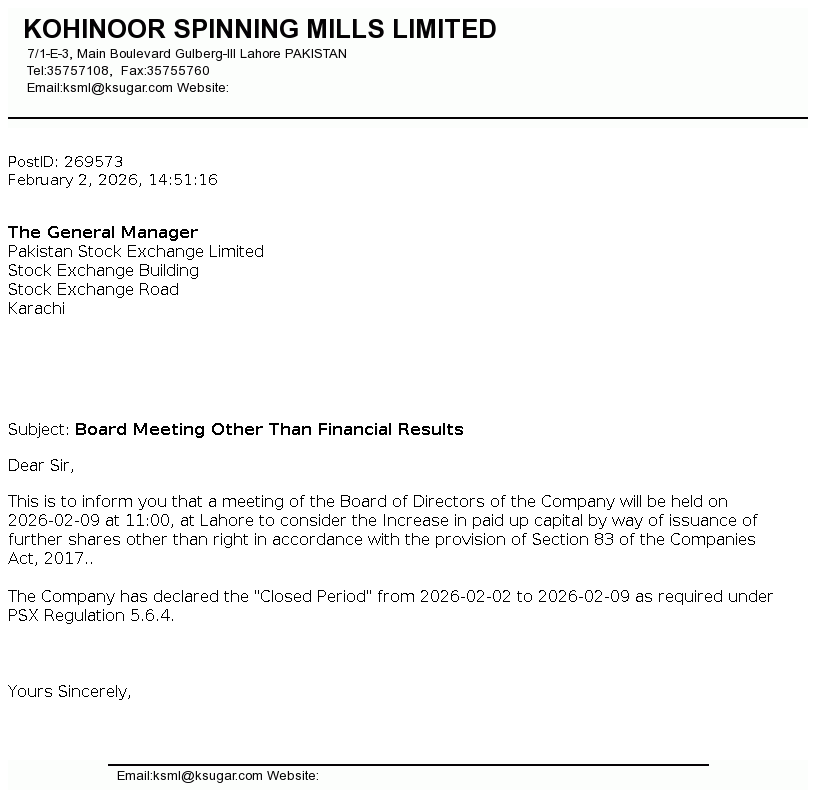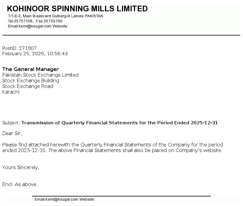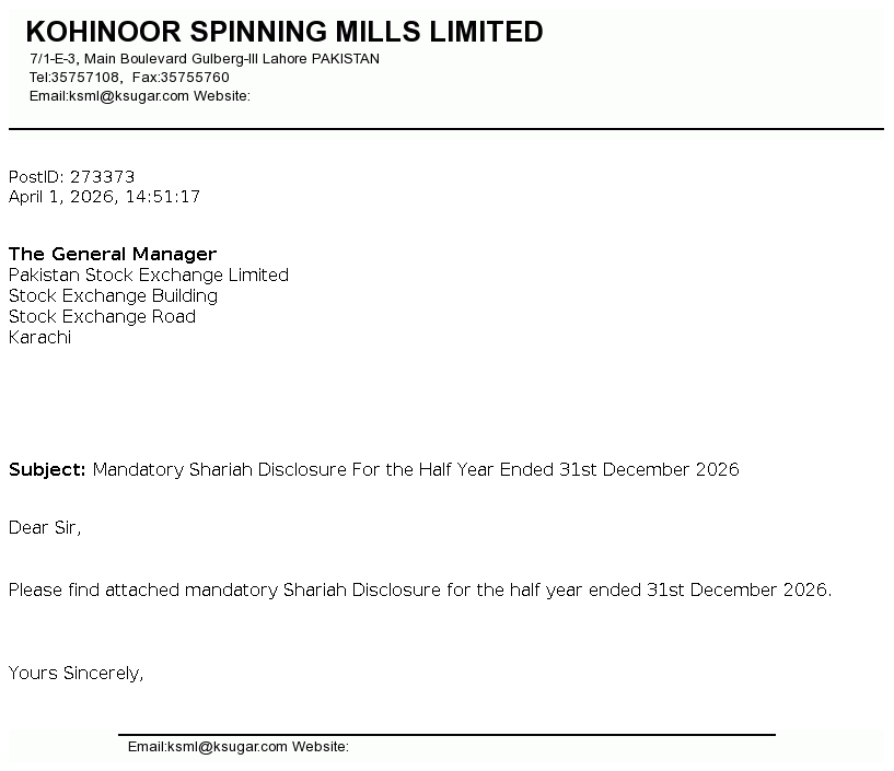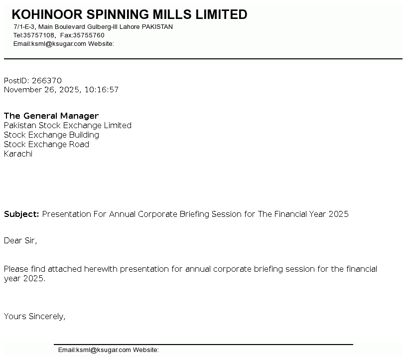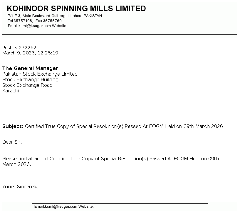 Kohinoor Spinning Mills Limited was incorporated on 23rd July, 1970 as a public limited company in Pakistan under the Companies Act, 1913 (Now Companies Act 2017). The company is engaged in the business of textile spinning.
