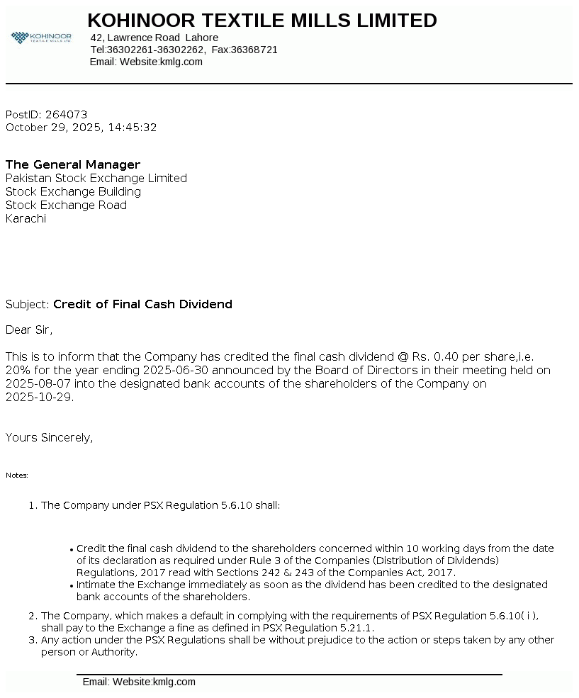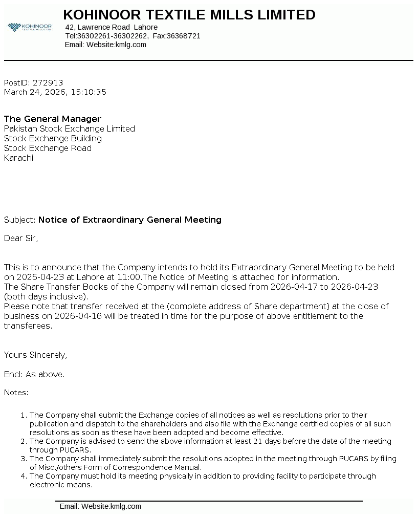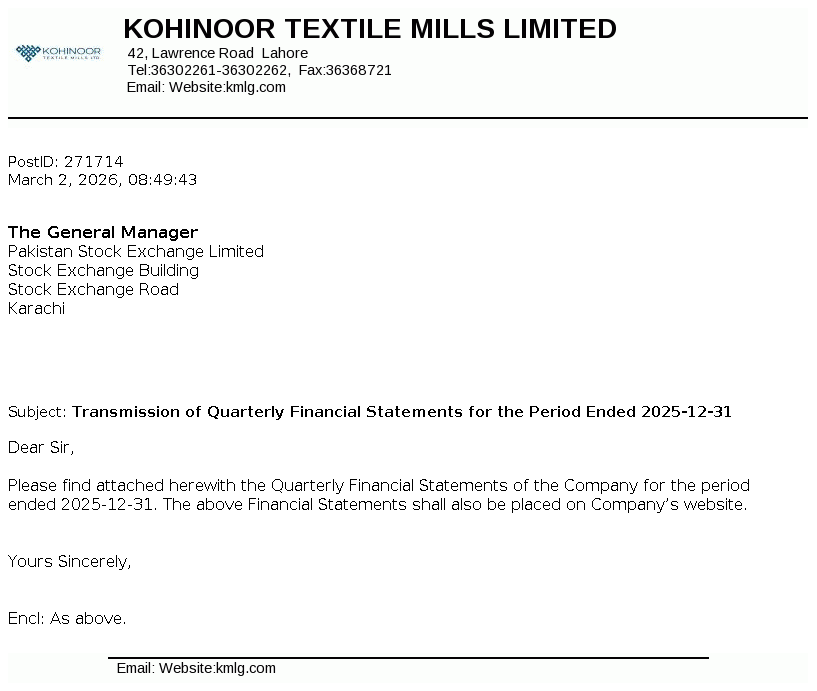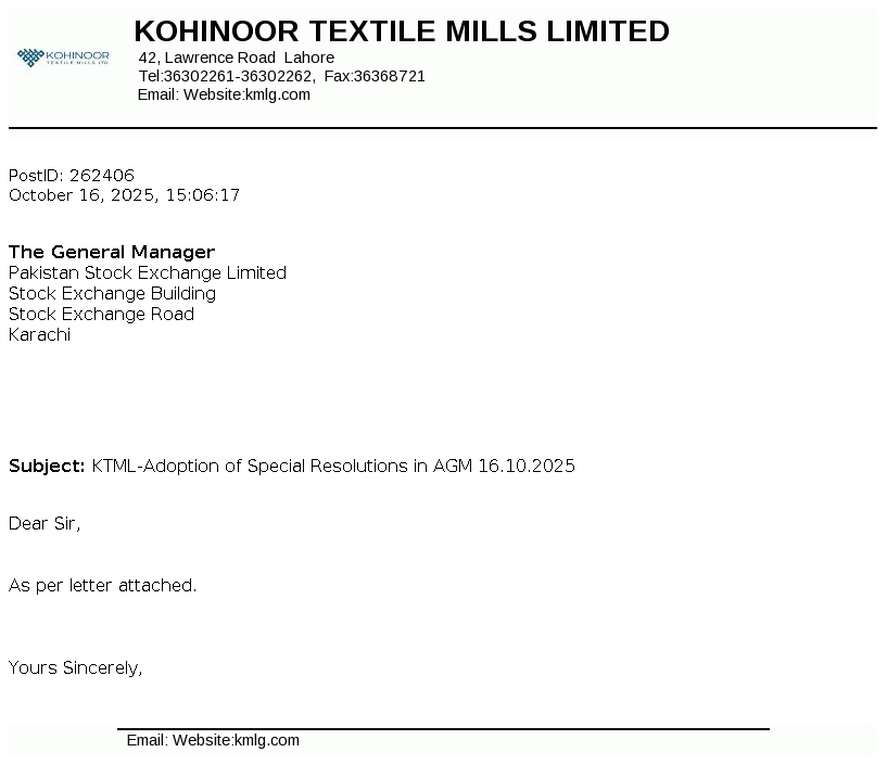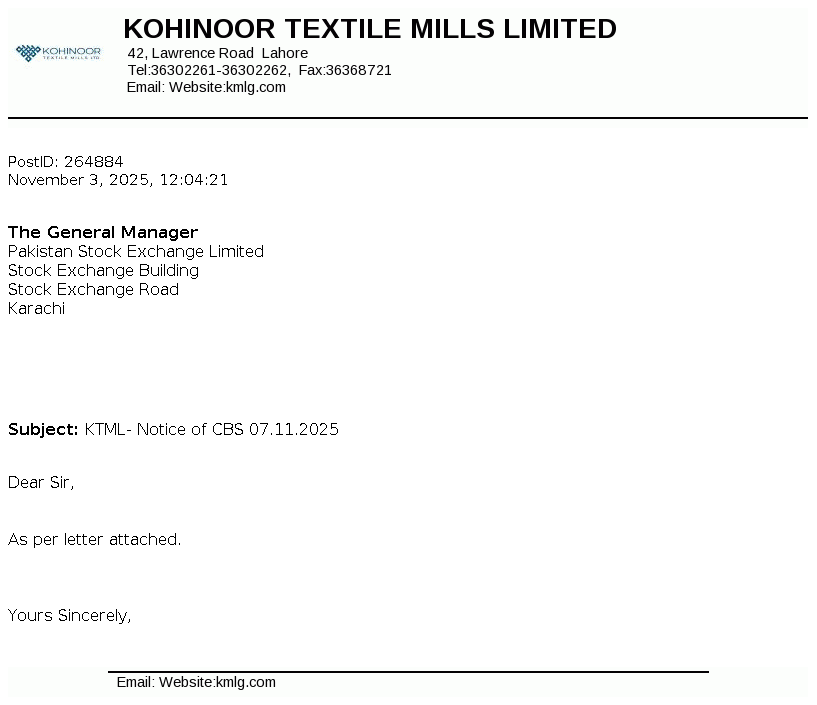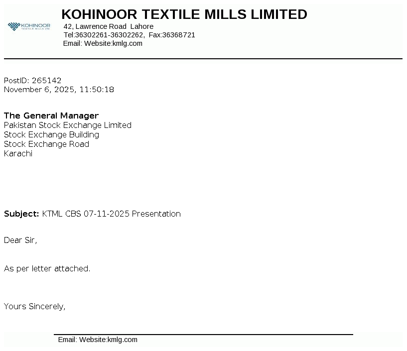 Kohinoor Textile Mills Limited is a public limited company incorporated in Pakistan under the Companies Act, 1913. The principal activity of the Company is manufacturing of yarn and cloth, processing and stitching the cloth and trade of textile products.