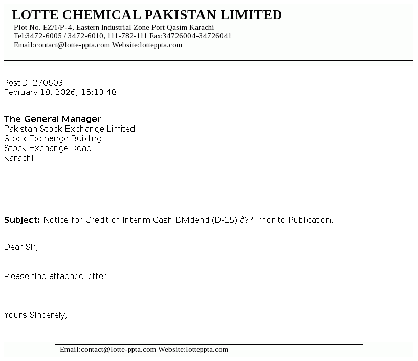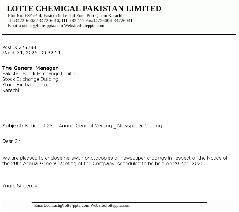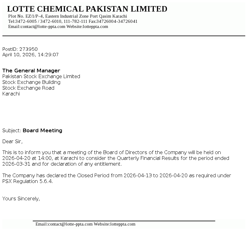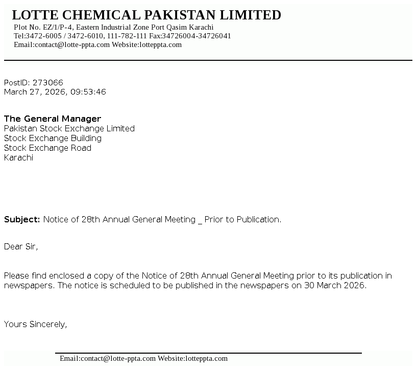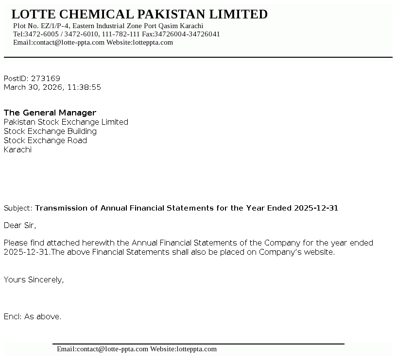 Lotte Chemical Pakistan Limited was incorporated in Pakistan on 30 May 1998 under the Companies Ordinance, 1984 ( repealed with enactment of the Companies Act, 2017). The principal activity of the Company is to manufacture and sale of Pure Terephthalic Acid (PTA).
