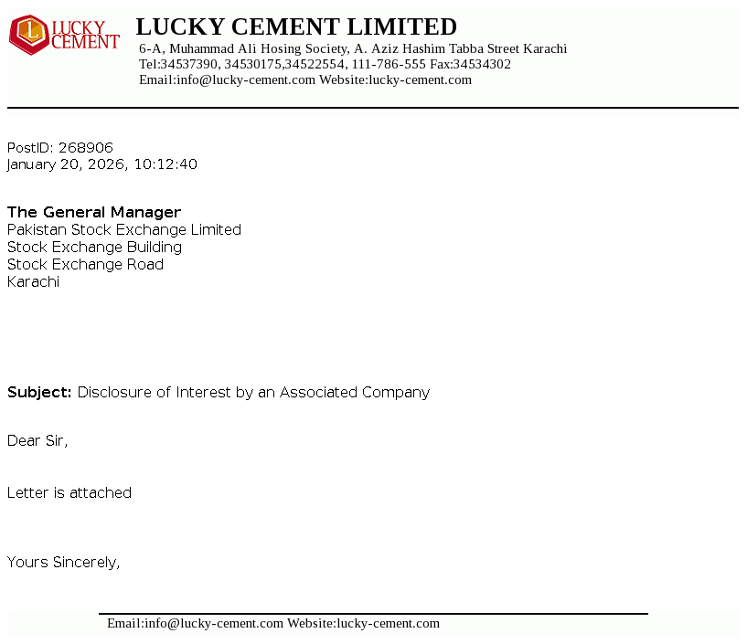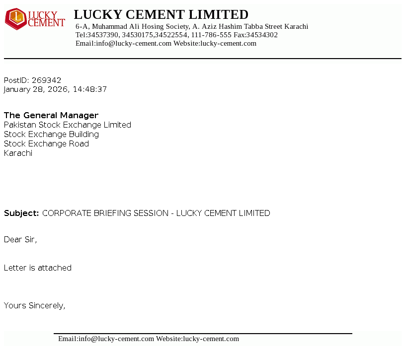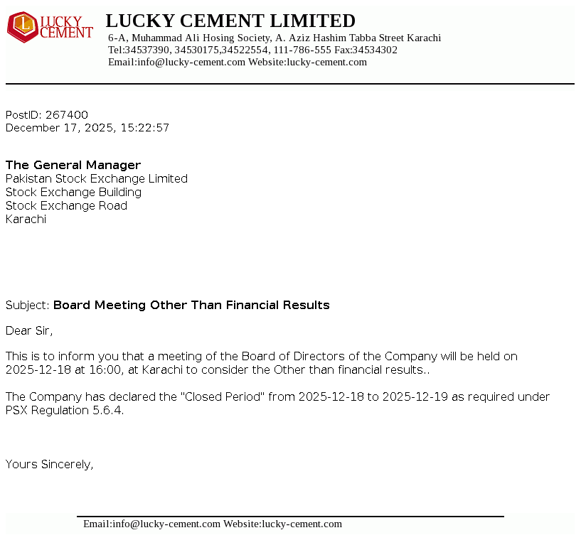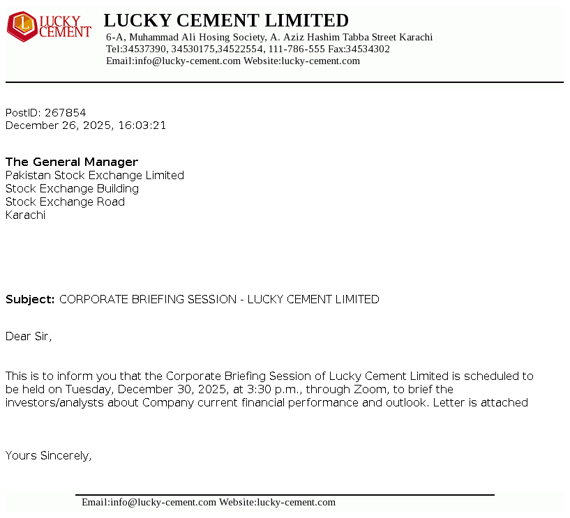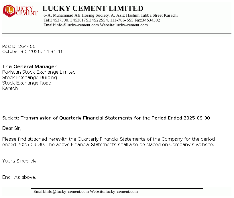 Lucky Cement Limited was incorporated in Pakistan on September 18, 1993 under the Companies Ordinance, 1984 (now the Companies Act, 2017). The principal activity of the Company is manufacturing and marketing of cement.