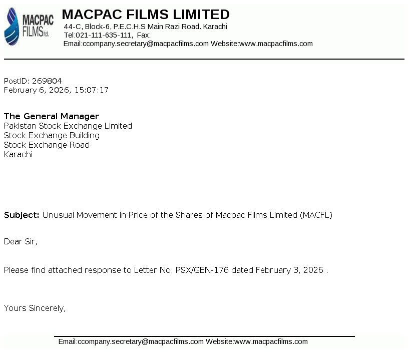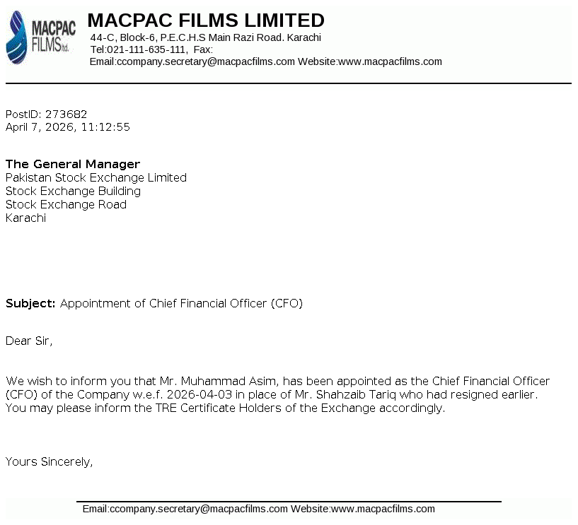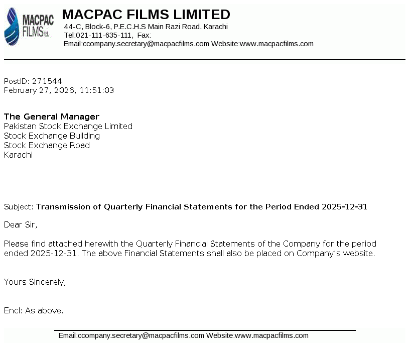 Macpac Films Limited was incorporated on August 19, 1993, in Pakistan as a limited liability company under the repealed Companies Ordinance, 1984 (Now Companies Act, 2017). The principal activity of the company is to manufacture, produce, buy and sell plastic packaging.