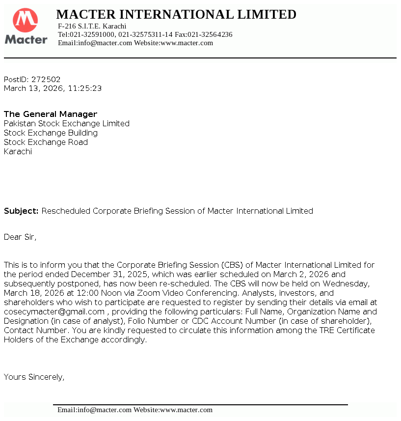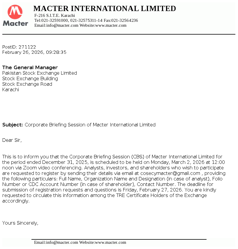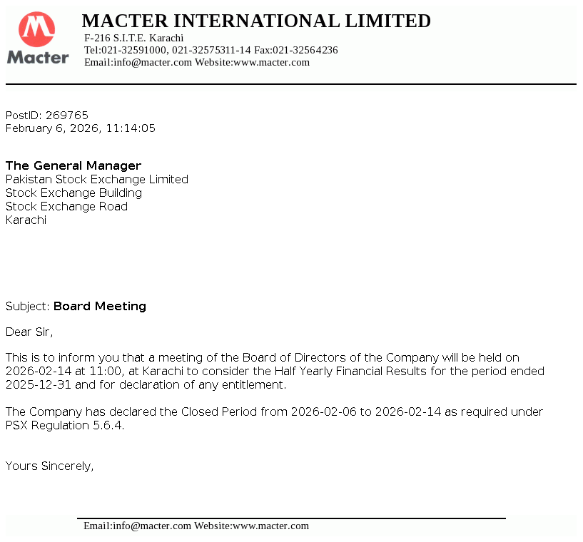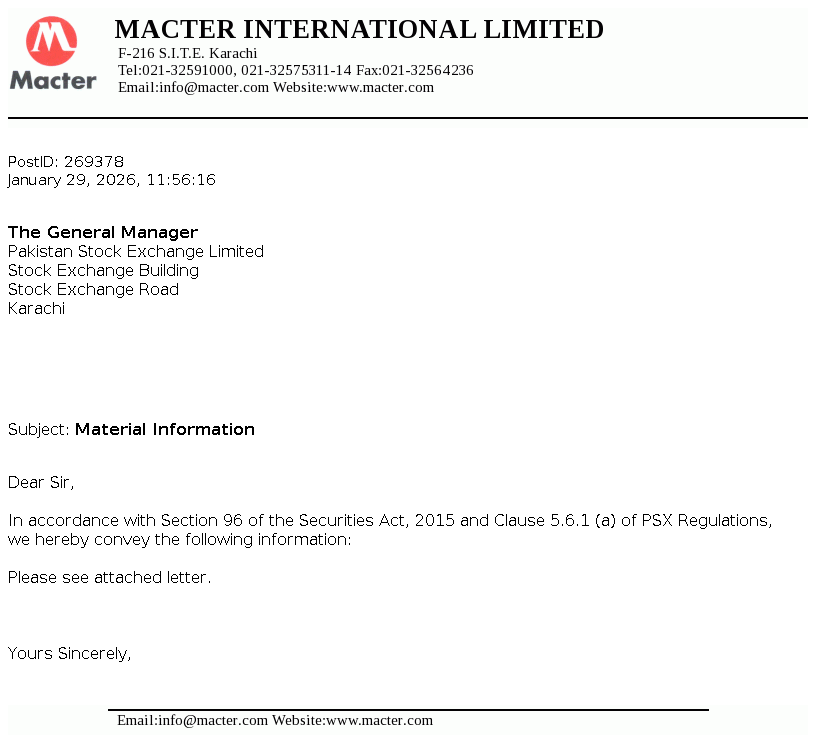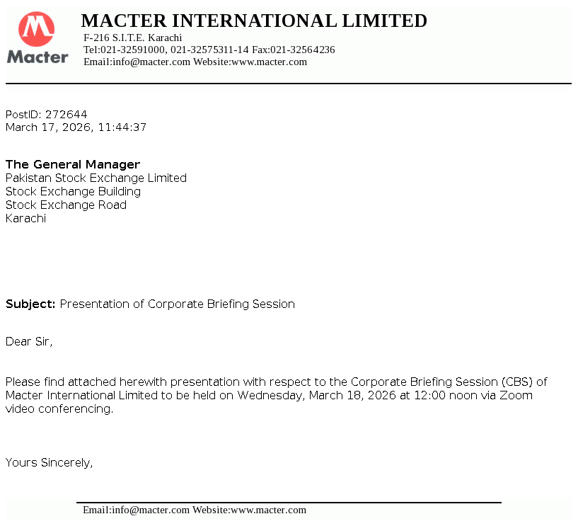 Macter International Limited was incorporated in Pakistan in 1992 as a private limited company and was converted into a public limited company in 2011. The principal activity of the company is to manufacture and market pharmaceutical products.