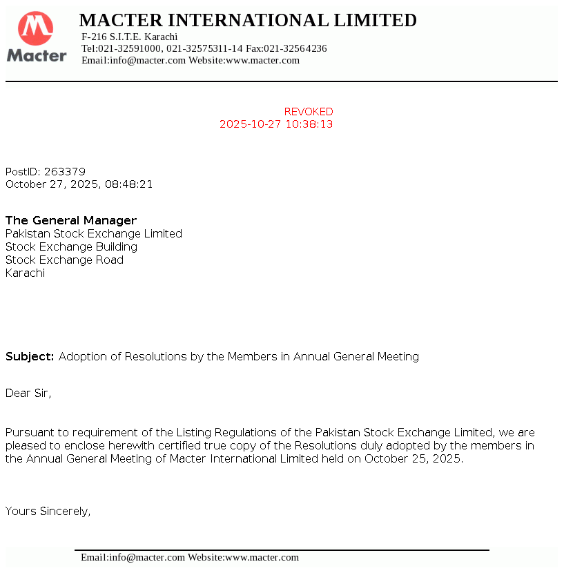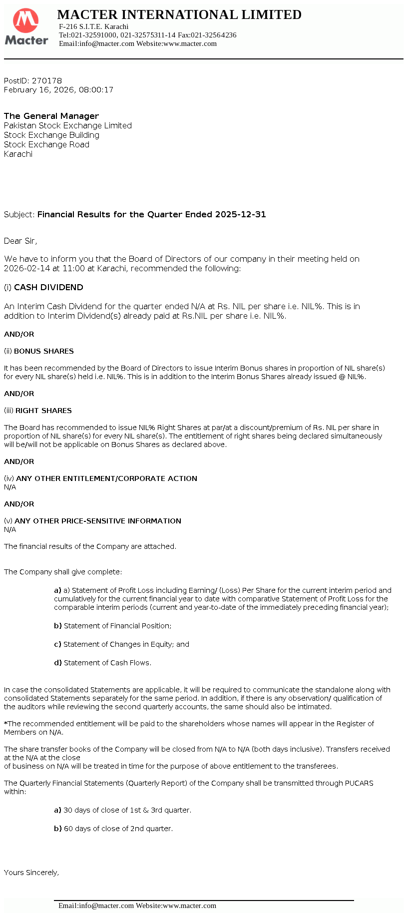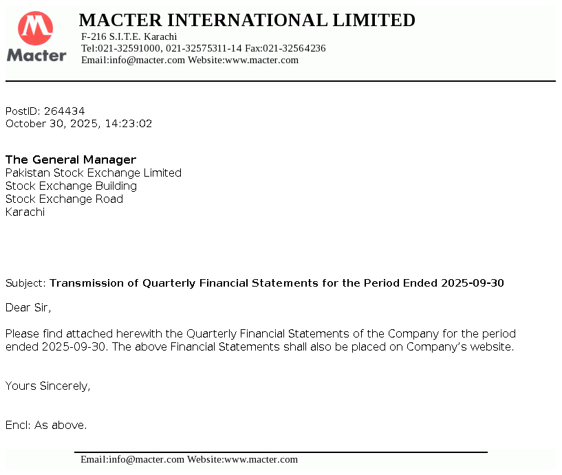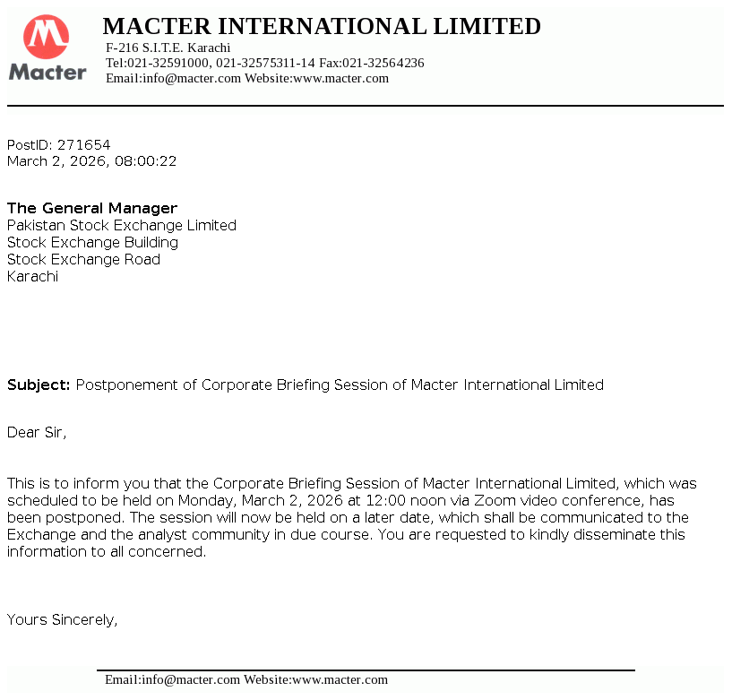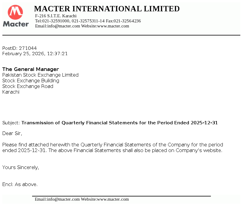 Macter International Limited was incorporated in Pakistan in 1992 as a private limited company and was converted into a public limited company in 2011. The principal activity of the company is to manufacture and market pharmaceutical products.