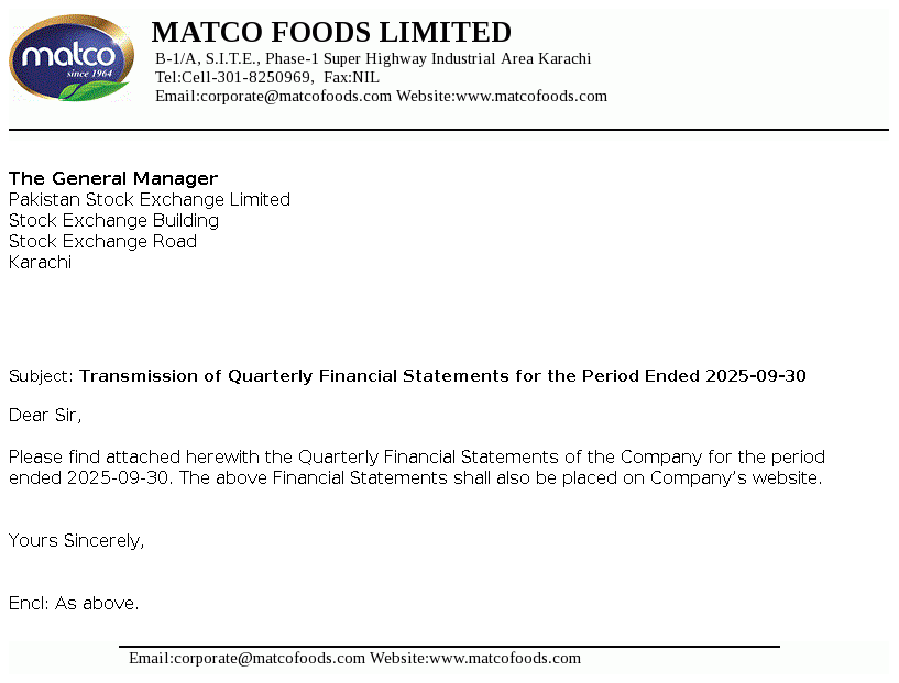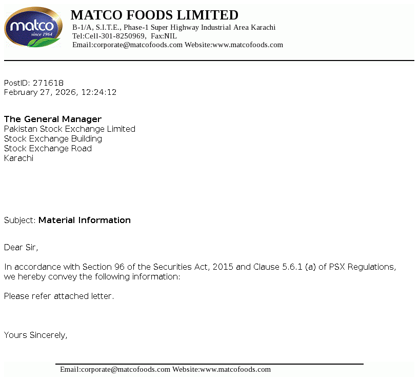 Matco Foods Limited was incorporated on April 14, 1990 in Karachi as a private limited company under the repealed Companies Ordinance, 1984 (Now Companies Act, 2017). The principal acvity of the Company is to carry out the business of processing and export of rice, rice glucose, rice protein and pink salt, masala and kheer.
