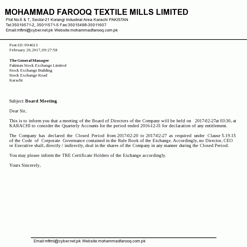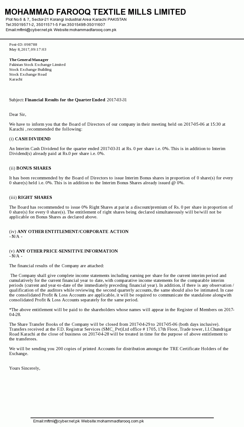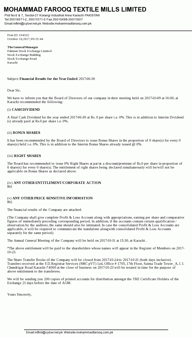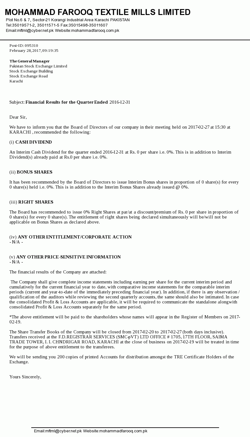 Mohammad Farooq Textile Mills Limited was incorporated in Pakistan in 1966 as a public limited company and its shares are listed on Pakistan Stock Exchange Limited. The principal activity of the Company is manufacturing, processing and sale of textile products.