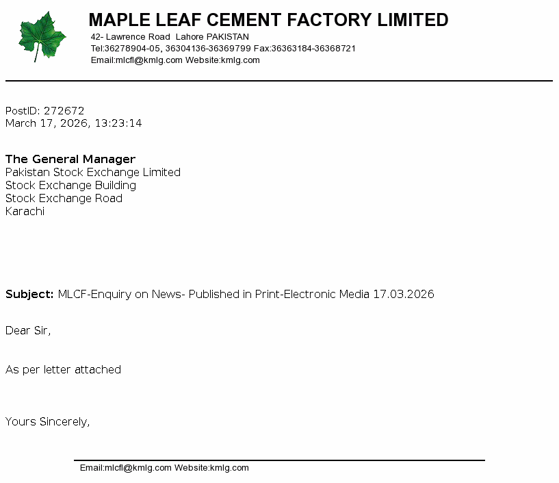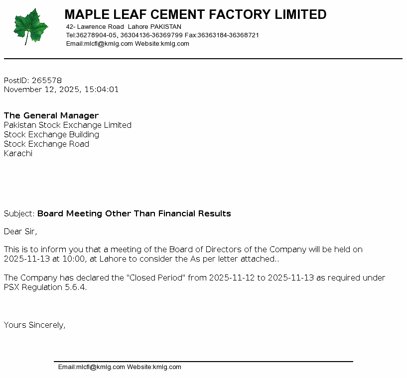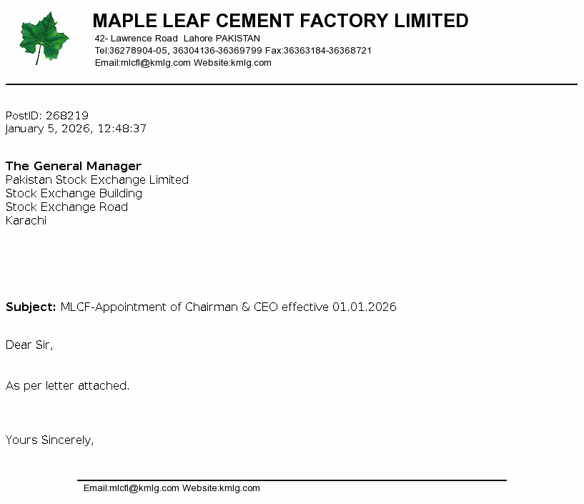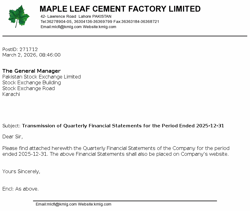 Maple Leaf Cement Factory Limited was incorporated in Pakistan on 13 April 1960 under the Companies Act, 1913 (now the Companies Ordinance, 1984) as a public company limited by shares. The principal activity of the Company is production and sale of cement. The Company is a subsidiary of Kohinoor Textile Mills Limited (“the Holding Company”).