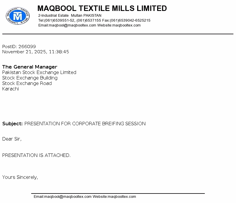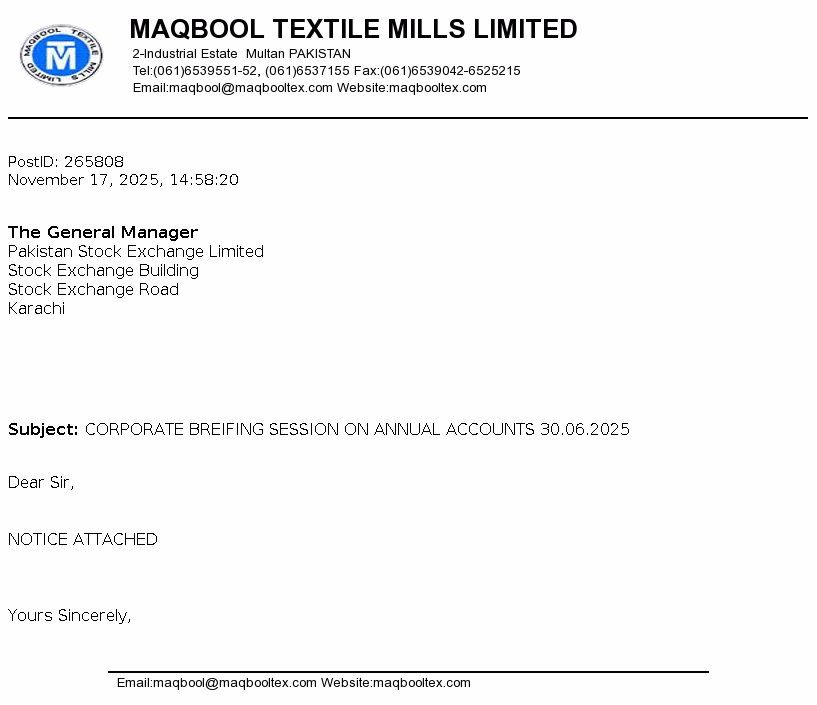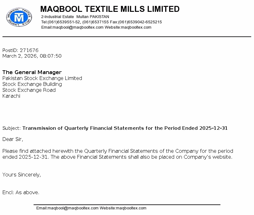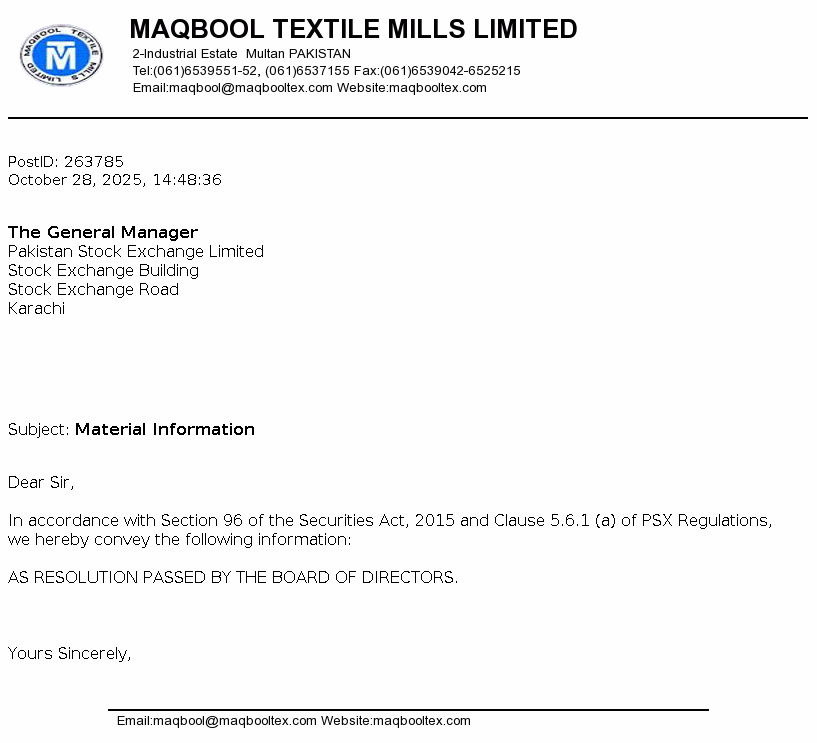 Maqbool Textile Mills Limited was incorporated in Pakistan on December 03, 1989 as a public limited company under the repealed Companies Ordinance, 1984 (now Companies Act, 2017). The Company is principally engaged in manufacturing and sale of yarn, cotton seed and cotton lint.