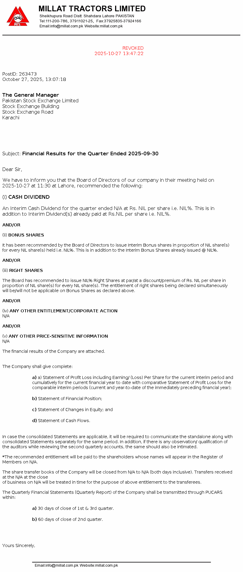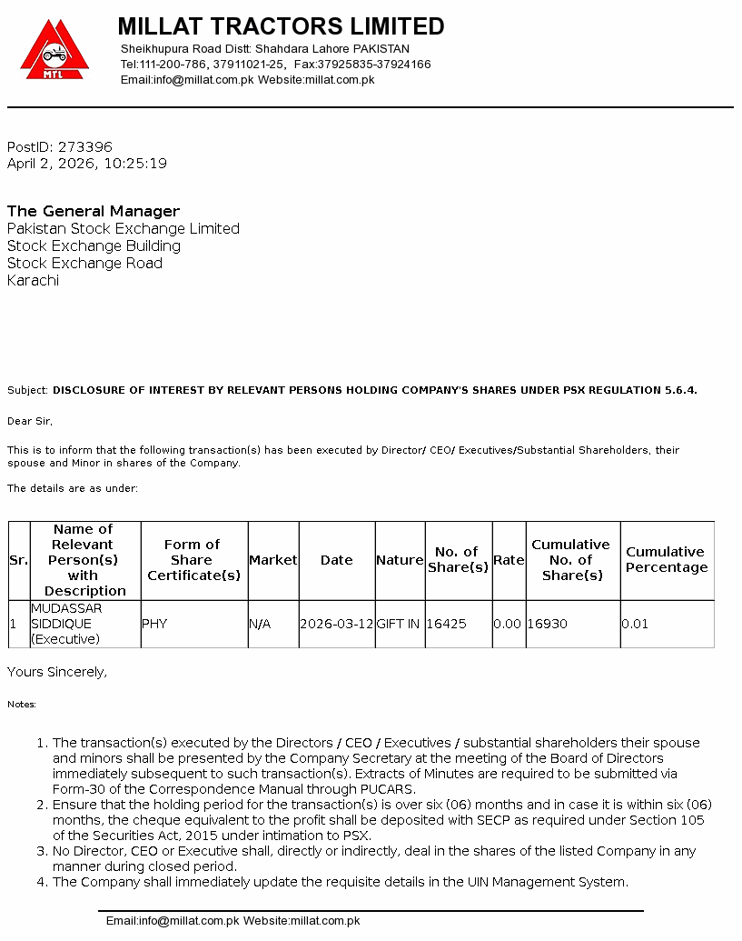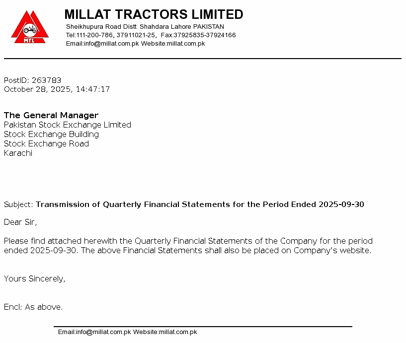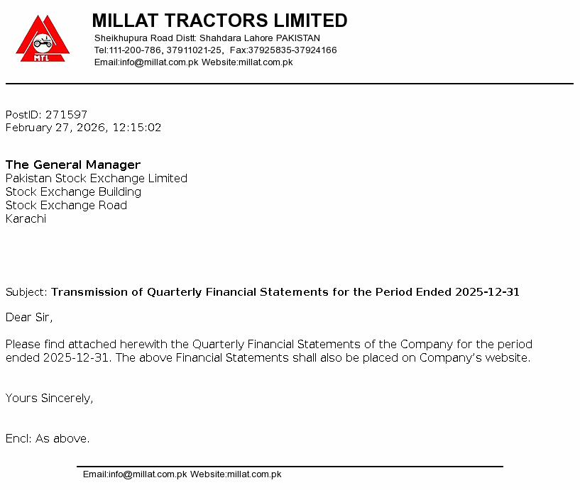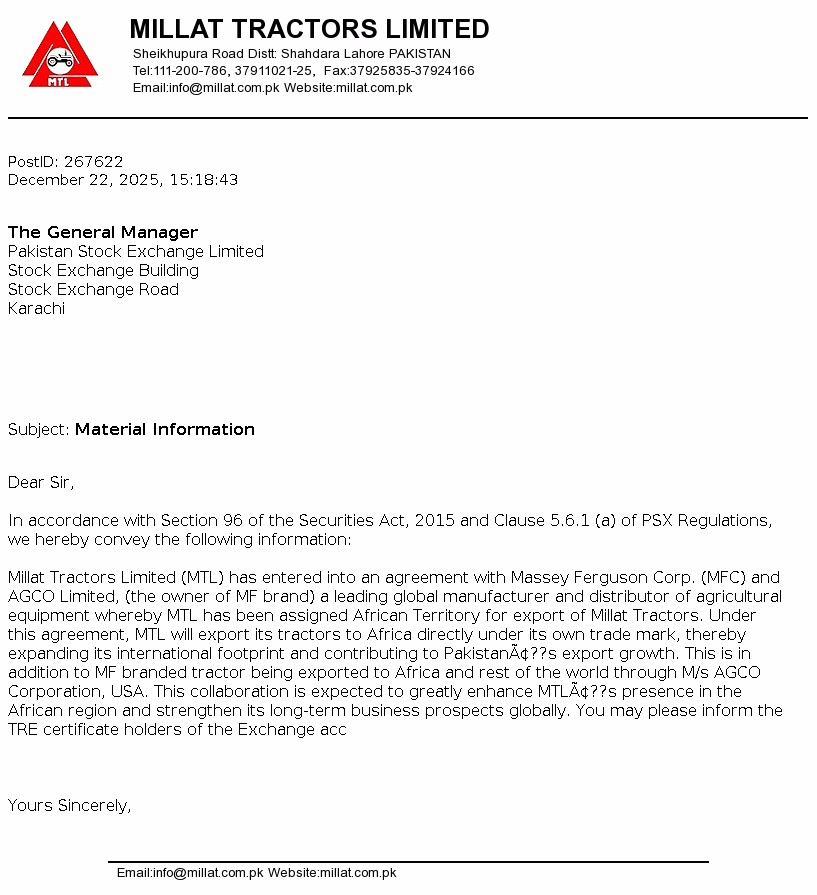 Millat Tractors Limited is a public limited company and was incorporated in Pakistan in 1964 under the Companies Act, 1913 (now the Companies Act, 2017). The Company is principally engaged in assembling and manufacturing of agricultural tractors, implements and multiapplication products. The Company is also involved in the sale, implementation and support of IFS applications in Pakistan and abroad.