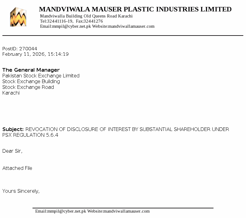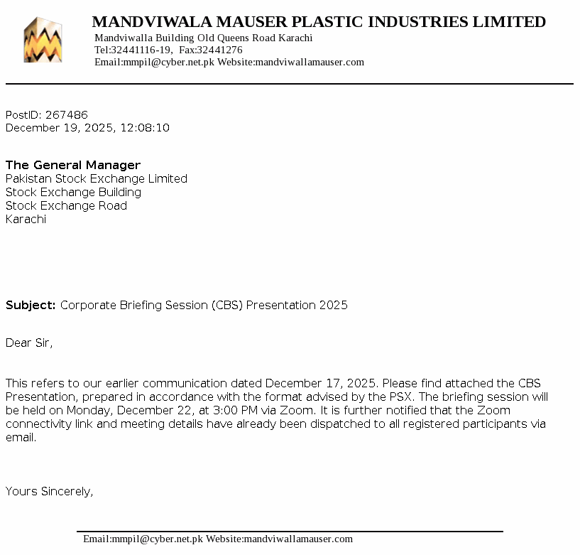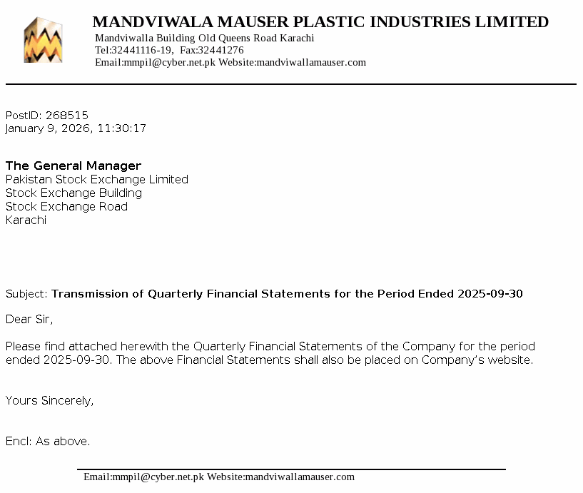 Mandviwala Mauser Plastic Industries Limited was incorporated in Pakistan on June 13, 1988 as a public limited company under the companies ordinance, 1984 (now Companies Act, 2017). The company is mainly engaged in manufacturing and sale of plastic and allied products.