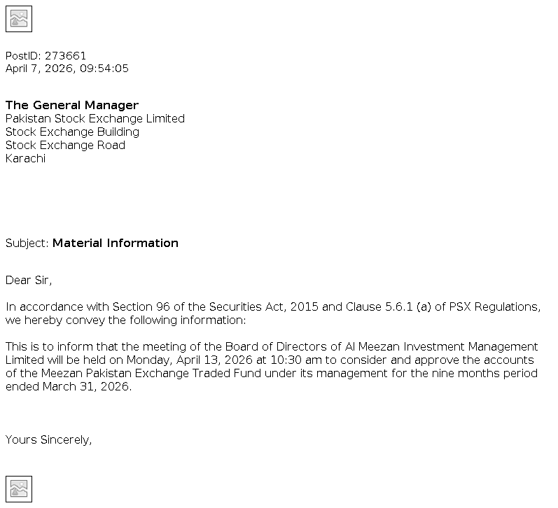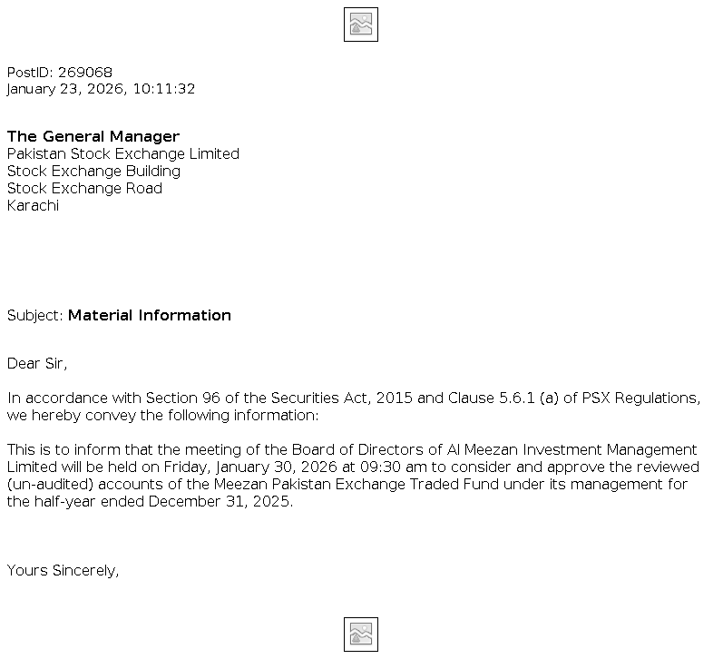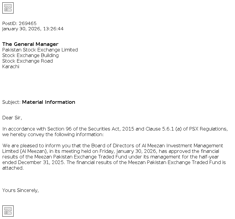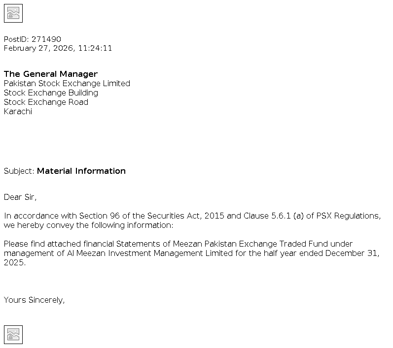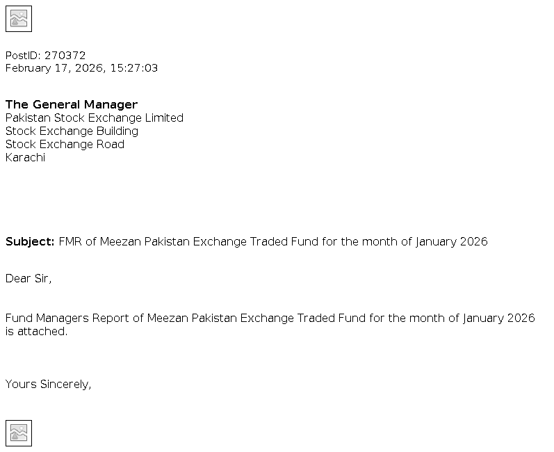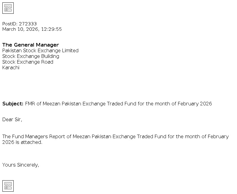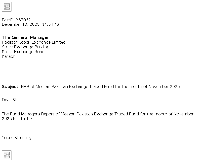 Meezan Pakistan Exchange Traded Fund was established under a Trust Deed signed between Al Meezan Investment Management Limited as the Management Company and Central Depository Company of Pakistan Limited as Trustee. Meezan Pakistan ETF is Shariah compliant Exchange Traded Fund which aims to track the Meezan Pakistan Index. The index comprises of Shariah compliant equity securities selected with high consideration towards Market Capitalization and Traded Value. Details of the constituents of the Fund is provided on the website. Click for further details.