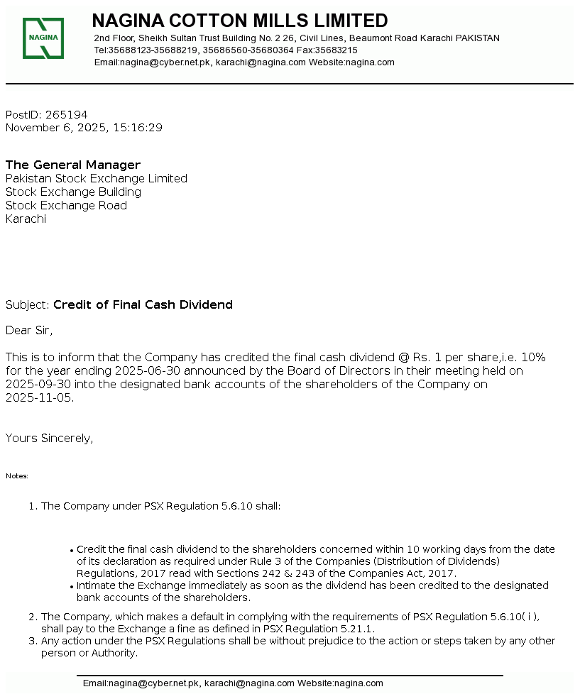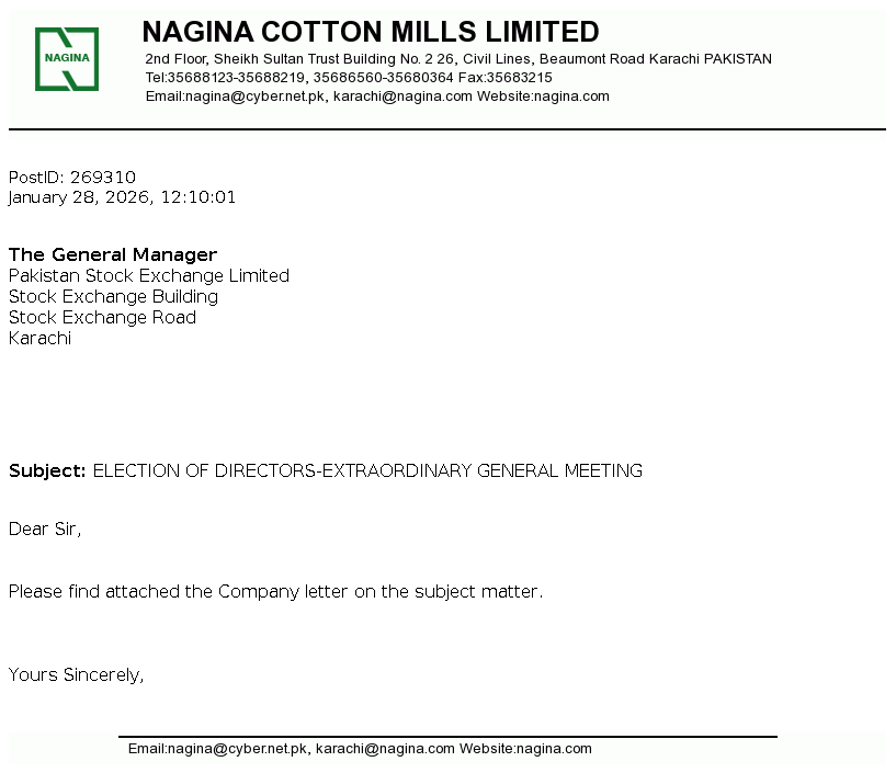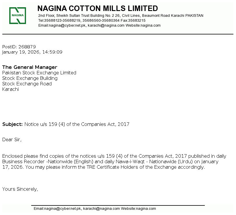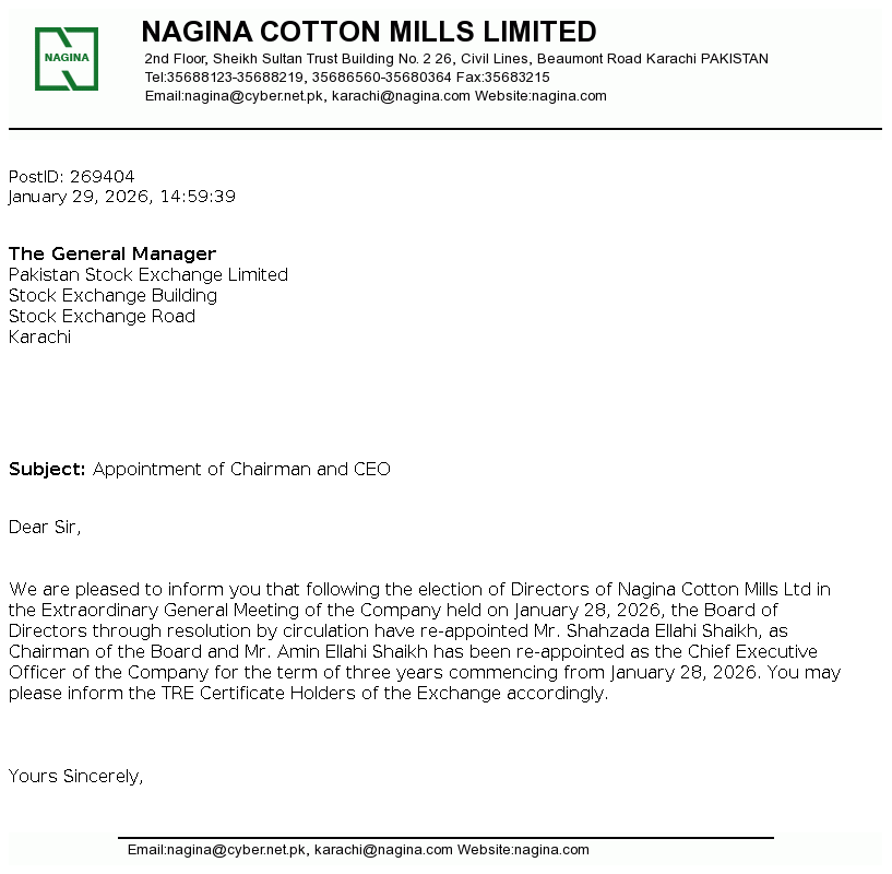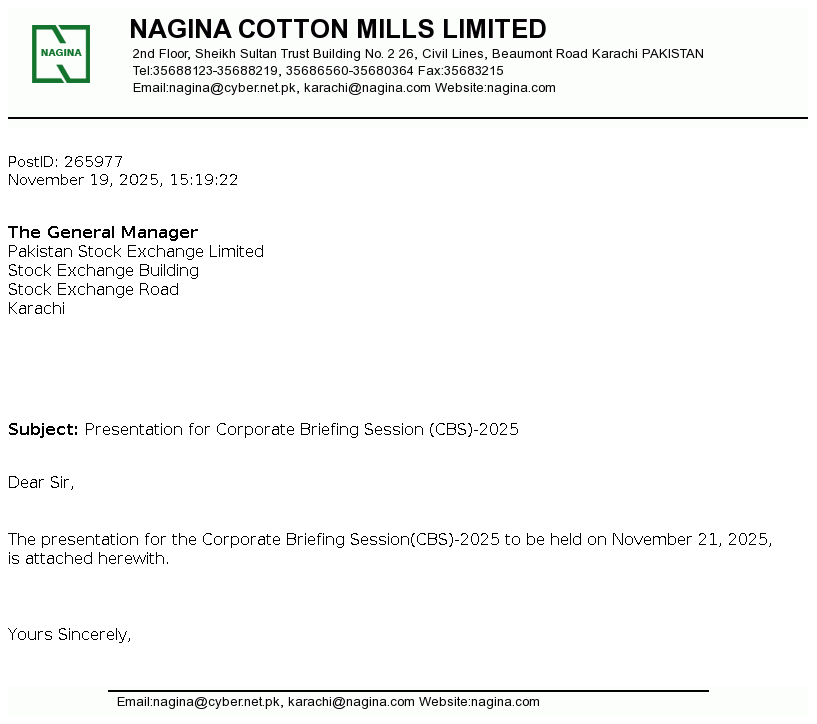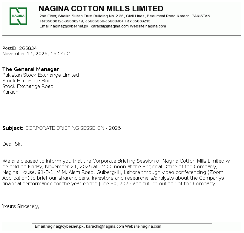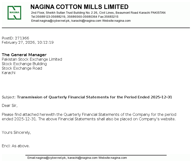 Nagina Cotton Mills Limited was incorporated in Pakistan on May 16, 1967 as a public limited company under the Companies Act, 1913 (repealed) now The Companies' Act, 2017. The principal business of the Company is to manufacture and sale of yarn.