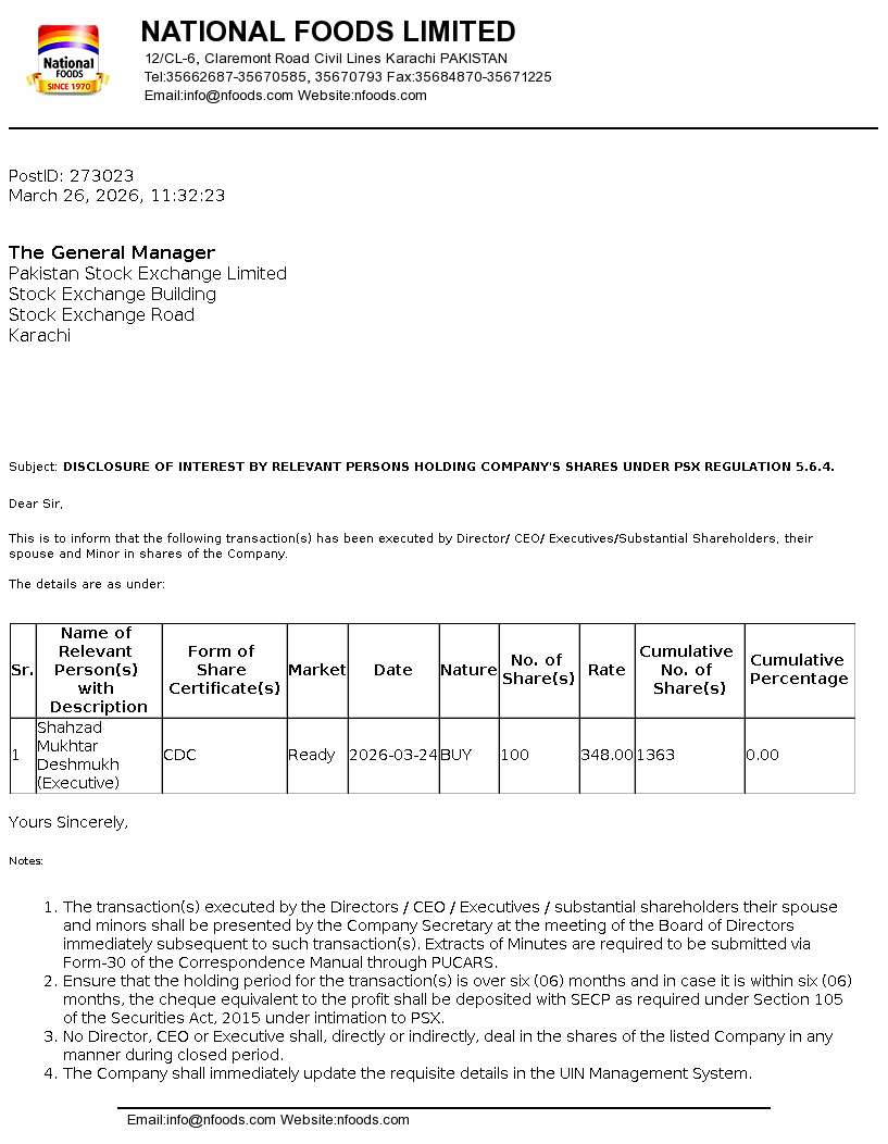 National Foods Limited was incorporated in Pakistan on 19 February 1970 as a private limited company under the Companies Act, 1913 and subsequently converted into a public limited company under the repealed Companies Ordinance, 1984 (now Companies Act, 2017). The Company is principally engaged in the manufacture and sale of convenience based food products. The ultimate parent entity of the Company is ATC Holdings (Private) Limited.