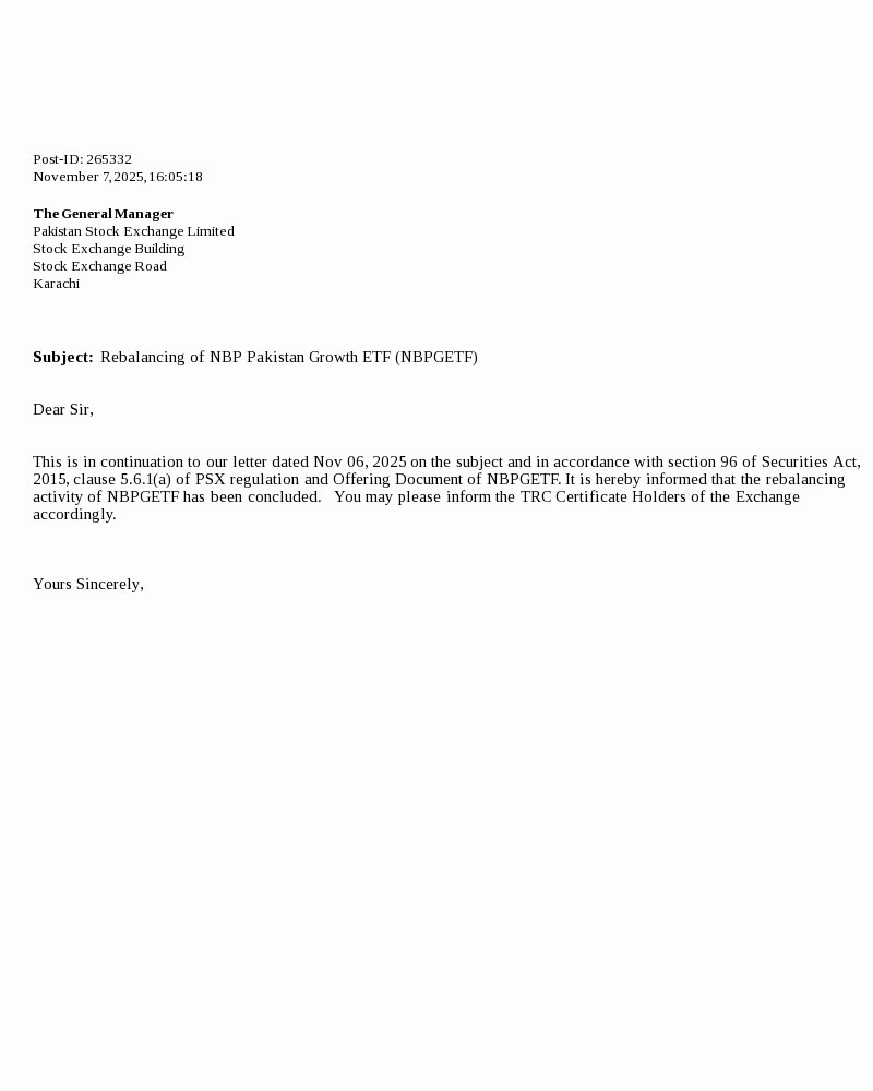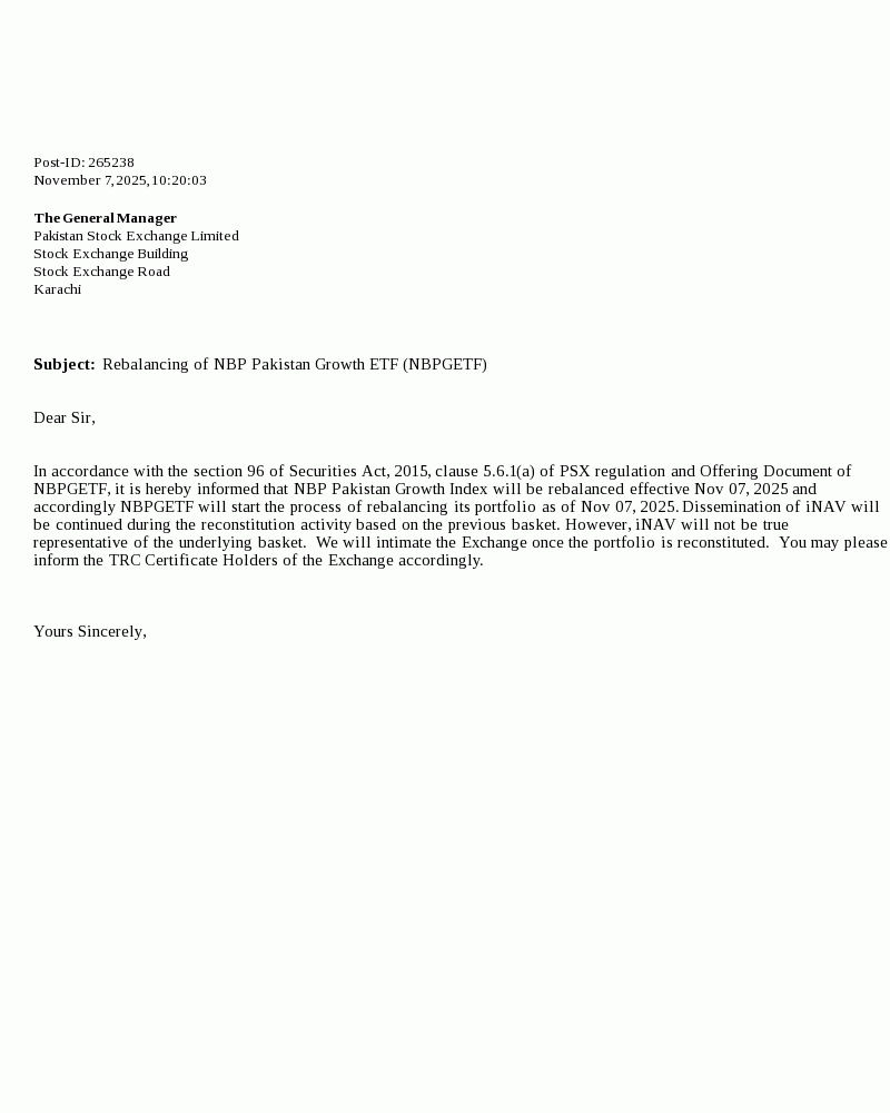 NBP Pakistan Growth Exchange Traded Fund (NBPGETF) is an open-end Exchange Traded Fund which aims to track the authorized benchmark index, the NBP Pakistan Growth Index, which is constituted based on selecting top companies of KSE-100 index based on market capitalization, liquidity and volume as per the investment methodology constituted by the Management Company. NBPGETF invests in diversified portfolio of 15 blue-chip companies across 7 sectors. Click for further details.