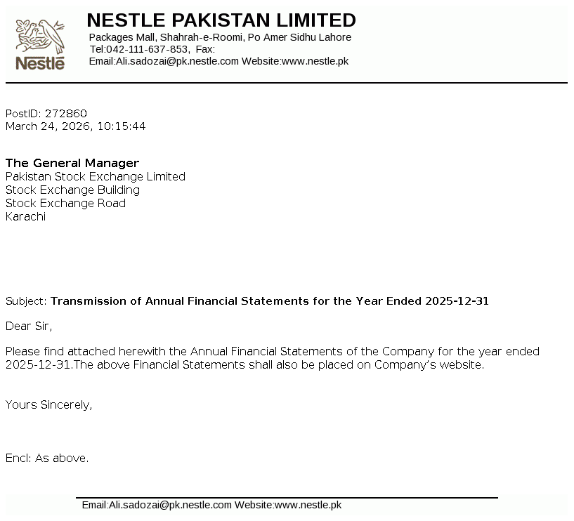 Nestlé Pakistan Limited is a public limited company incorporated in Pakistan - under the repealed Companies Ordinance 1984 (now Companies Act 2017). The Company is a subsidiary of Nestlé S.A, a Swiss based public limited company.The Company is principally engaged in manufacturing, processing and sale of dairy, nutrition, beverages and food products including imported products.