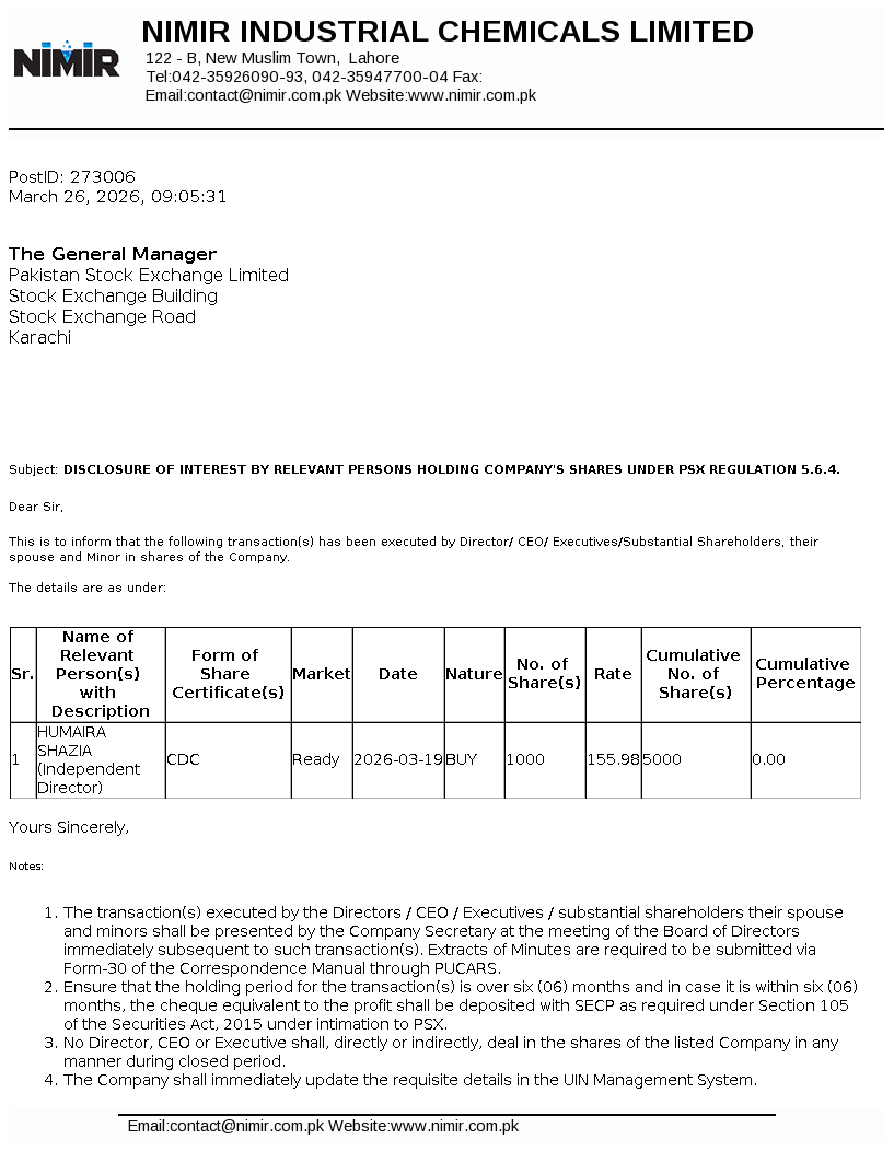 Nimir Industrial Chemicals Limited was incorporated in Pakistan as a public limited company. The Company is engaged in manufacturing and sales of chemical products along with toll manufacturing of aerosol, soap products, home and personal care.