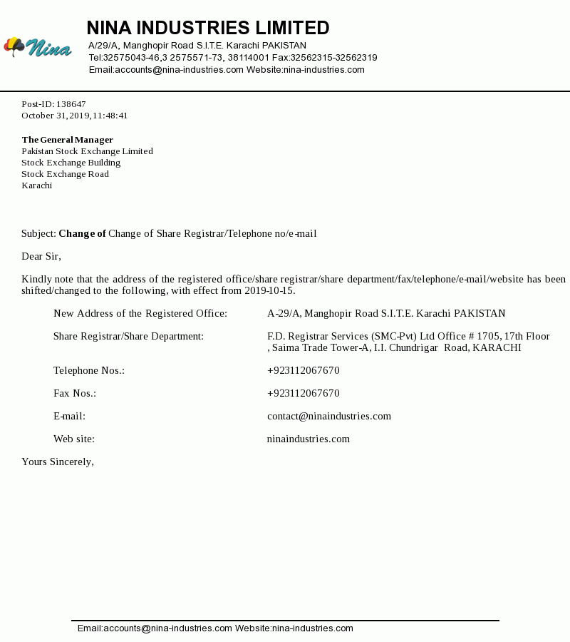 F.D. Registrar Services (SMC-Pvt) Ltd Office # 1705, 17th Floor, Saima Trade Tower-A, I.I. Chundrigar Road Karachi
