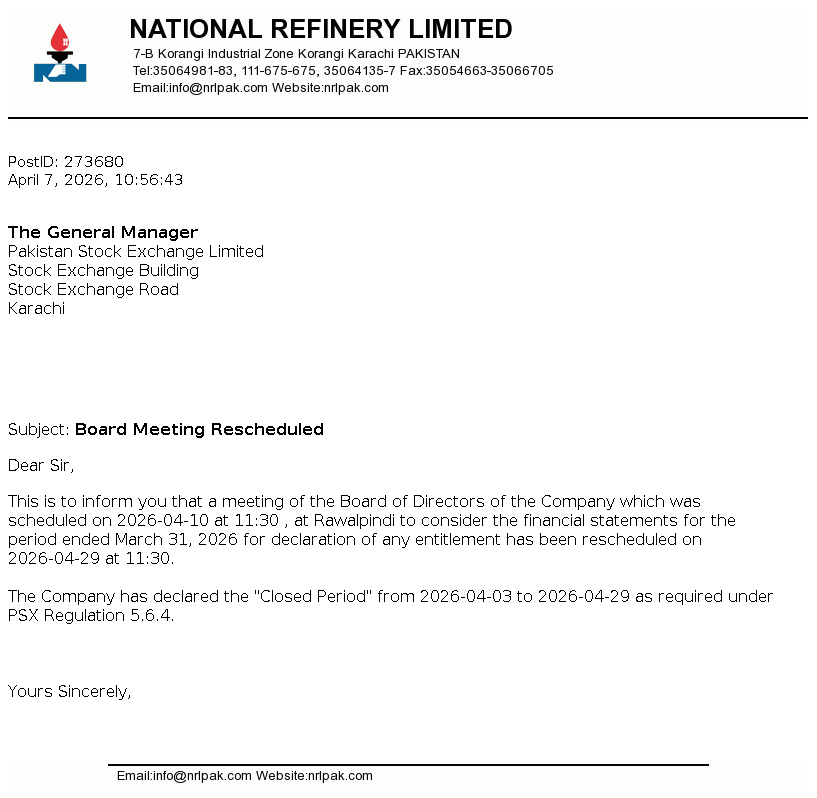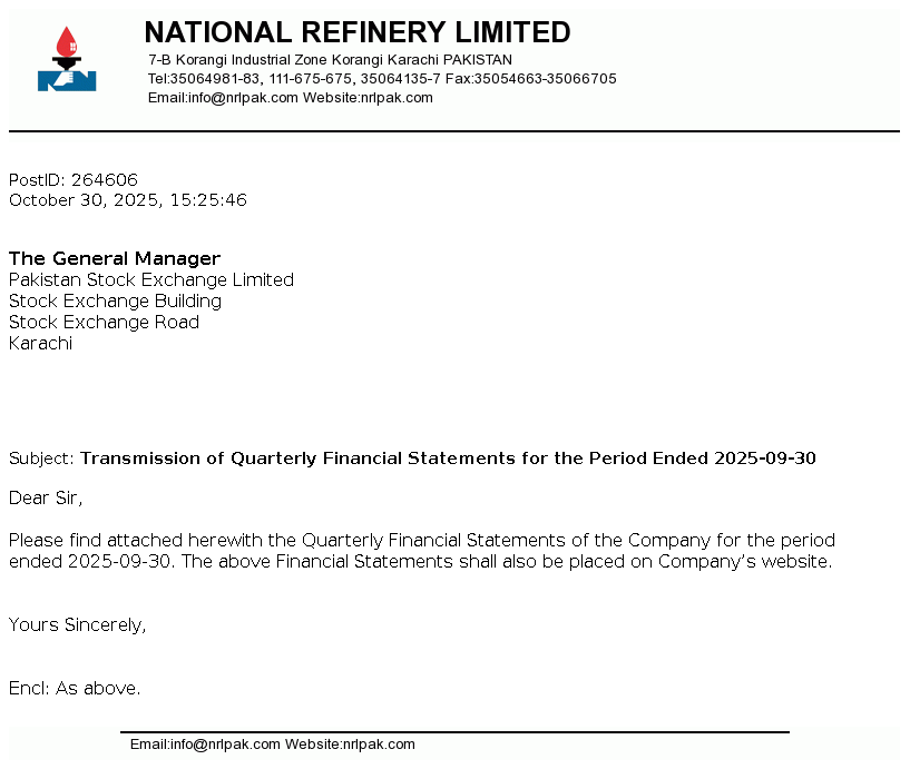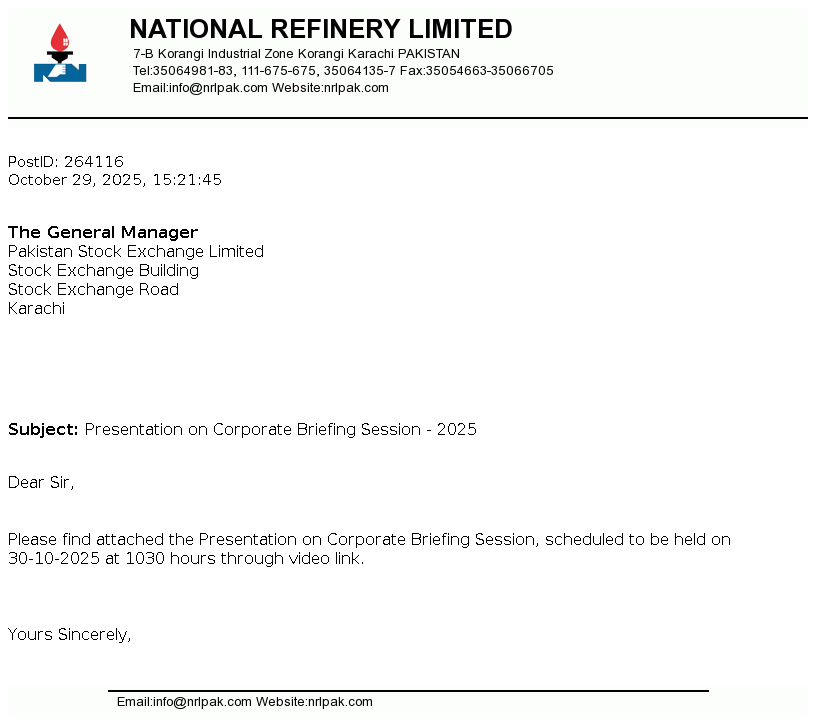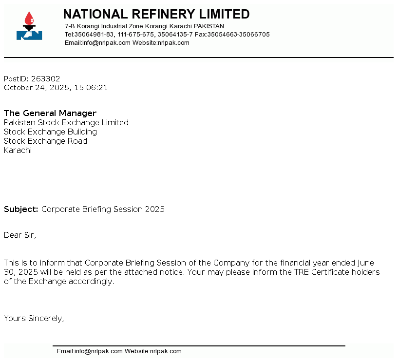National Refinery Limited was incorporated in Pakistan on August 19, 1963 as a public limited company. The Company is engaged in the manufacturing, production and sale of a large range of petroleum products. The refinery complex of the Company comprises of three refineries, consisting of two lube refineries, and a fuel refinery added to the complex. The company has also commissioned Diesel Hydro De-sulphurisation (DHDS) and Isomerisation (ISOM) units during the financial years 2017 and 2018 respectively.