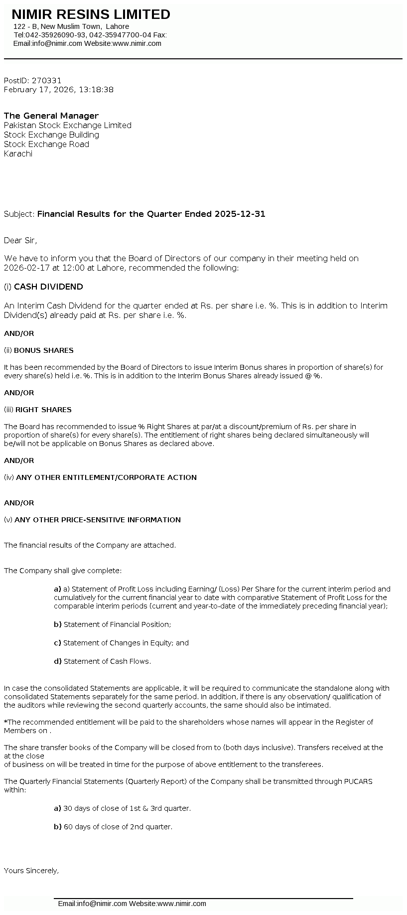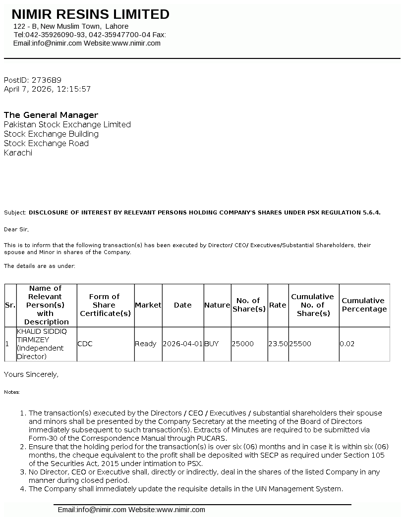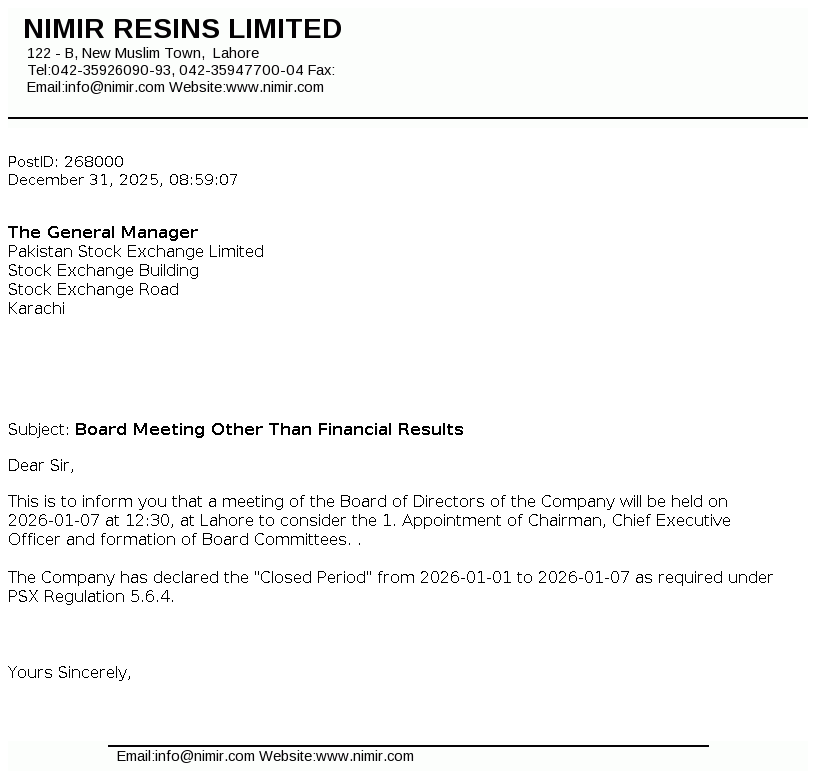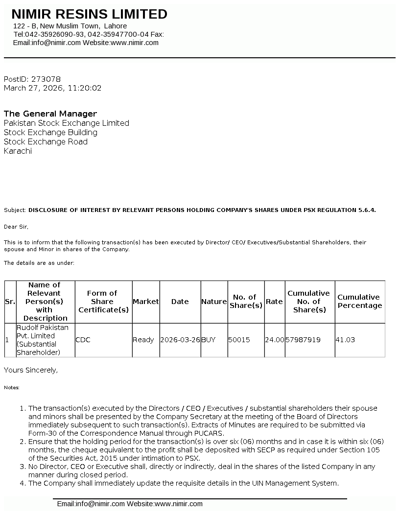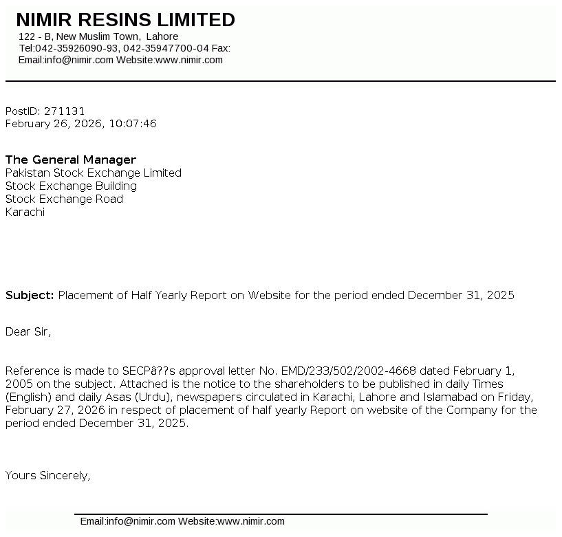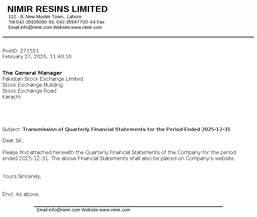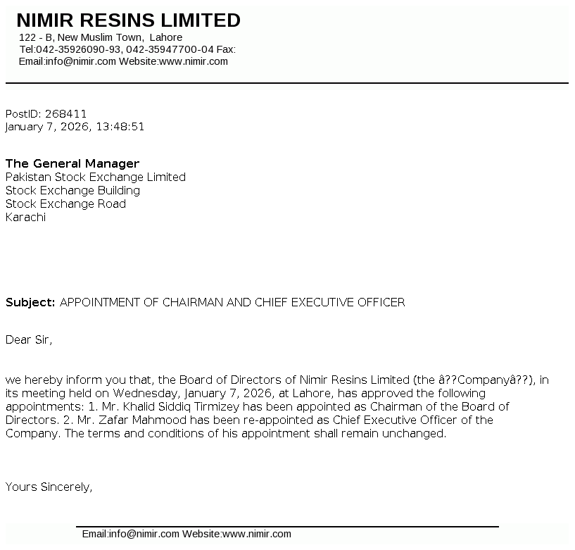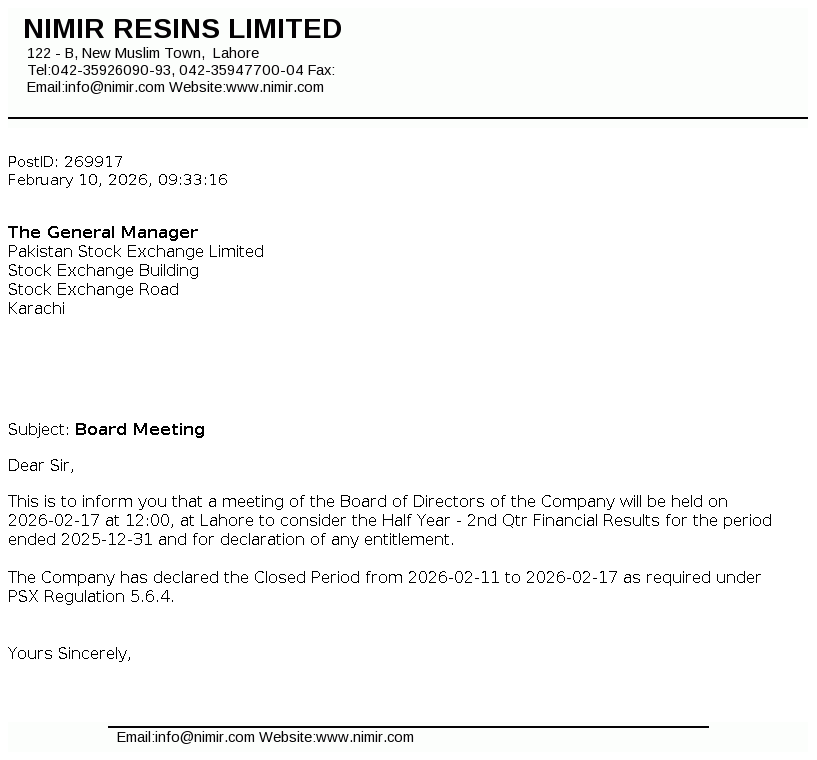Nimir Resins Limited was initially incorporated in Pakistan on December 17, 1964 as a private limited company under the Companies Act, 1913 (now the Companies Act, 2017) and was converted into public limited company on August 19, 1991. The Company is a subsidiary of Nimir Management (Private) Limited whereas Nimir Industrial Chemicals Limited is the ultimate parent company of Nimir Resins Limited. The principal activity of the Company is to manufacture coating resins, composite resins (UPR), optical brightener, textile auxiliaries and paper surface sizing agents.