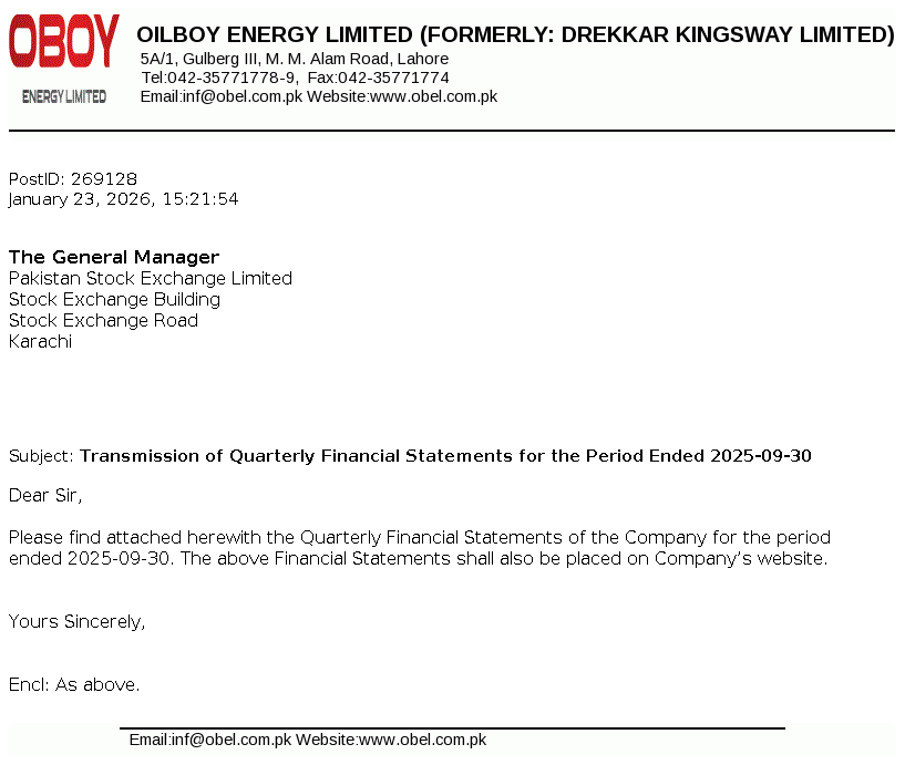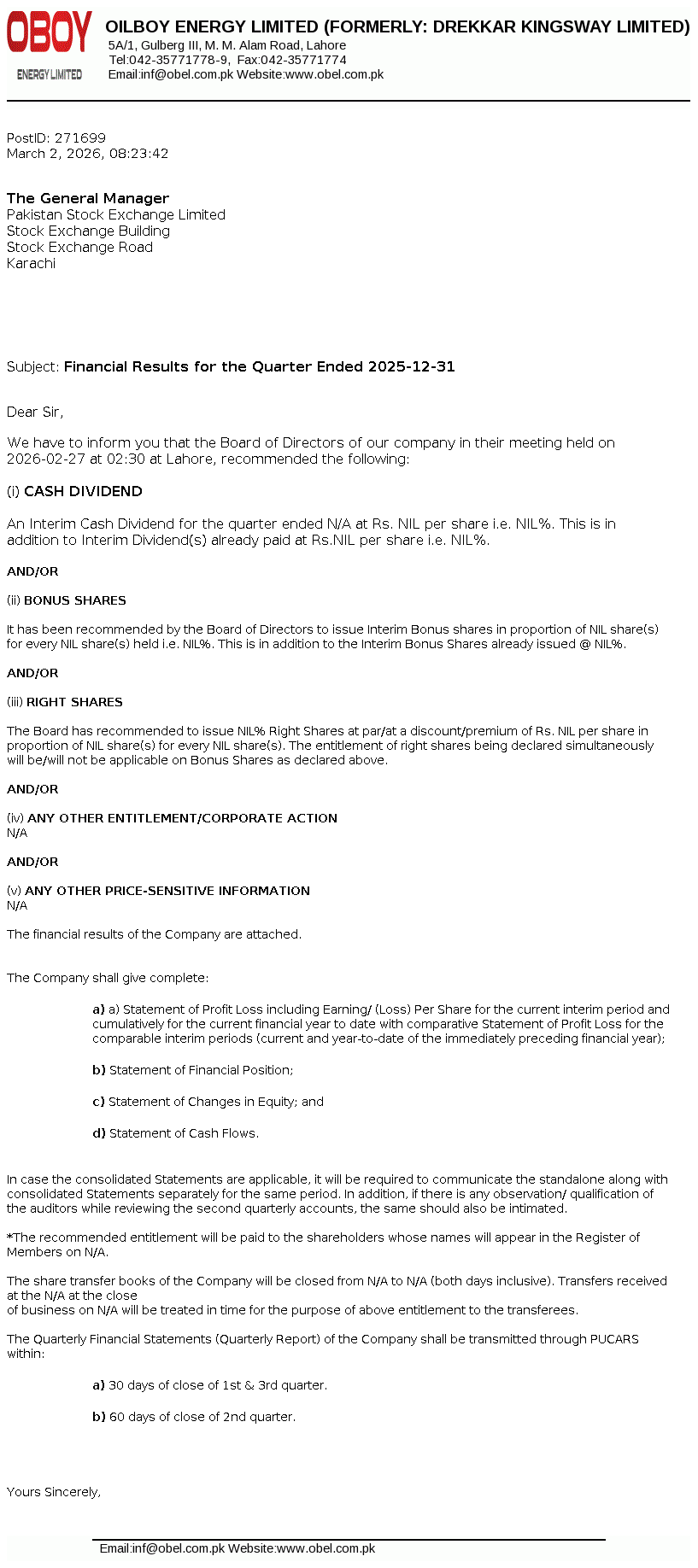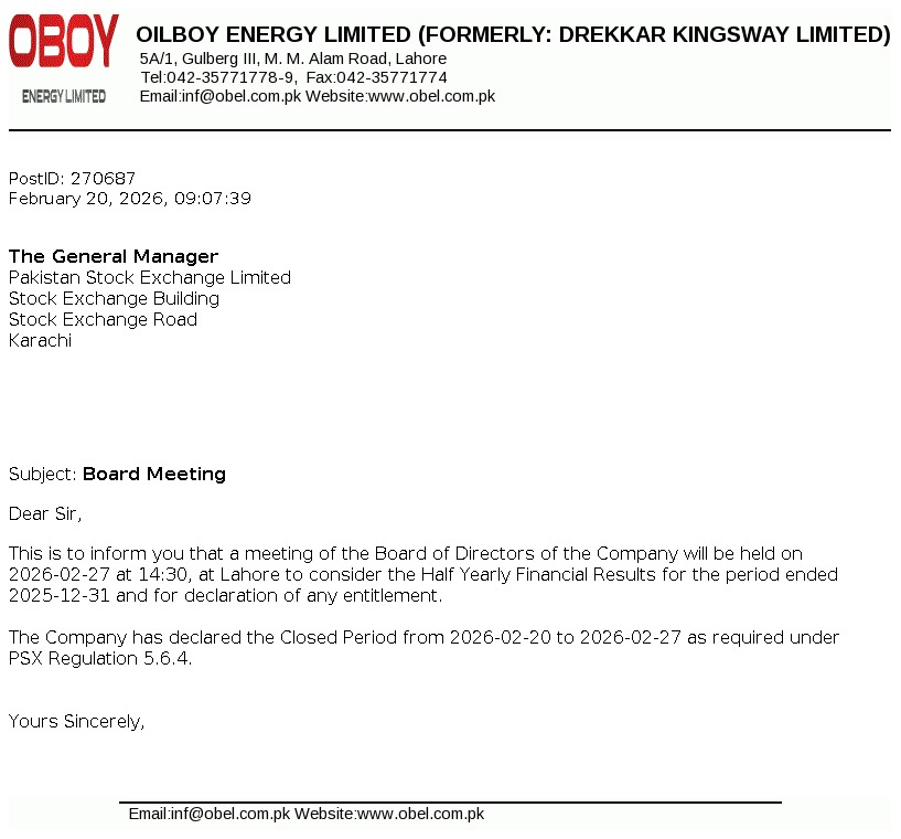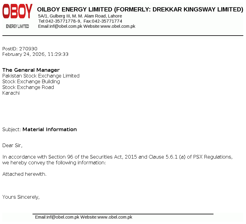 Oilboy Energy Limited (Formerly Drekkar Kingsway Limited) was registered on June 28, 1993 as Private Limited Company and was subsequently converted into Public Limited Company as on June 29, 1994. The principal activity of the company was manufacturing of all type of electrical appliances, cosmetics, toiletries, leather goods, machinery, components and parts. In 1996the company sold its plant and machinery. The company is currently engaged in making equity investments in undervalued profitable situations.