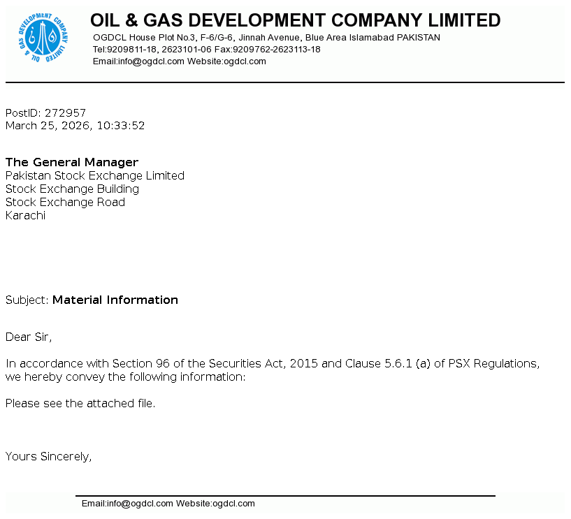 Oil and Gas Development Company Limited (OGDCL), was incorporated on 23 October 1997 under the Companies Ordinance, 1984 (now the Companies Act, 2017). The Company was established to undertake exploration and development of oil and gas resources, including production and sale of oil and gas and related activities formerly carried on by Oil and Gas Development Corporation, which was established in 1961.
