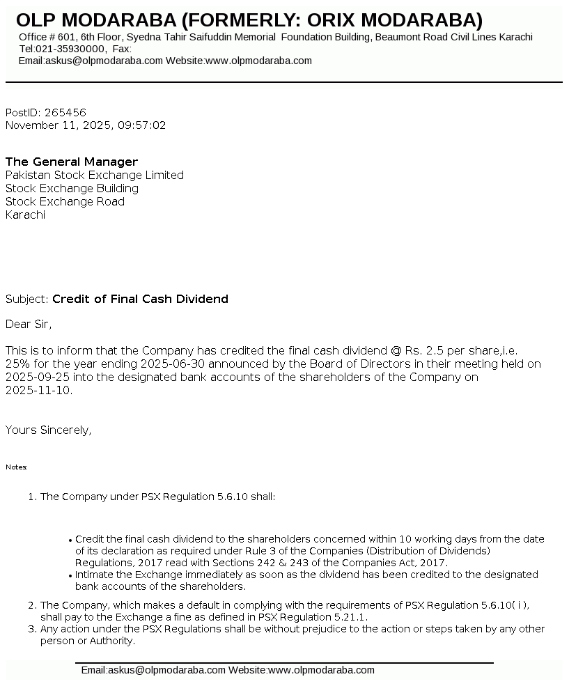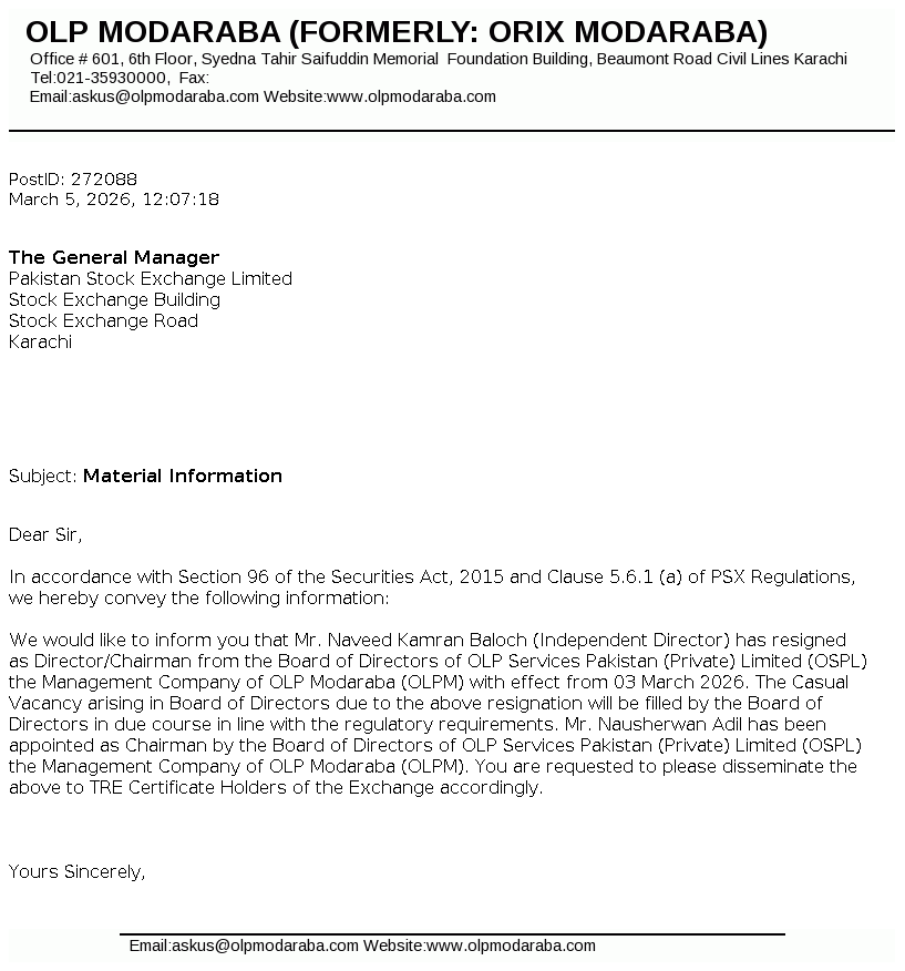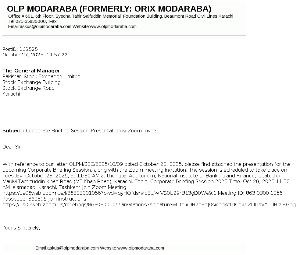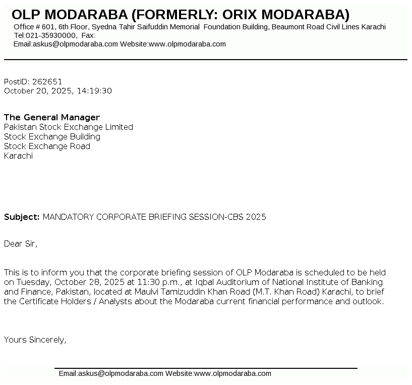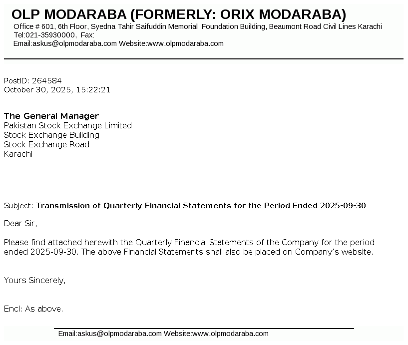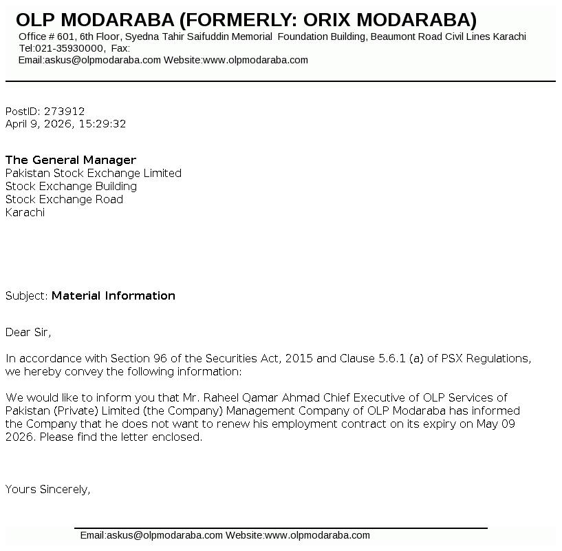 OLP Modaraba (Formerly, ORIX Modaraba) was formed under the Modaraba Companies and Modaraba (Floatation and Control) Ordinance, 1980 and is managed by ORIX Services Pakistan (Private) Limited. The Modaraba is a perpetual Modaraba and is primarily engaged in financing of plant and machinery, motor vehicles (both commercial and private), computer equipment and housing under the modes of Ijarah (Islamic leasing) and Diminishing Musharika. The Modaraba may also invest in commercial and industrial ventures suitable for the Modaraba.