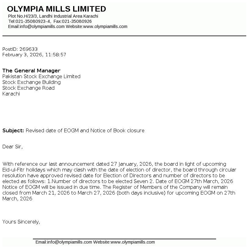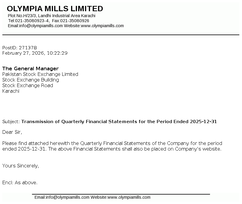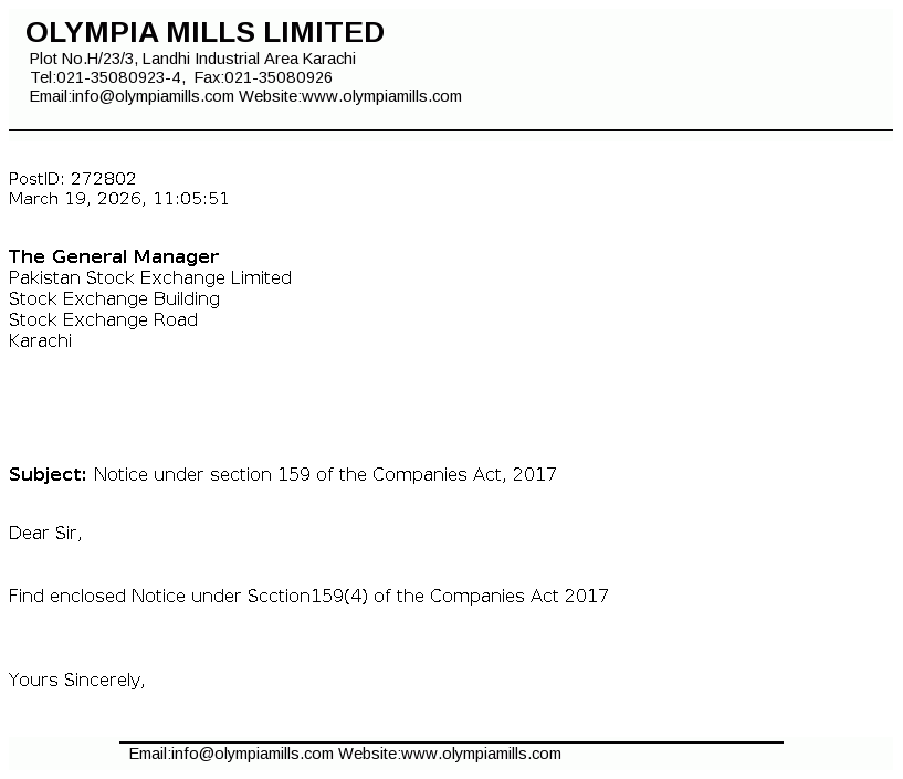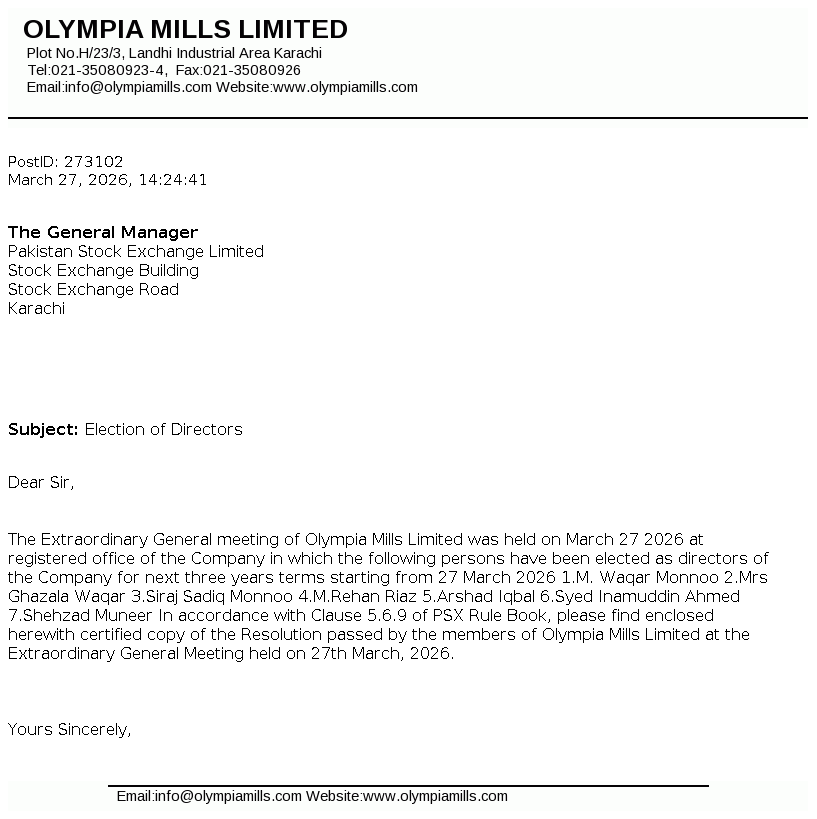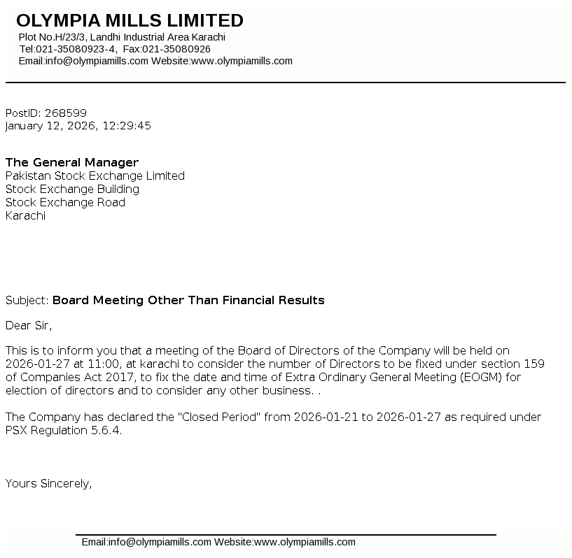Olympia Mills Limited was incorporated on October 28, 1960 under the Companies Act, 1913 (Now Companies Act, 2017). The principal line of business of the company is renting / leasing of company's fixed assets.