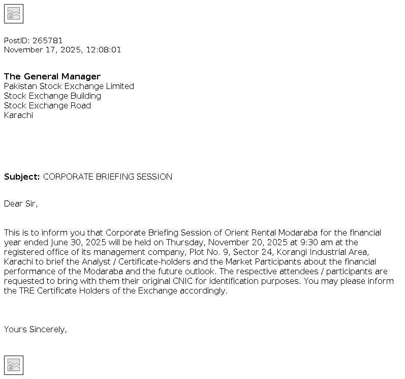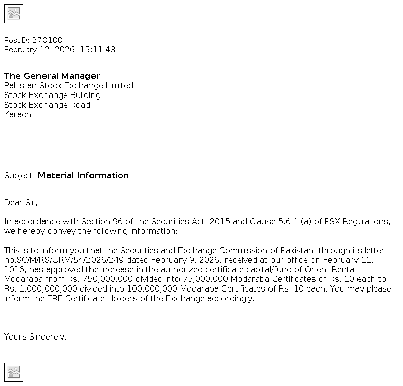The Orient Rental Modaraba is a multi-purpose and perpetual Modaraba formed under the Modaraba Companies and Modaraba (Floatation and Control) Ordinance, 1980. The Modaraba a is primarily engaged in the business of ijarah, operation and maintenance services.
