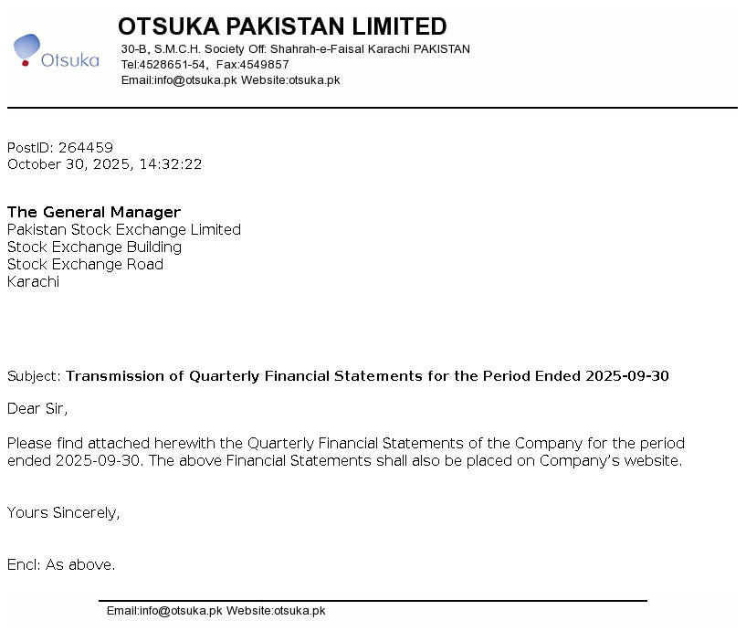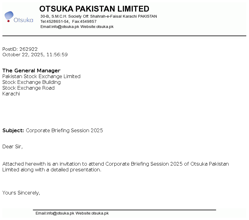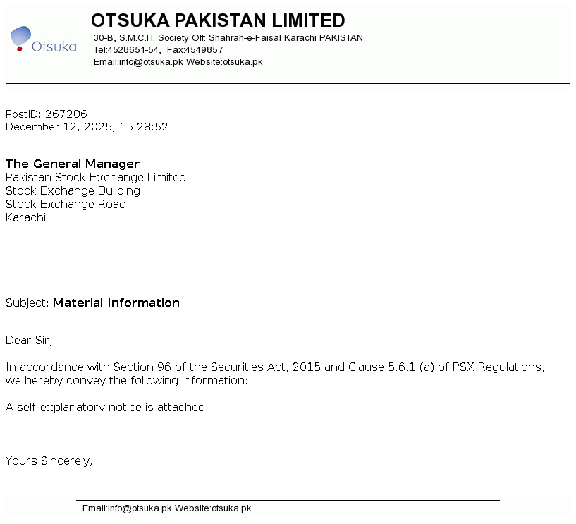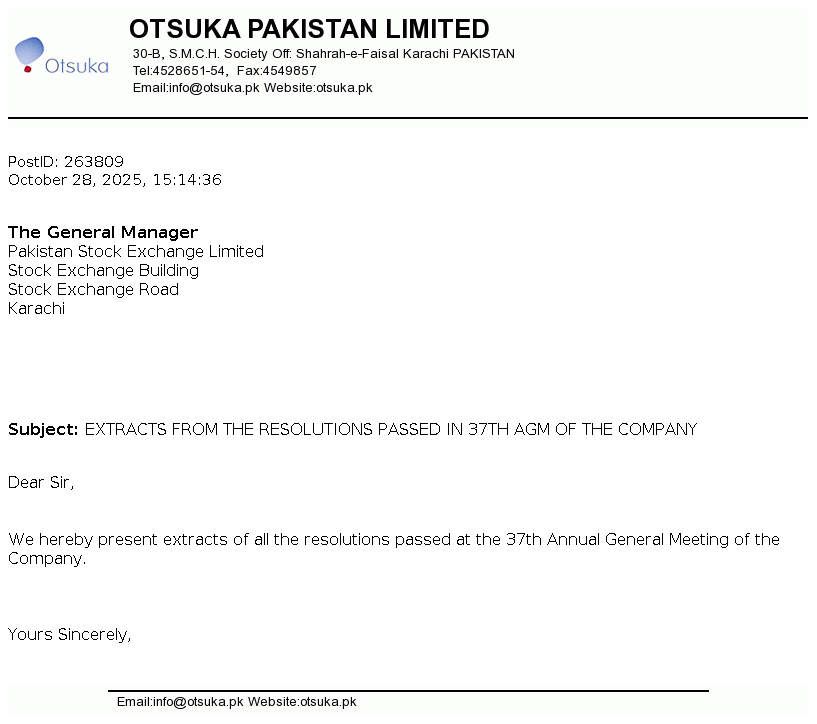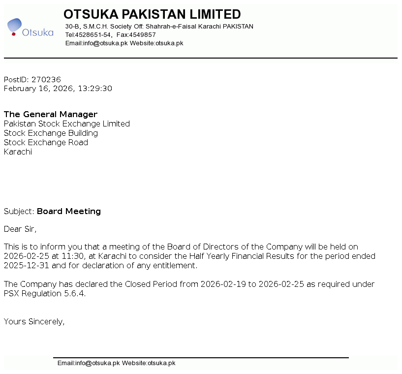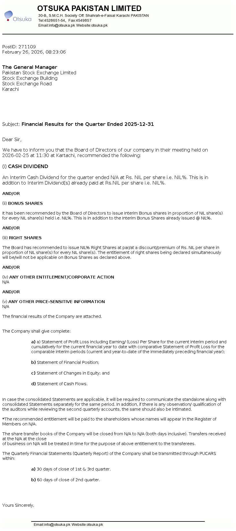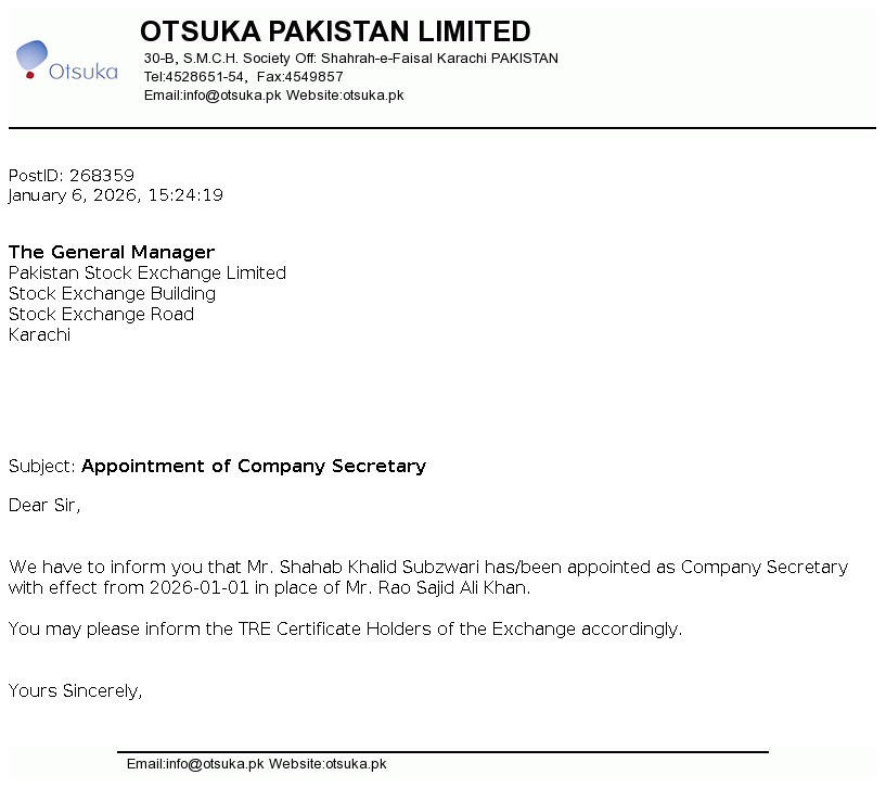 Otsuka Pakistan Limited was incorporated in Pakistan as a public limited company. The Company is engaged in the manufacturing, marketing, and distribution of intravenous infusions and trading in pharmaceutical products, nutritional foods, and medical equipment. The company is an indirect subsidiary of Otsuka Pharmaceutical Company Limited, Japan