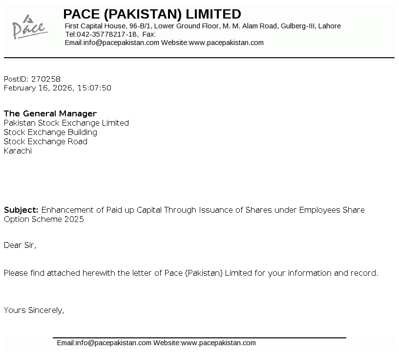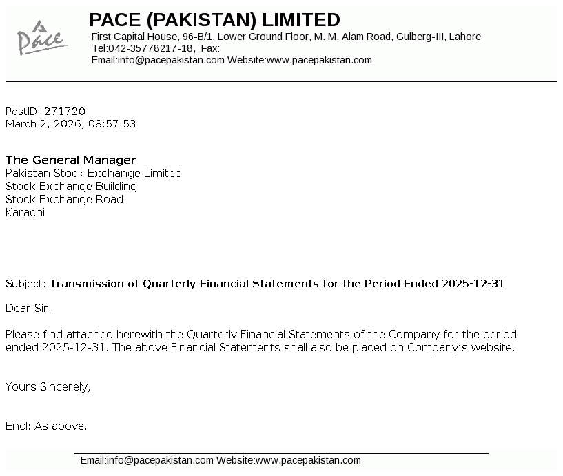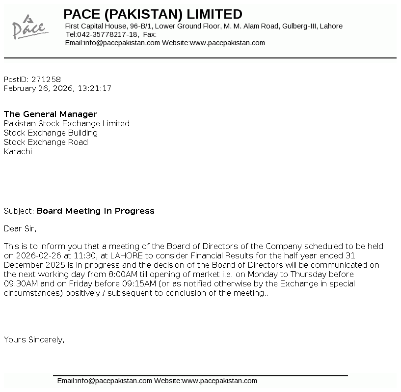 Pace (Pakistan) Limited is a public limited company incorporated in Pakistan under the repealed Companies Ordinance, 1984 (now the Companies Act, 2017) and is listed on Pakistan Stock Exchange. The Company is engaged to build, acquire, manage and sell condominiums, departmental stores, shopping plazas, super markets, utility stores, housing societies, plot and other properties and to carry out commercial, industrial and other related activities in and out of Pakistan.