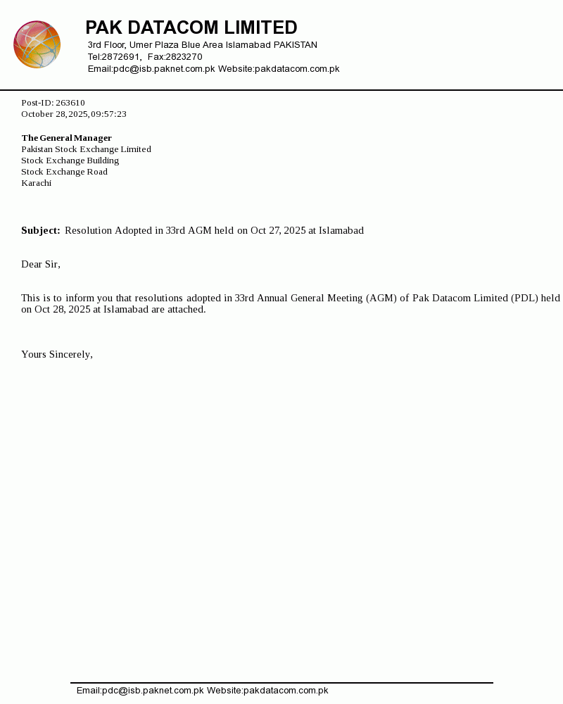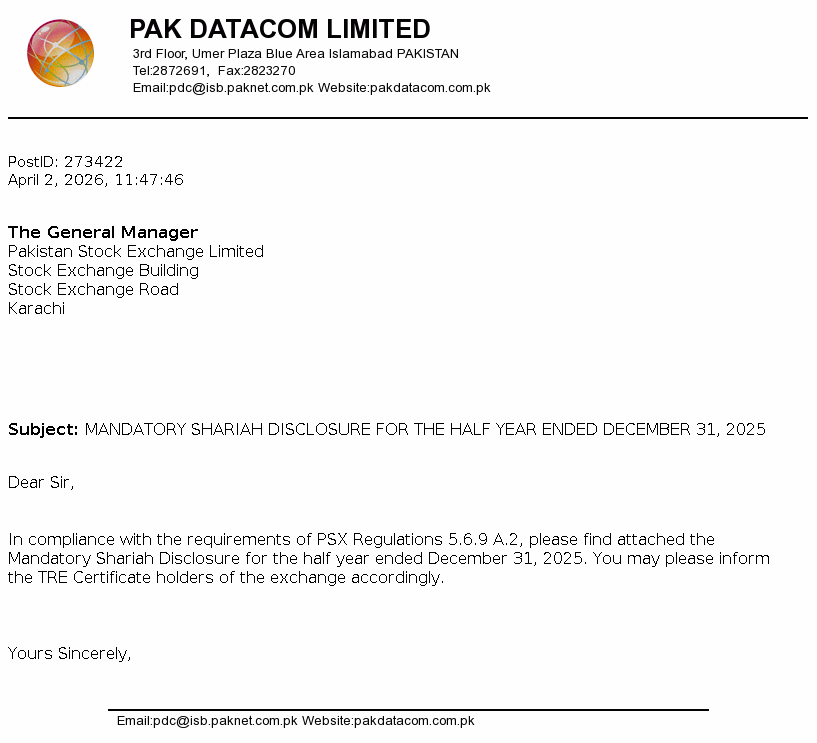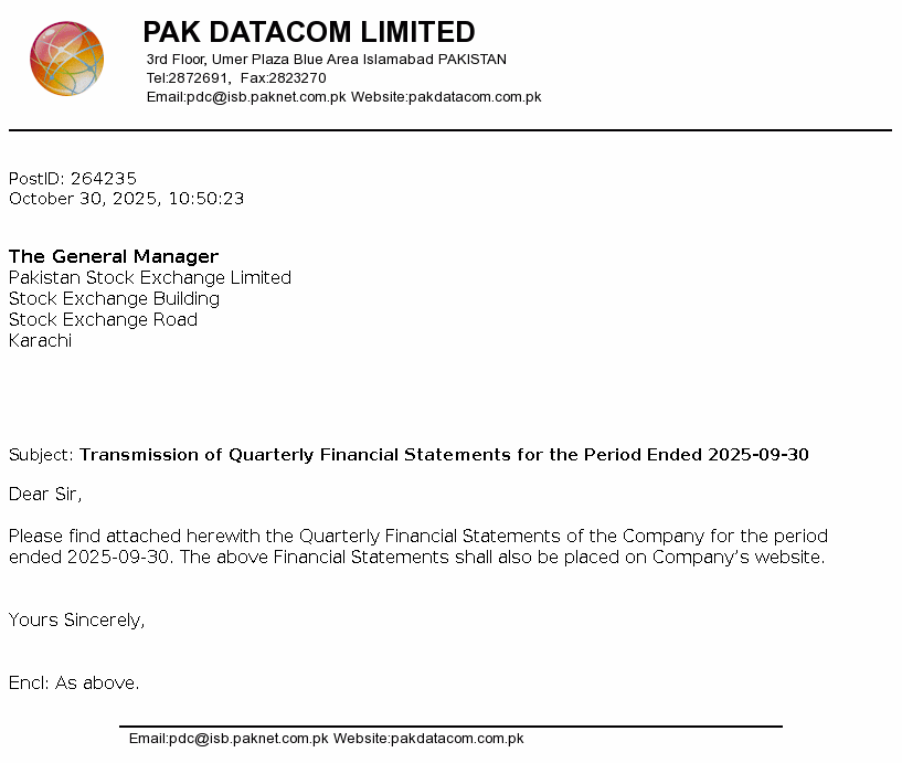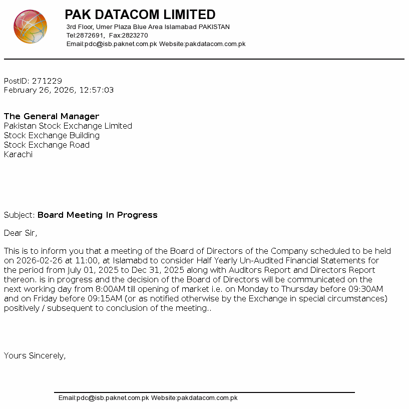 Pak Datacom Limited was incorporated in Pakistan on July 13, 1992 as a private limited company under the Companies Ordinance, 1984 (Repealed with the enactment of the Companies Act, 2017 on May 30, 2017) and was converted into a public limited company on June 26, 1994. The Company commenced its commercial activities from July 1, 1994 and is principally engaged in setting up, operating and maintaining a network of data communication and serving the needs of the customers.