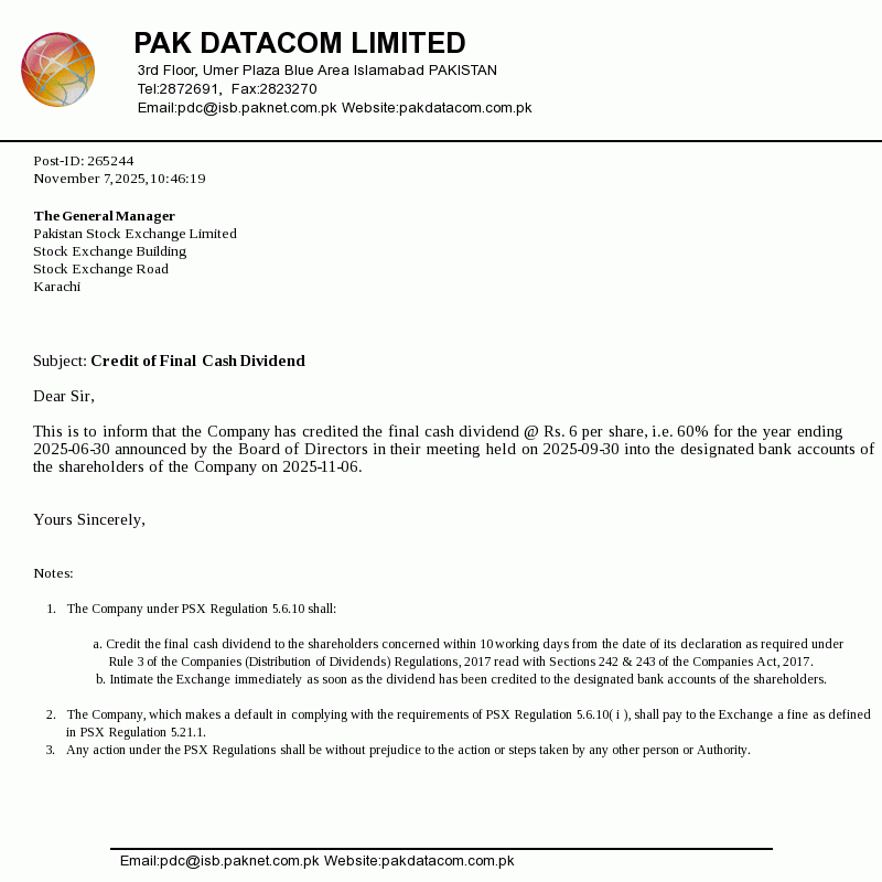 | Oct 16, 2025 | Rs. 6.00 | - |