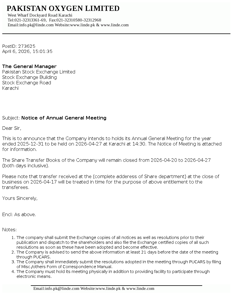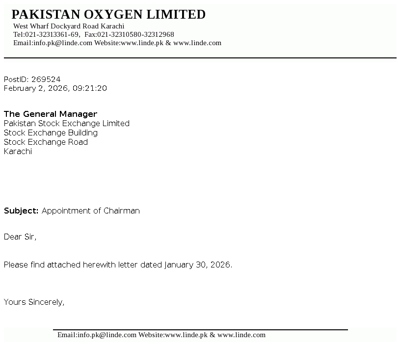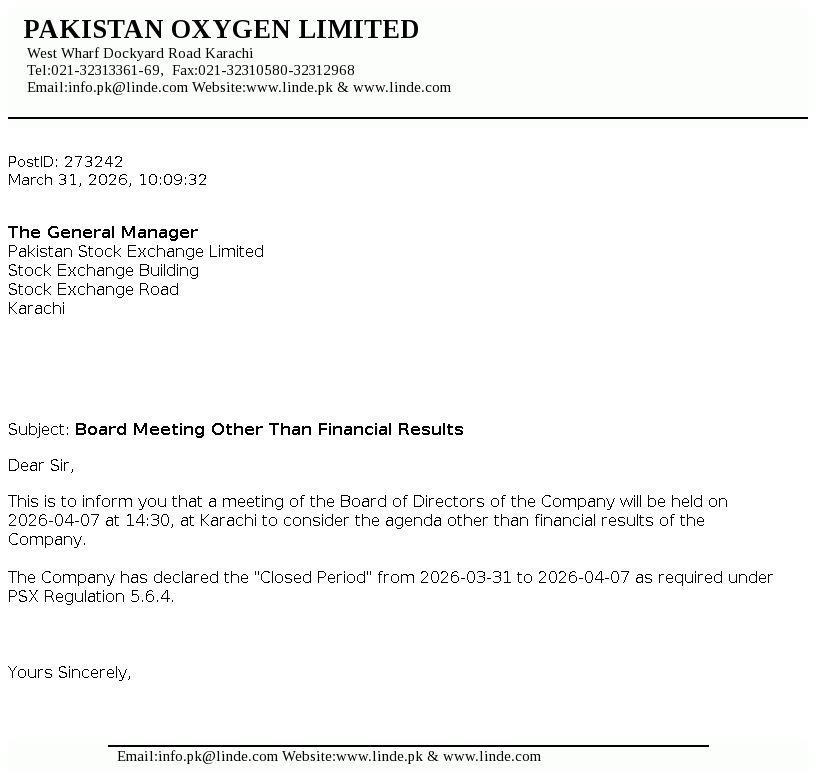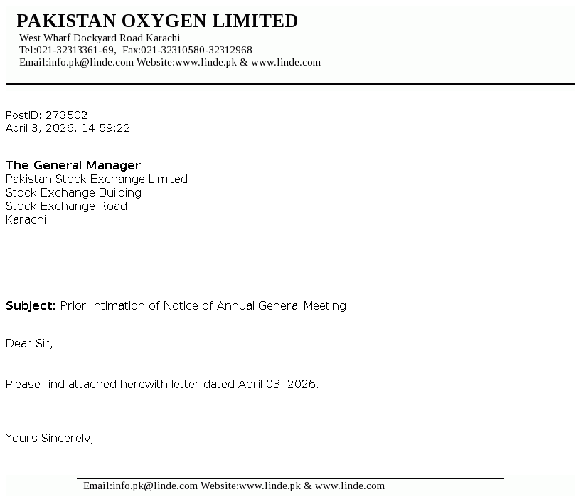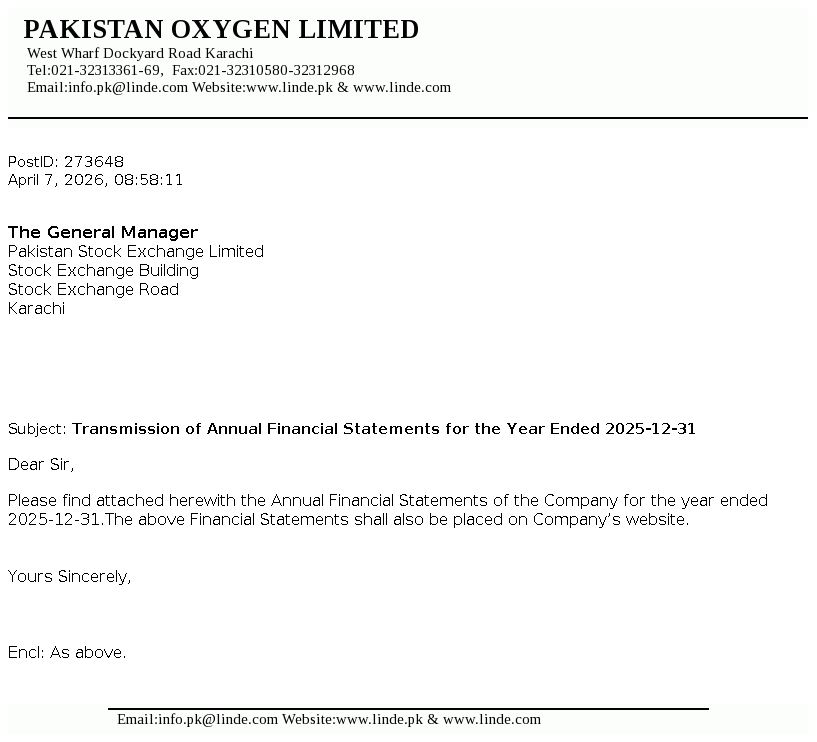 Pakistan Oxygen Limited was incorporated in Pakistan under the repealed Companies Act, 1913 (now Companies Act, 2017), as a private limited company in 1949 and converted into a public limited company in 1958. The Company is principally engaged in the manufacturing of industrial and medical gases, welding electrodes and marketing of medical equipment.