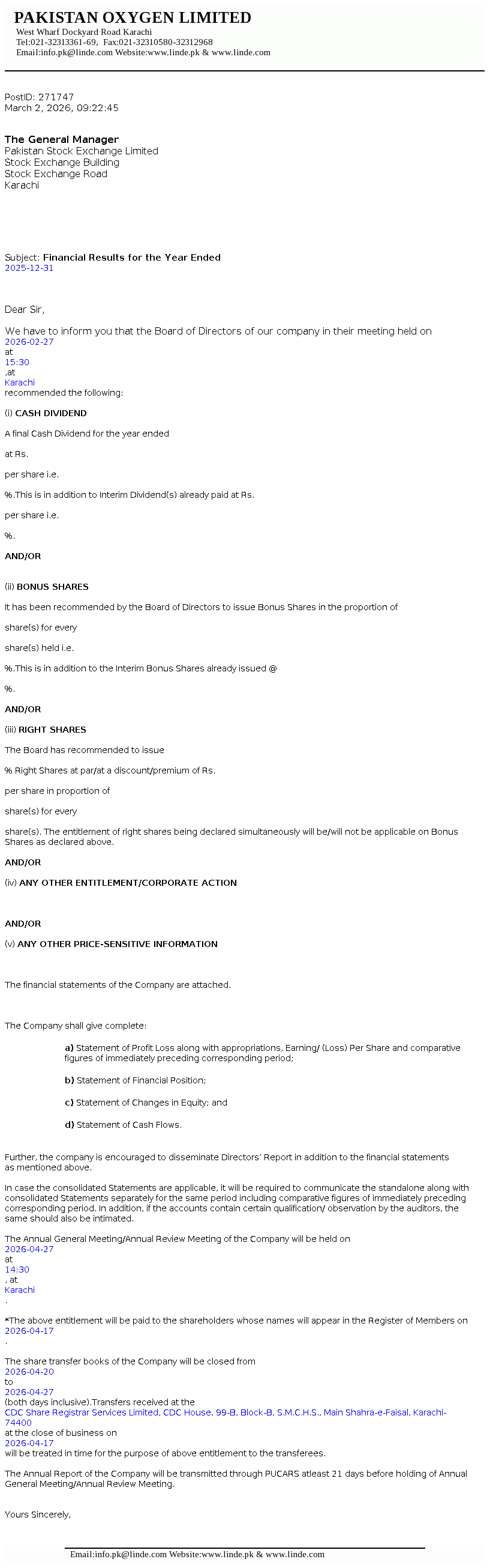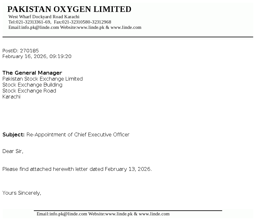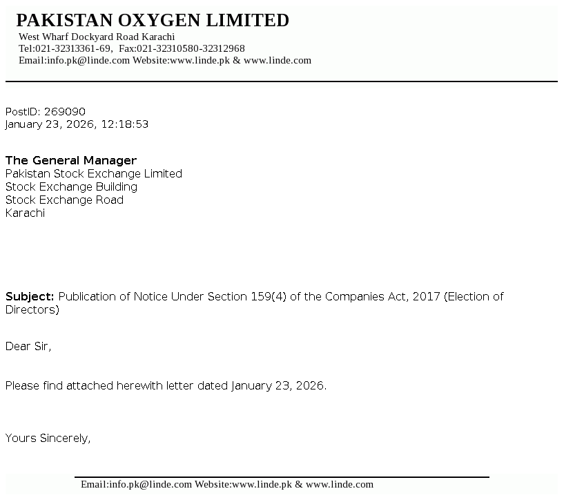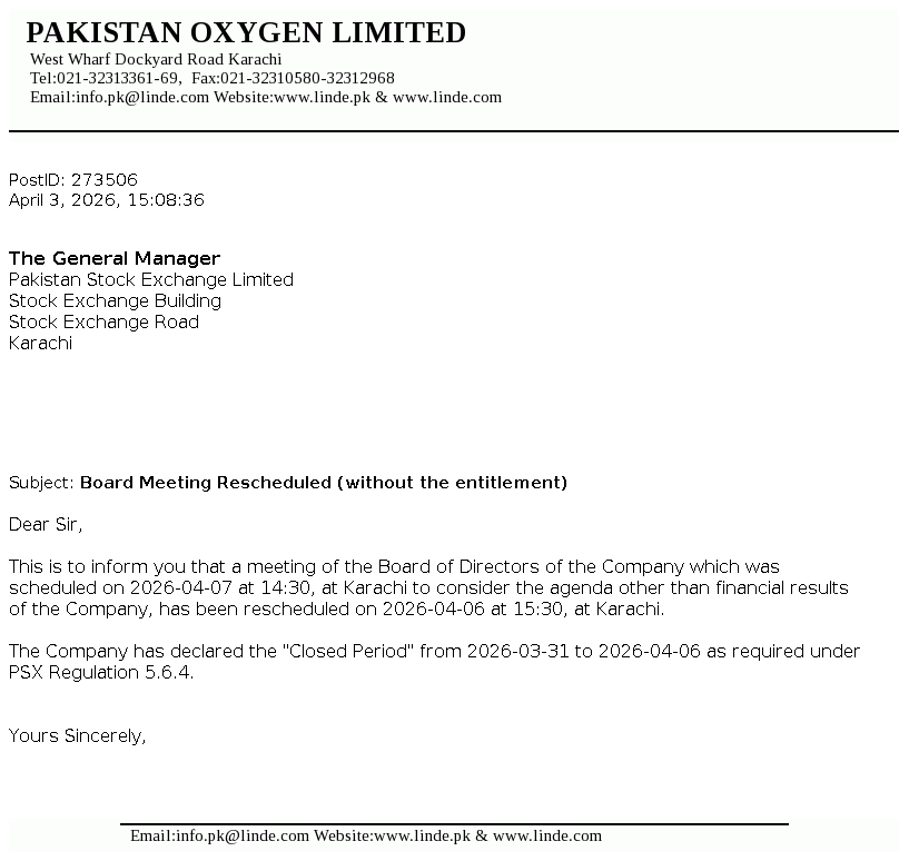 Pakistan Oxygen Limited was incorporated in Pakistan under the repealed Companies Act, 1913 (now Companies Act, 2017), as a private limited company in 1949 and converted into a public limited company in 1958. The Company is principally engaged in the manufacturing of industrial and medical gases, welding electrodes and marketing of medical equipment.