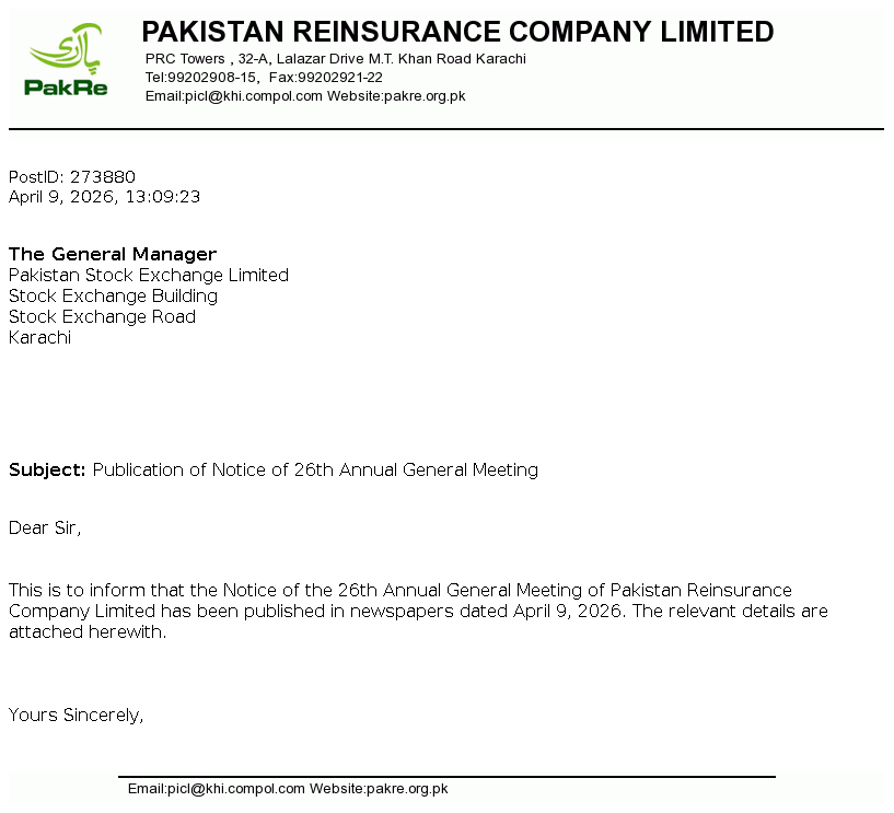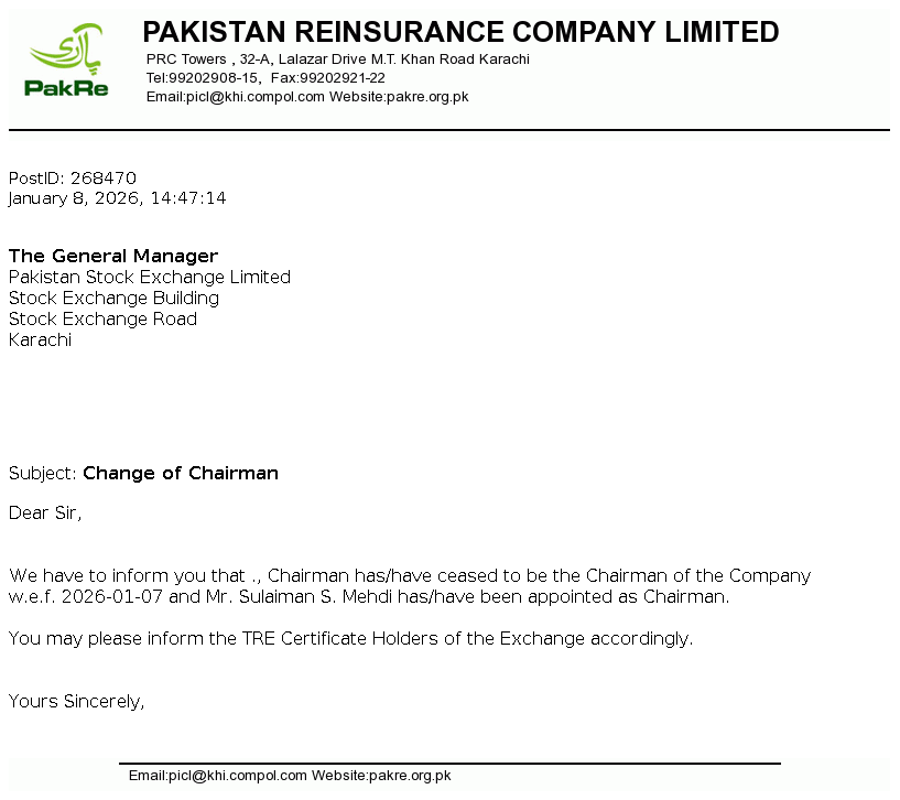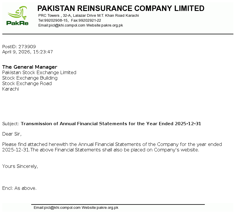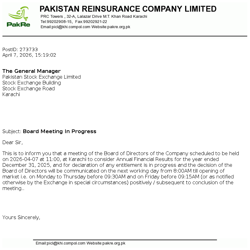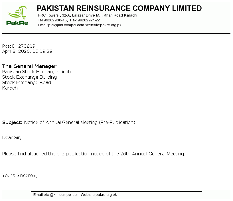 Pakistan Reinsurance Company Limited was incorporated in Pakistan as a public limited company on March 30, 2000. The Company is engaged in providing of reinsurance and other insurance business.