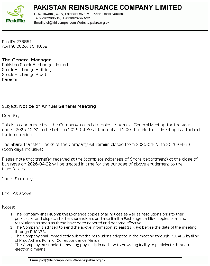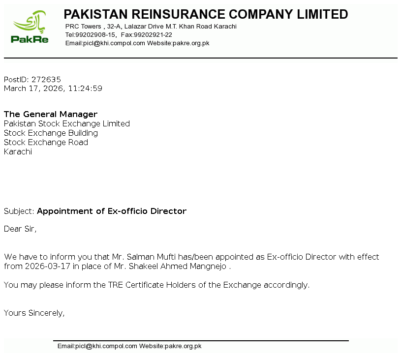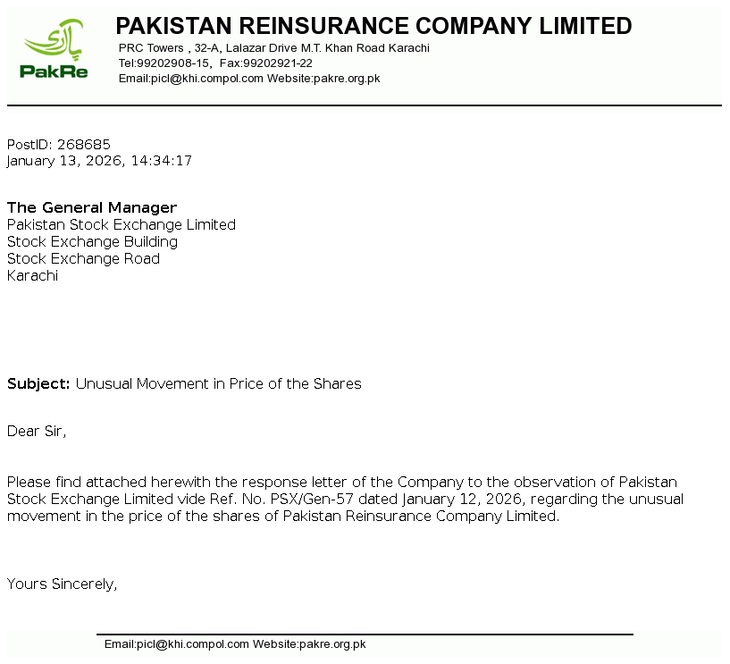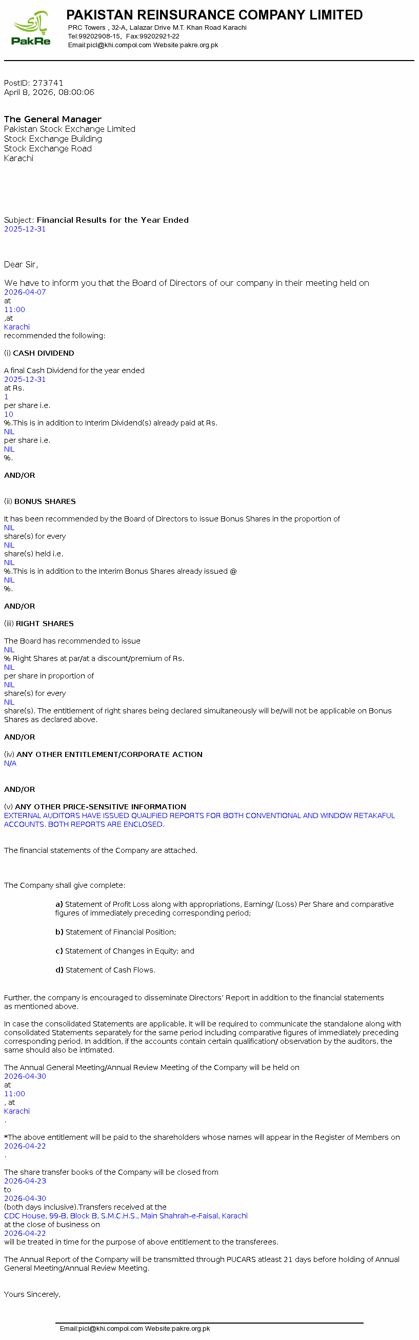 Pakistan Reinsurance Company Limited was incorporated in Pakistan as a public limited company on March 30, 2000. The Company is engaged in providing of reinsurance and other insurance business.