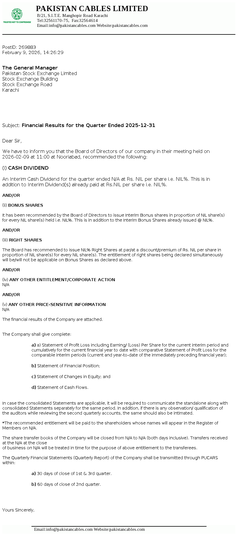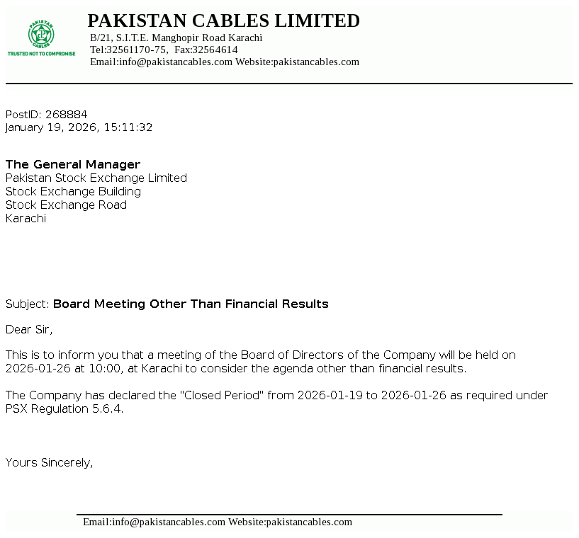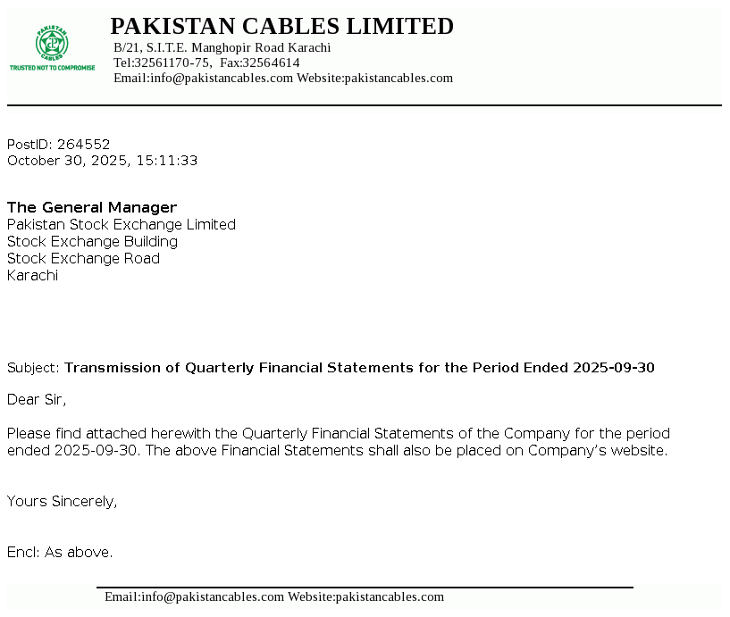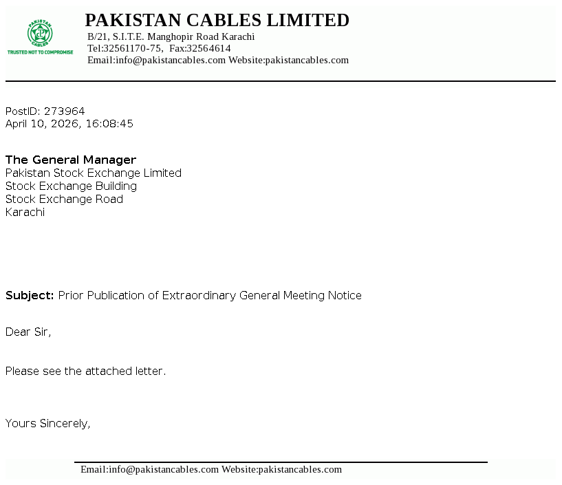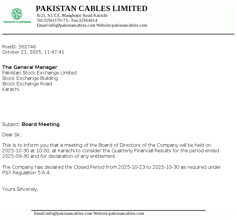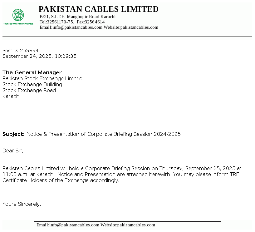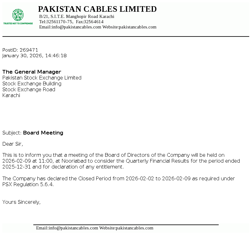 Pakistan Cables Limited was incorporated in Pakistan as a private limited Company on 22 April 1953 and in 1955 it was converted into a public limited Company. The Company is engaged in the manufacturing of copper rods, wires, cables and conductors, aluminium extrusion profiles and PVC compounds.