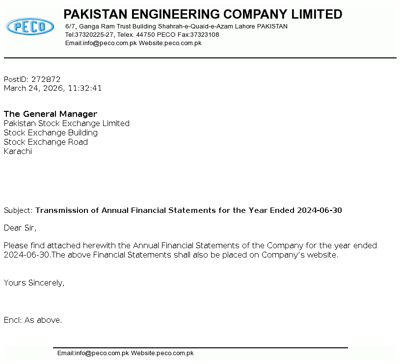 Pakistan Engineering Company Limited is principally engaged in the manufacturing and sale of engineering products. The major products of the company are electricity transmission and communication towers, electric motors, pumps and steel rolled products etc.