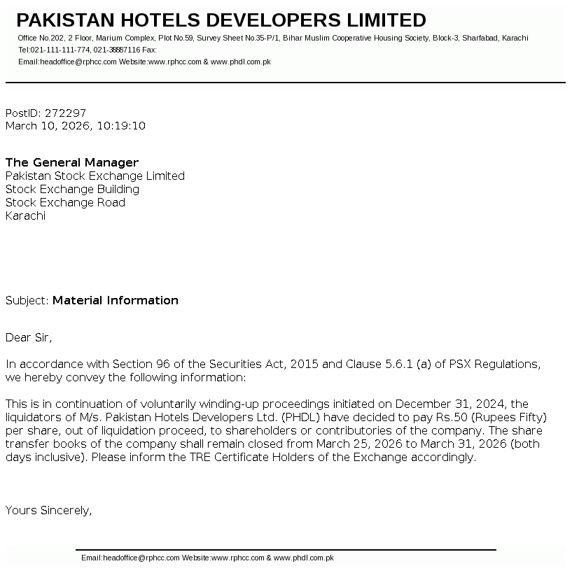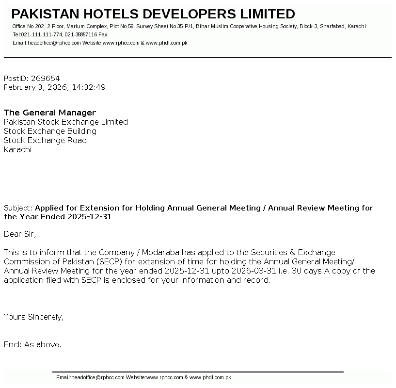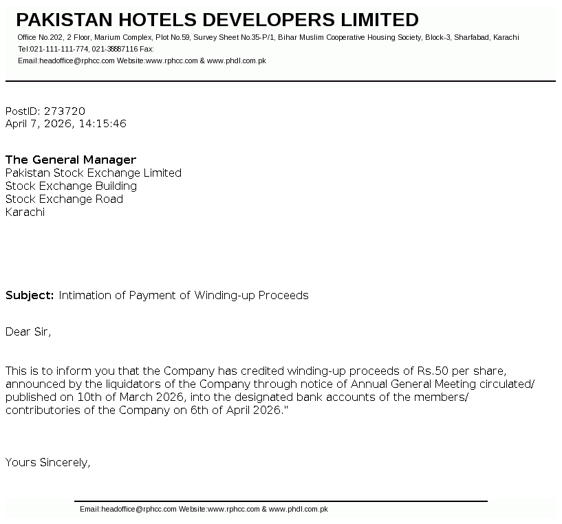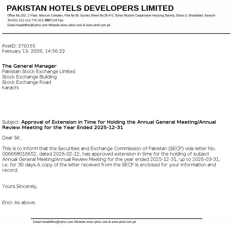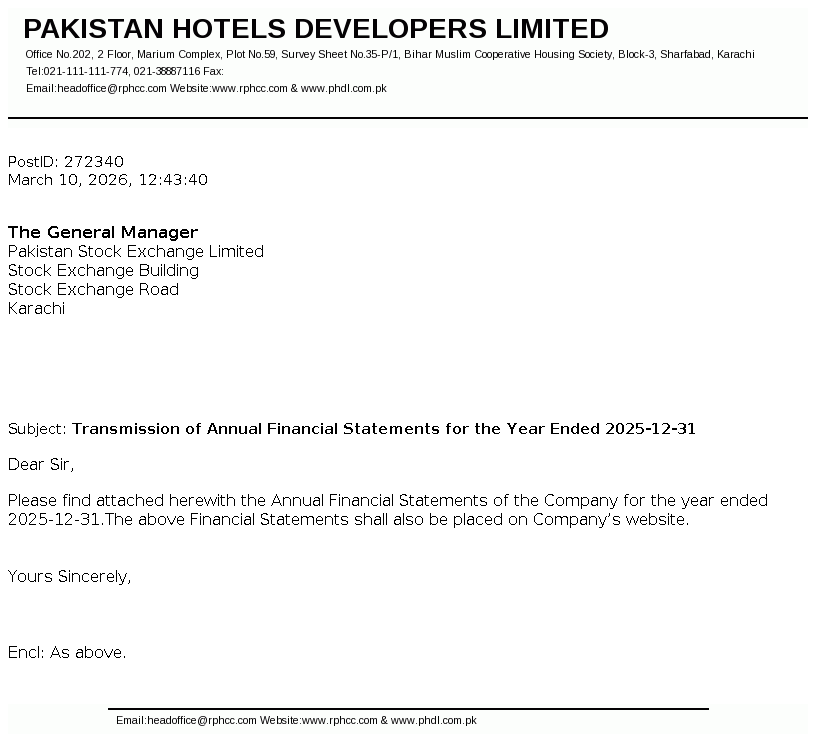 Pakistan Hotels Developers Limited was incorporated and domiciled in 1979 at Karachi, Pakistan under the Companies Act, 1913 (now Companies Act, 2017) as a private limited company and converted into a public limited company in 1981.The company is principally engaged in hotel business and owns and operates a Five Star Hotel known as Regent Plaza Hotel and Convention Centre, Karachi.