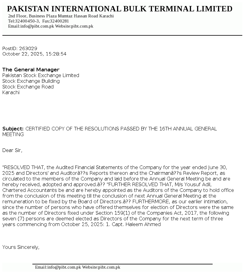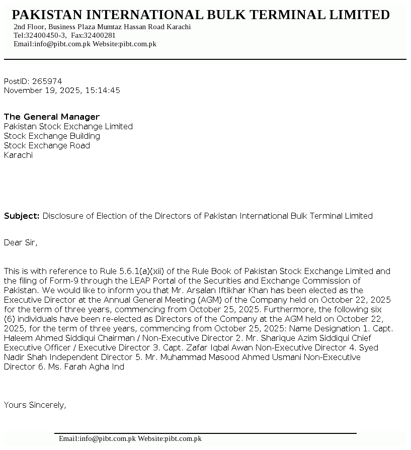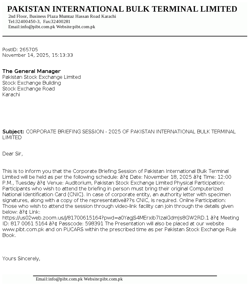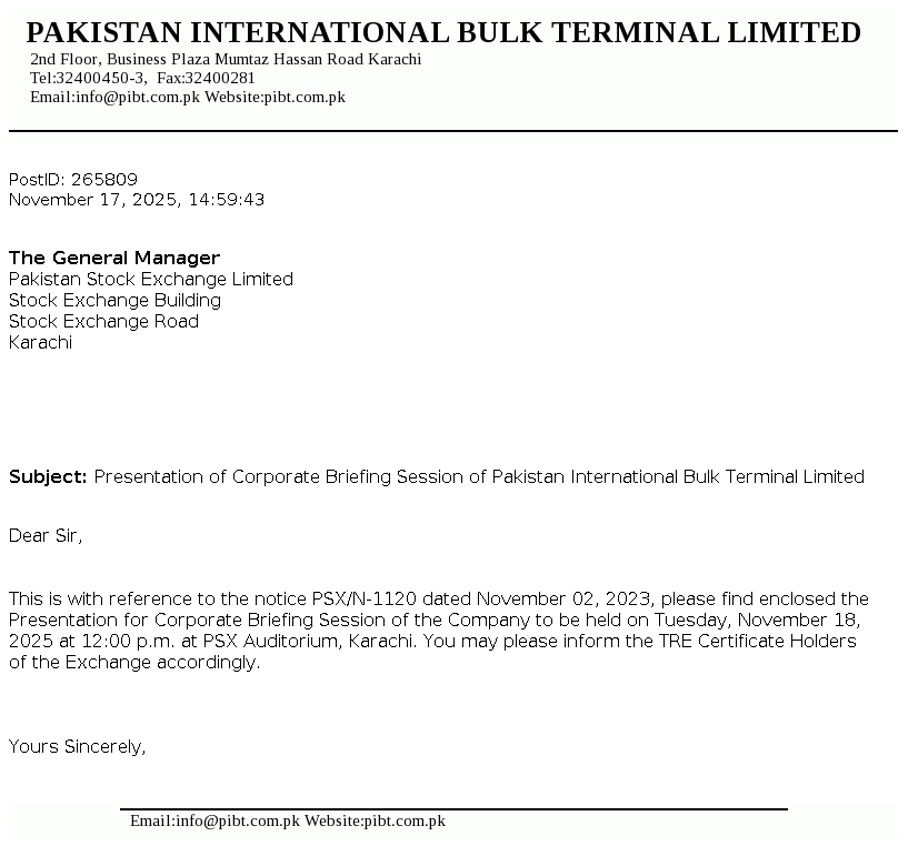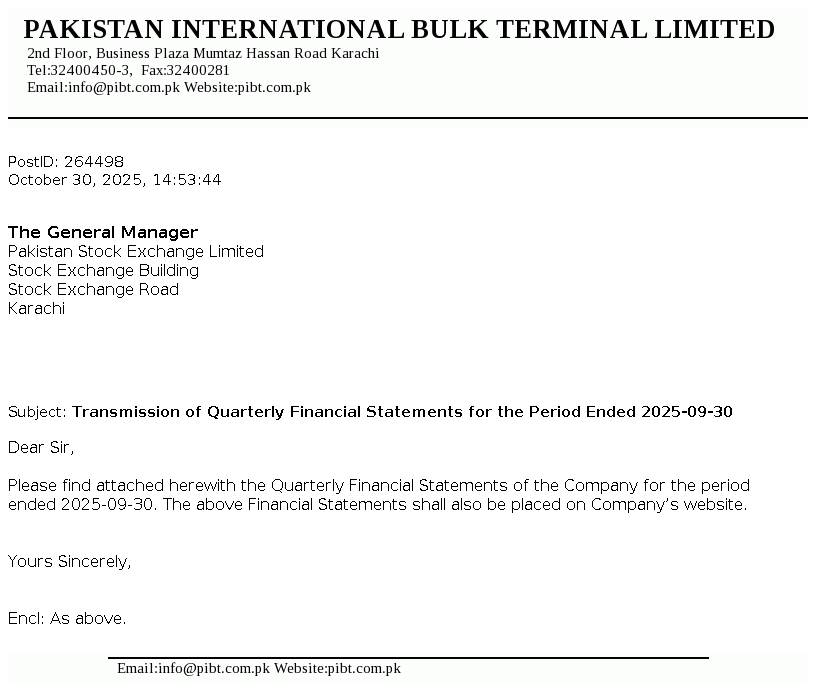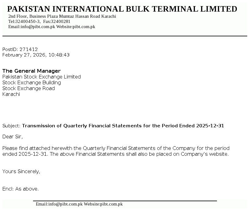 Pakistan International Bulk Terminal Limited was incorporated under the repealed Companies Ordinance, 1984 (now the Companies Act, 2017) on March 22, 2010 as a private limited company. The Company has entered into a Built Operate Transfer (BOT) contract with Port Qasim Authority (PQA) on November 06, 2010 for the construction, development, operations and management of coal and clinker/cement terminal at Port Mohammad Bin Qasim for thirty years. After the expiry date, the Company will transfer all the concession assets to PQA