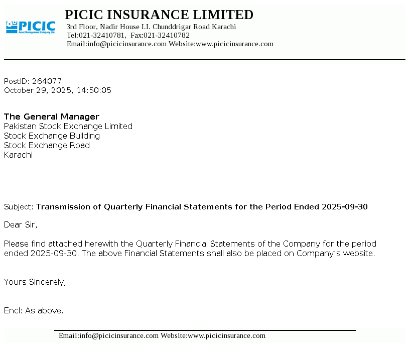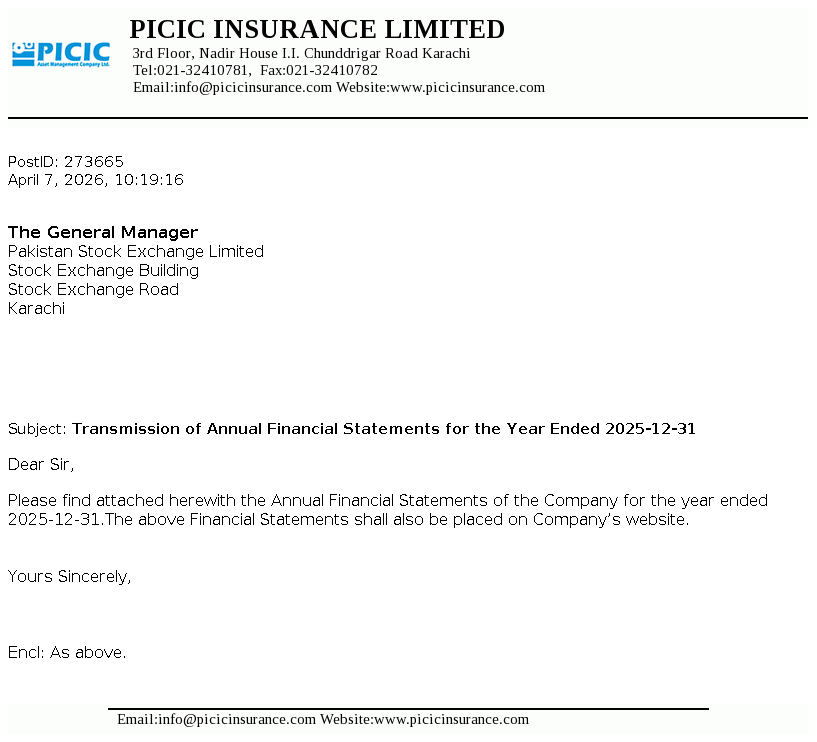 PICIC Insurance Limited was incorporated on April 23, 2004 as a public limited Company under the repealed Companies Ordinance, 1984 (replaced by Companies Act 2017) and registered as a non-life insurance company by the Securities and Exchange Commission of Pakistan (SECP) under the Insurance Ordinance, 2000. It is engaged in providing all classes of non-life insurance business.