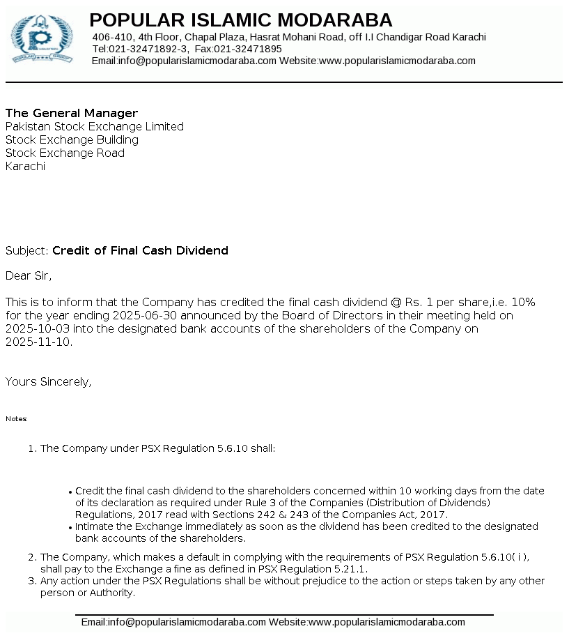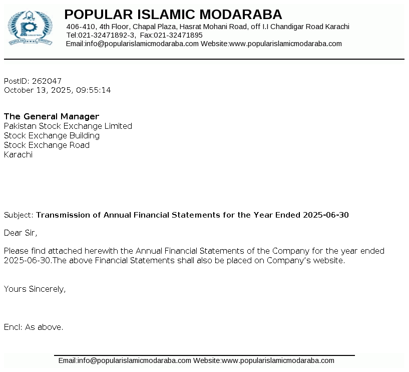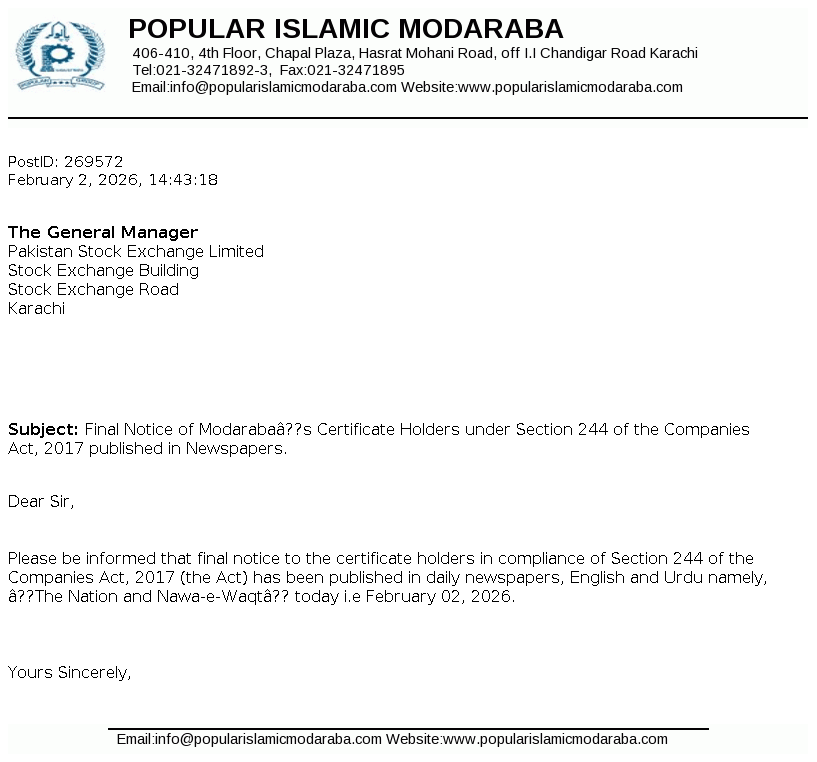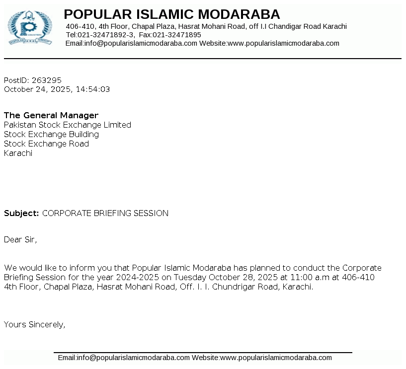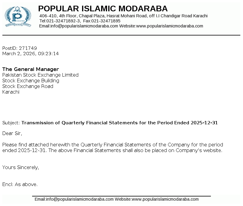 Popular Islamic Modaraba is a multipurpose, perpetual Modaraba formed under the Modaraba and Modaraba(floatation and control) Ordinance, 1980 and the rules framed there under and is managed by the Popular IslamicModaraba Management Company (Private) Limited, under the repealedCompanies Ordinance, 1984 (now Companies Act, 2017). The Modaraba is engaged in various Islamic modes of financing and business including Ijarah, Musharaka,Murabaha and Diminishing Musharaka arrangements.