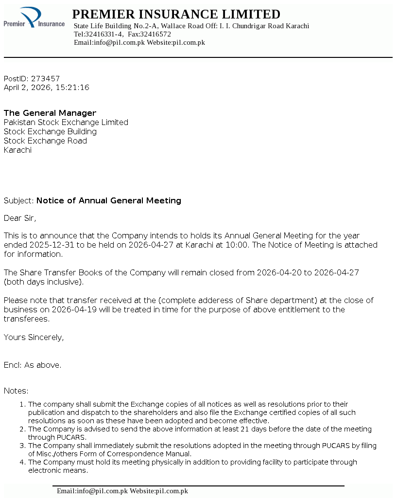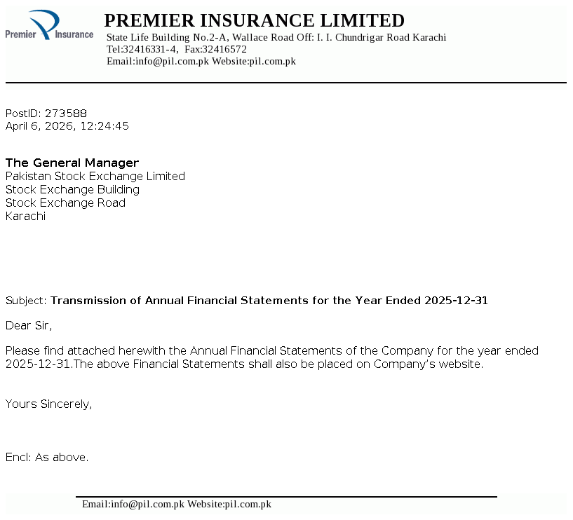 Premier Insurance Limited was incorporated as a public limited Company in Pakistan in May 1952 and is engaged in general insurance business. The Company has been allowed to work as Window Takaful Operator since October 2, 2015 by Securities and Exchange Commission of Pakistan (SECP) under SECP Takaful Rules, 2012 to carry on General Window Takaful Operations in Pakistan.