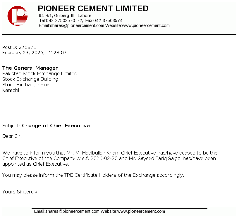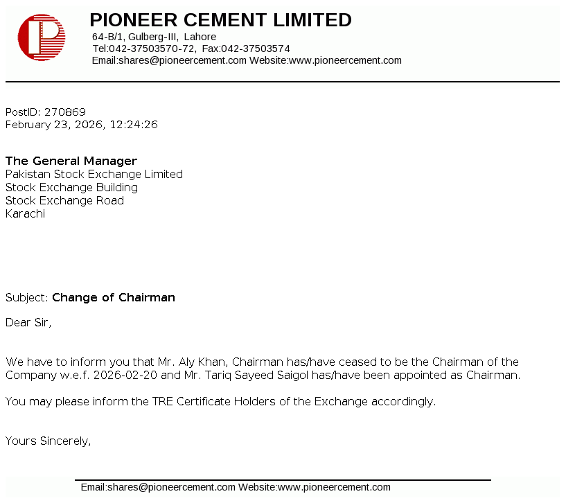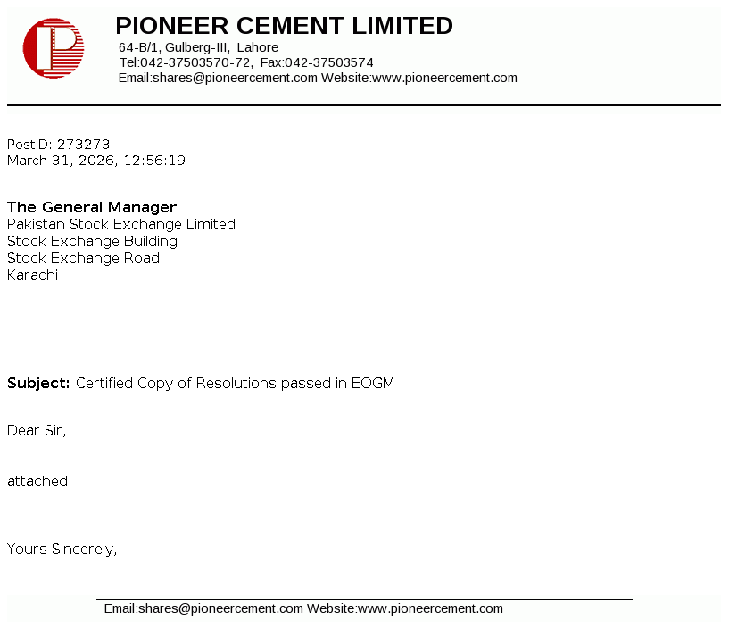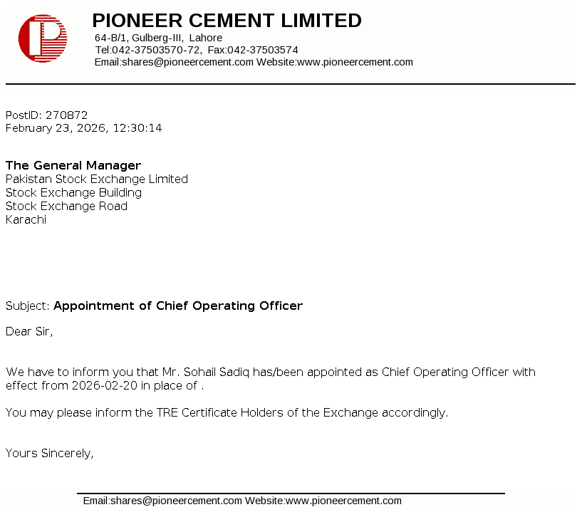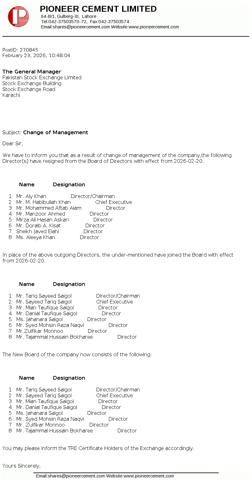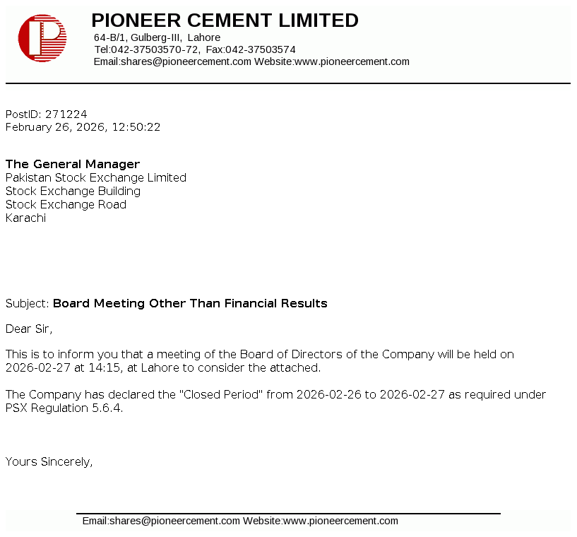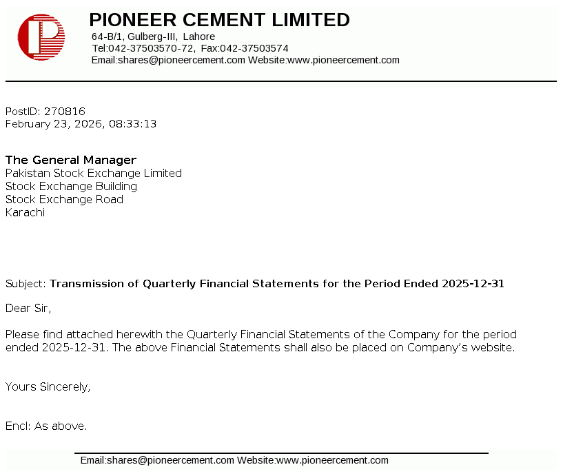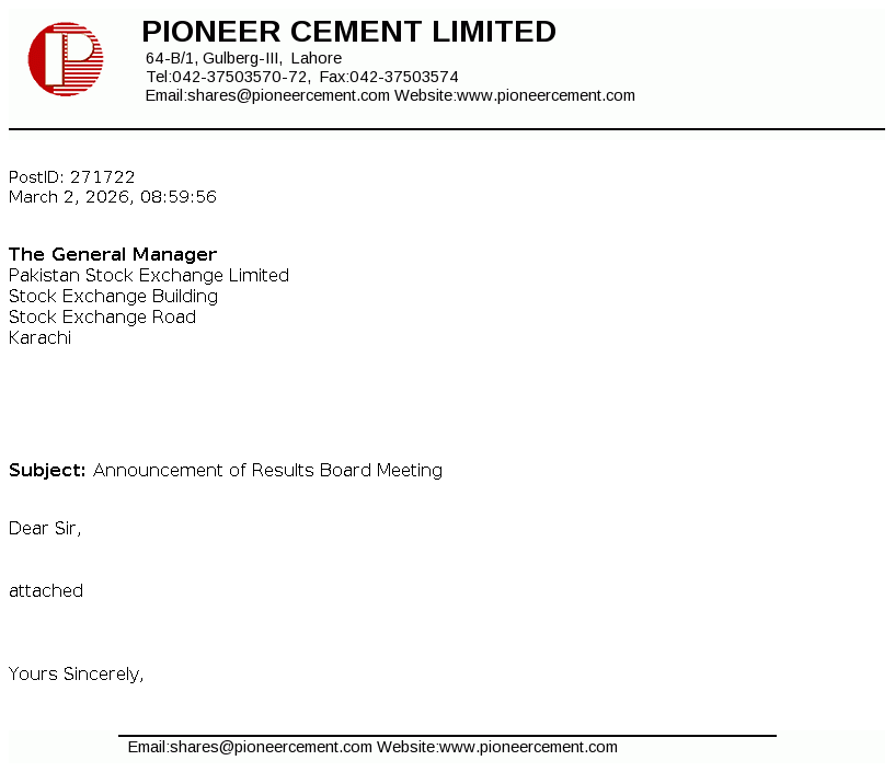 Pioneer Cement Limited was incorporated in Pakistan as a public company limited by shares on 09 February 1986. The principal activity of the Company is manufacturing and sale of cement.