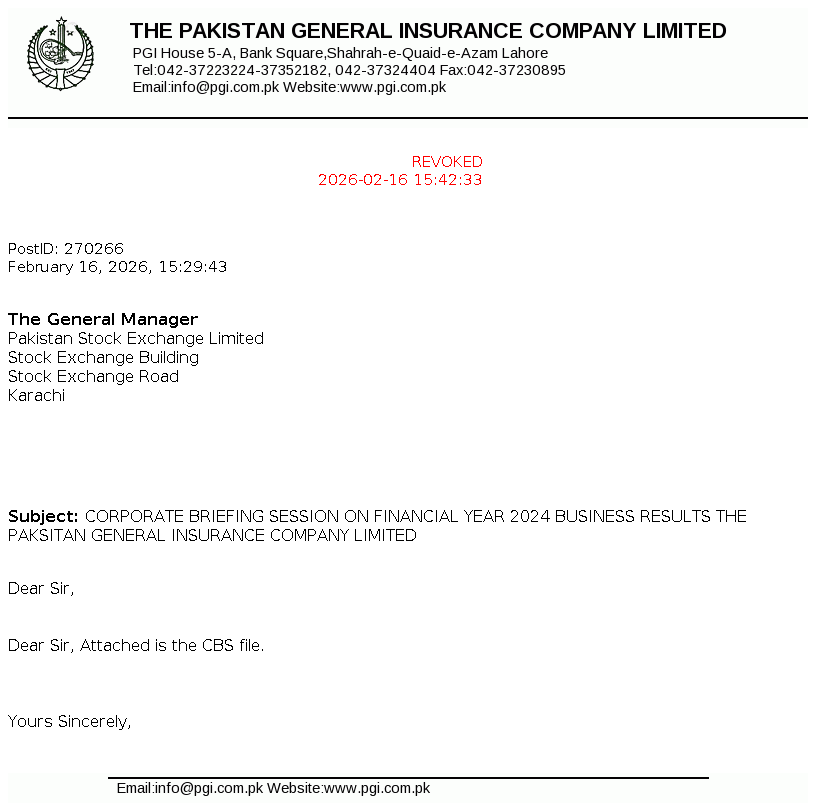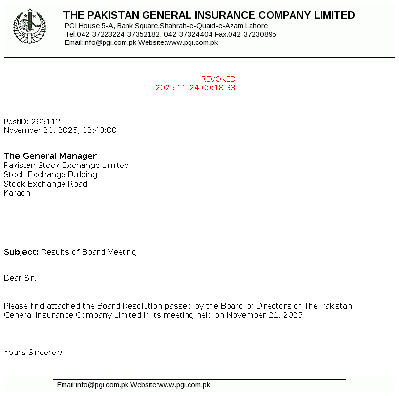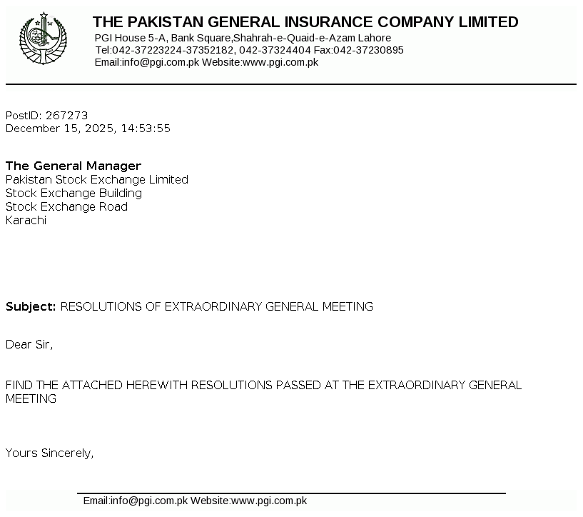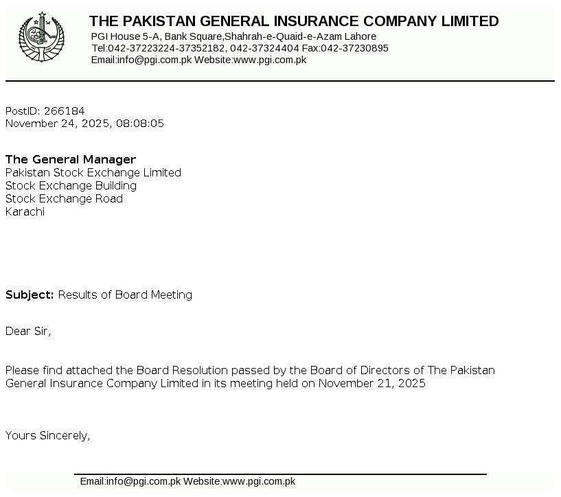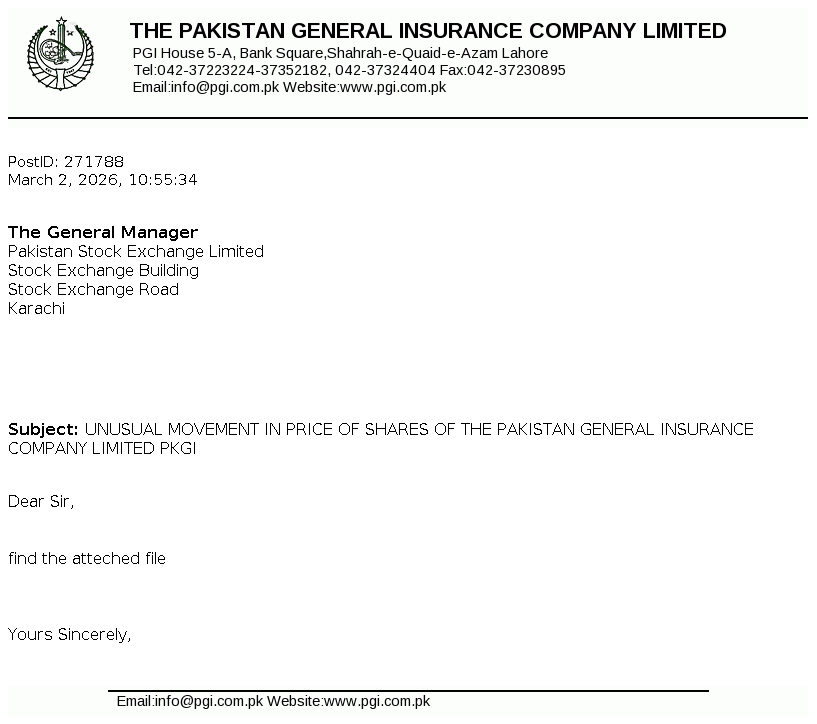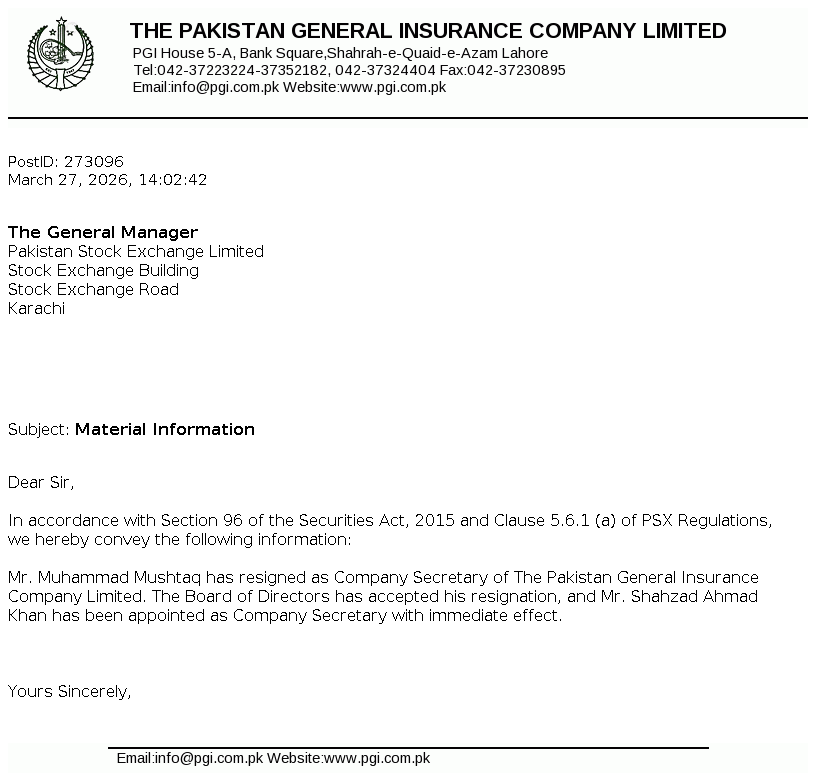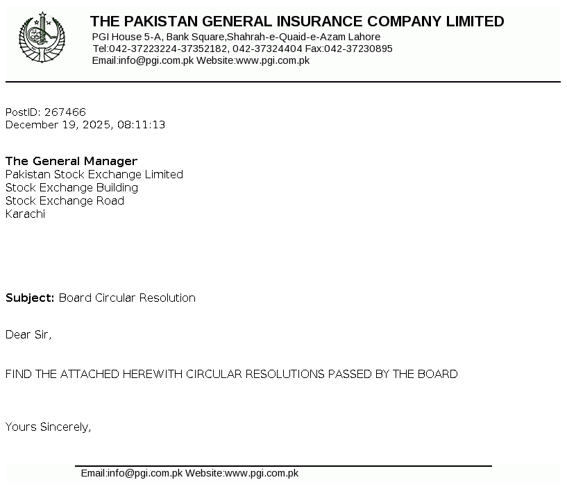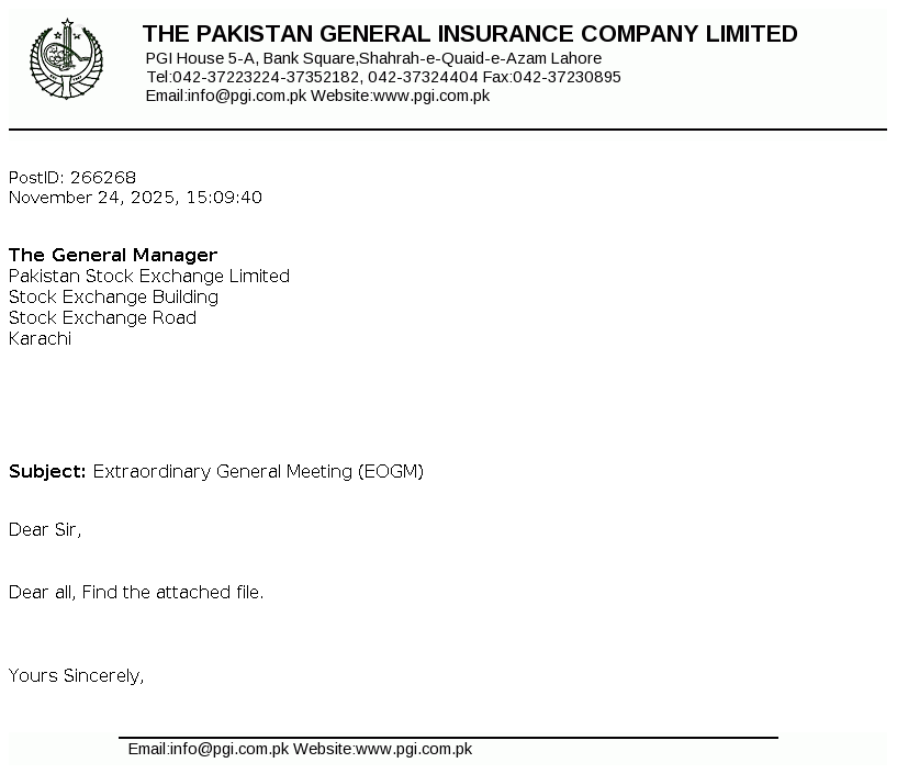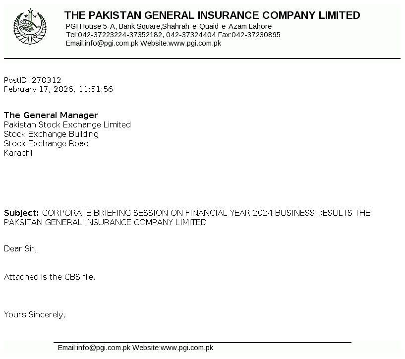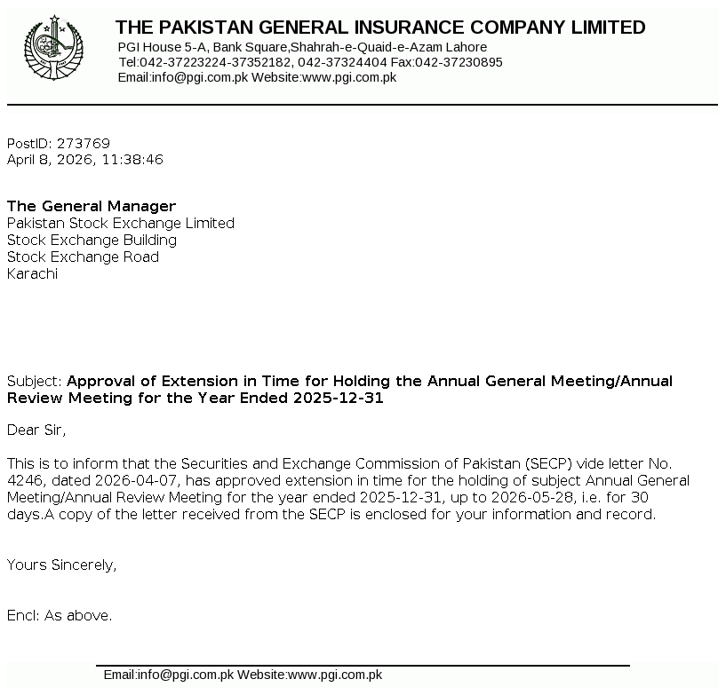 The Pakistan General Insurance Company Limited was incorporated in Pakistan as a public limited company on July 26, 1947 under the Companies Act, 1913 (now the Companies Act, 2017). The Company is engaged in providing general insurance services in spheres of Fire and property damage; Marine, aviation and transport, Motor and Miscellaneous.